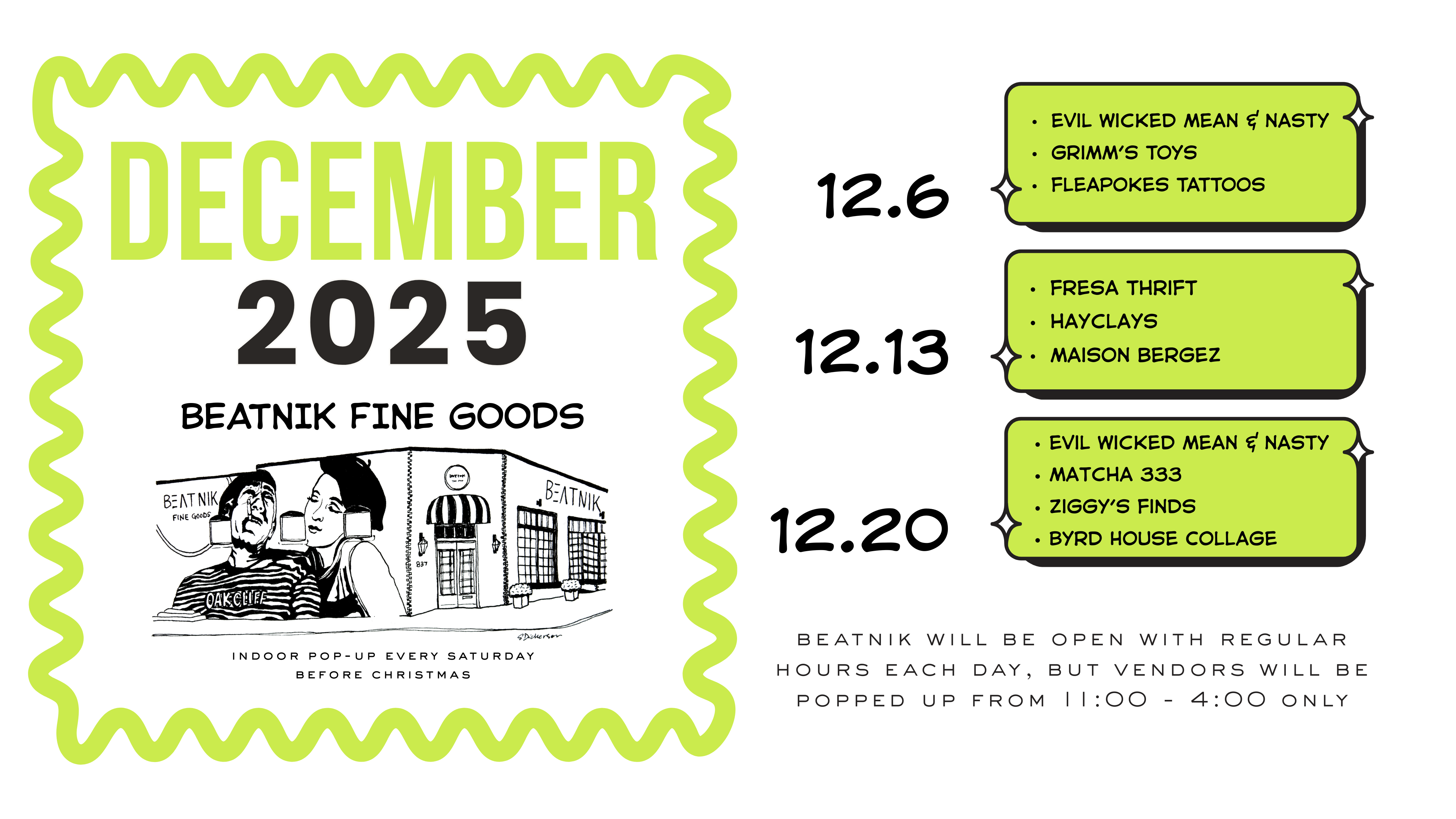 Have a question about your order? Email us at beatnikfinegoods@gmail.com or give us a call at 214-238-6389 during business hours, and we will be happy to assist!