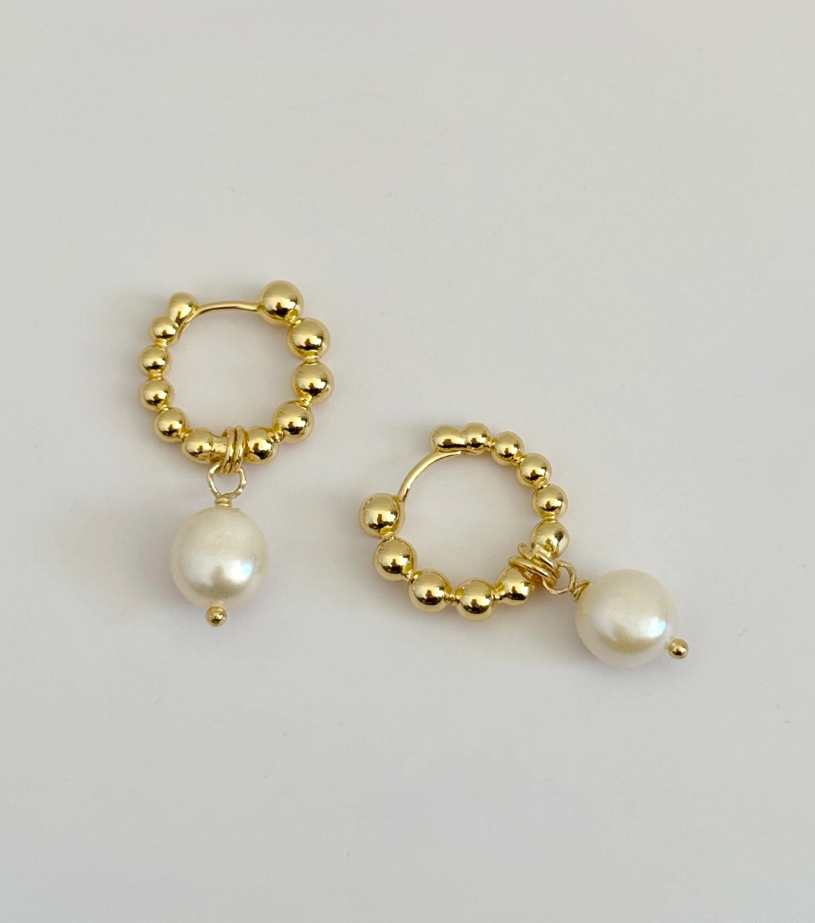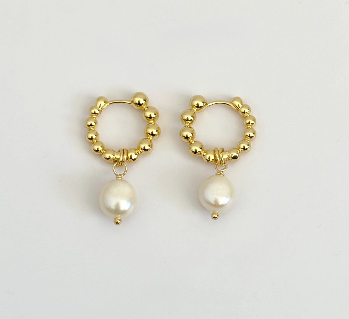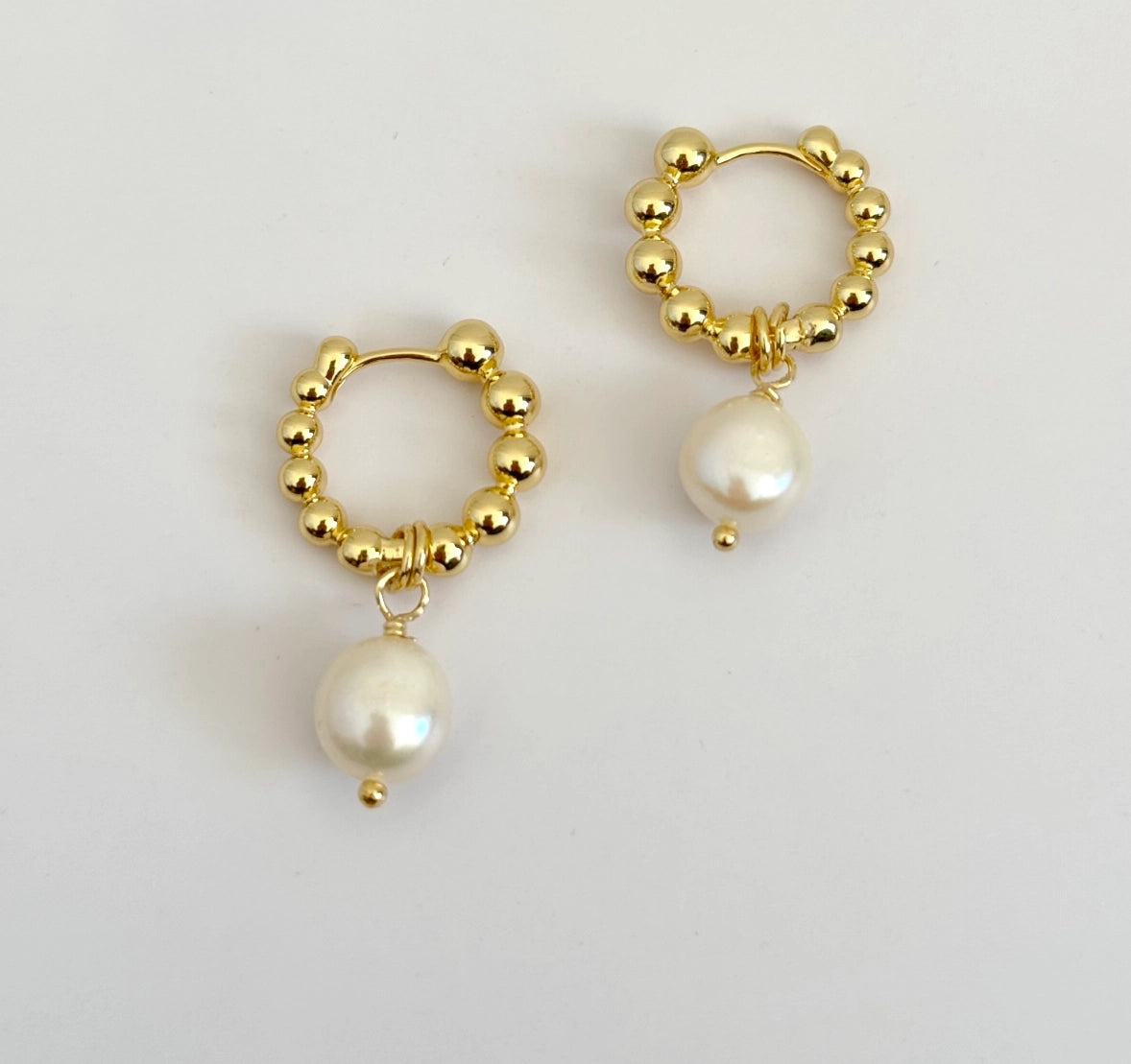 18K Gold Plated over brass bubble ball hoop earrings featuring freshwater pearl charm