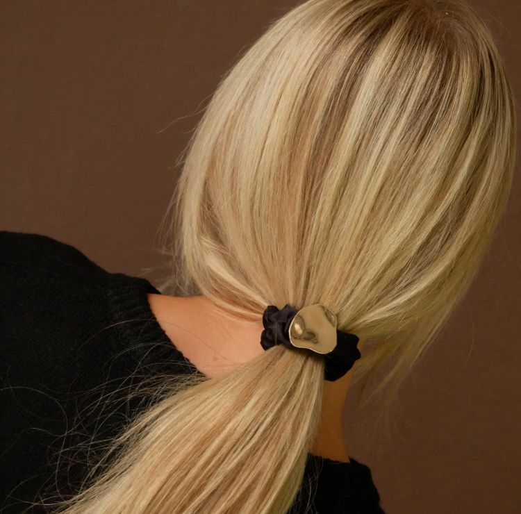 This hair tie will be the best addition to your closet! Made with a black silky scrunchie featuring a pretty gold pendant, it will hold your hair tight and give it the cutest touch while still feeling so simple.