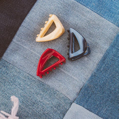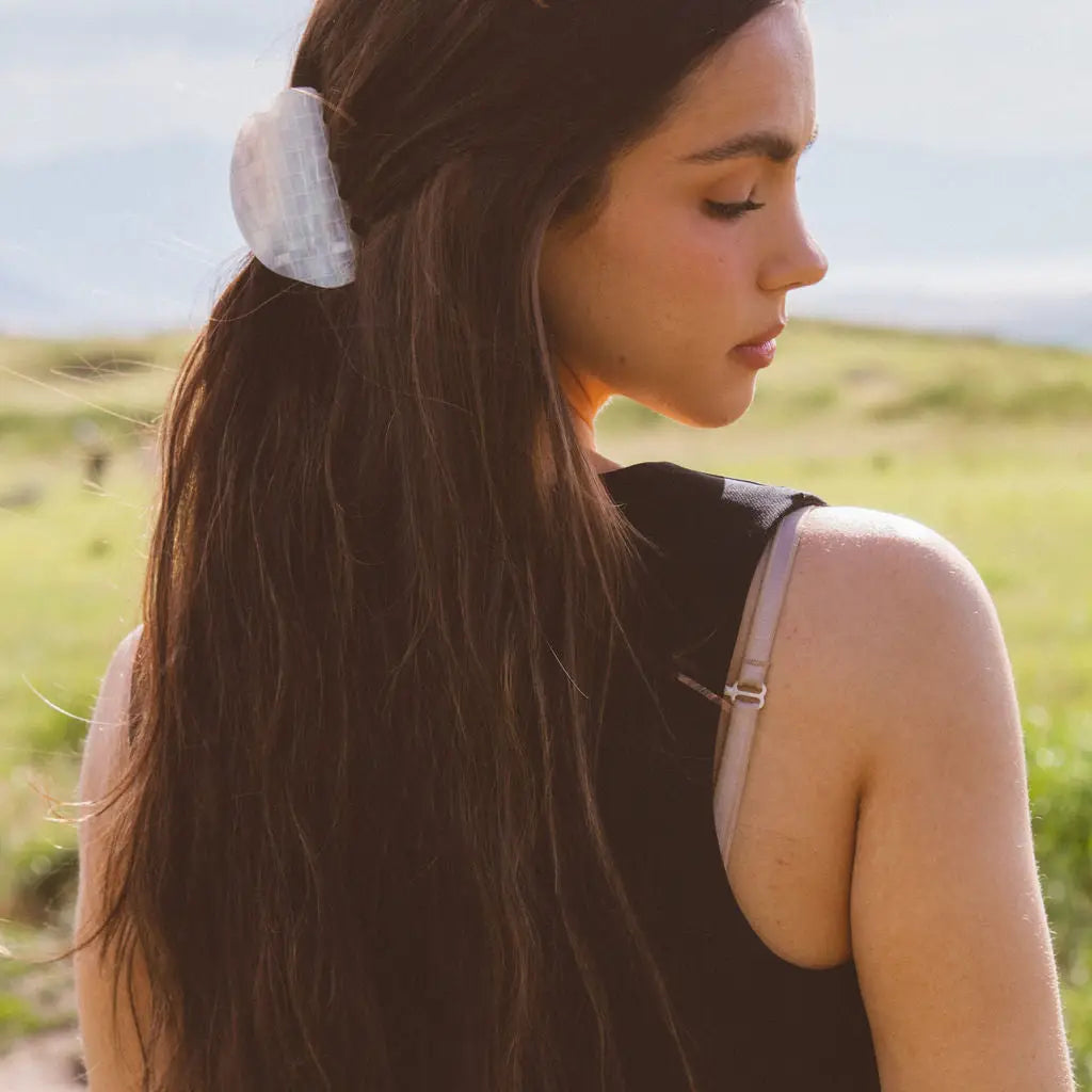 This darling half moon shaped claw clip is so perfect and festive for the 4th of July! It comes in the perfect pearly white, and an iridescent blue made in a high quality acetate material. The best way to elevate your updo for the day. This is a medium 3 inch claw clip.