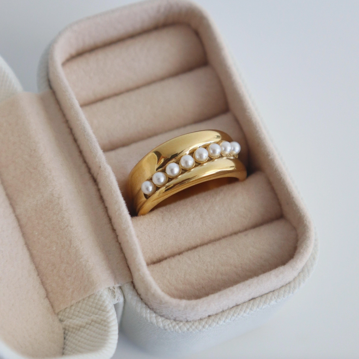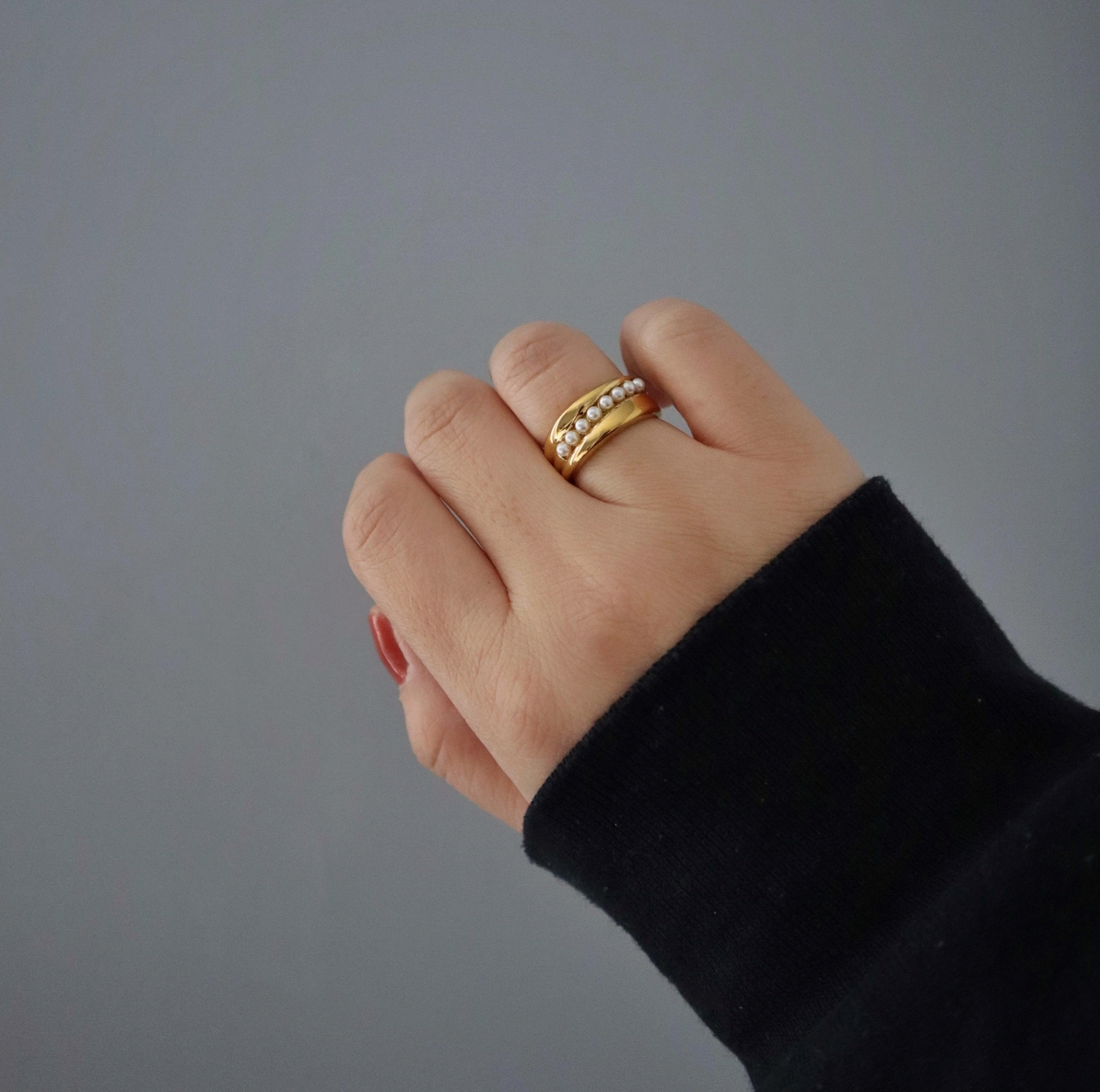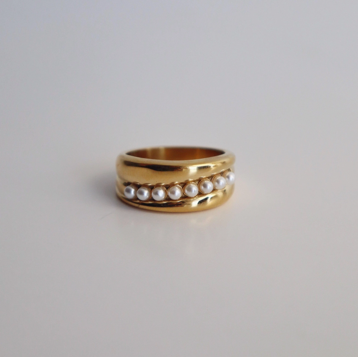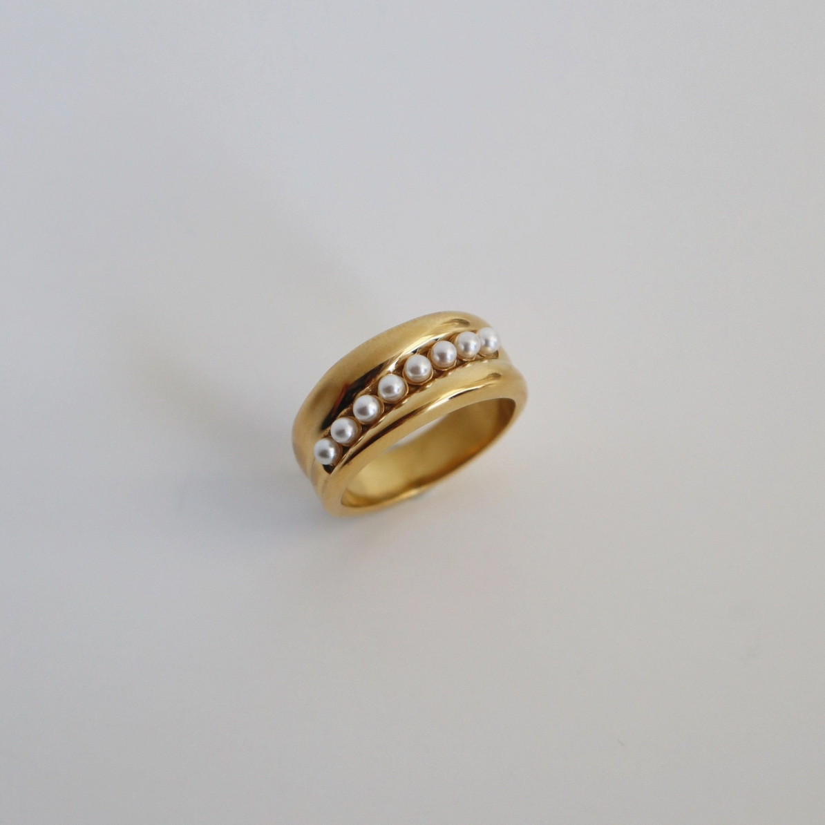 A must have for the modern woman, this chunky gold ring features a line of pearls, adding a touch of sophistication and elegance to your style. Make a statement with the Perla Ring, perfect for elevating any outfit.