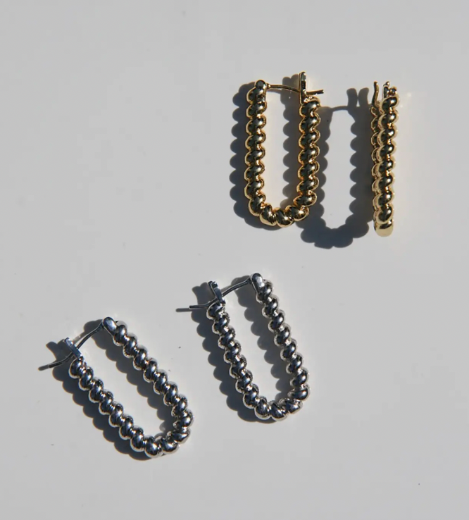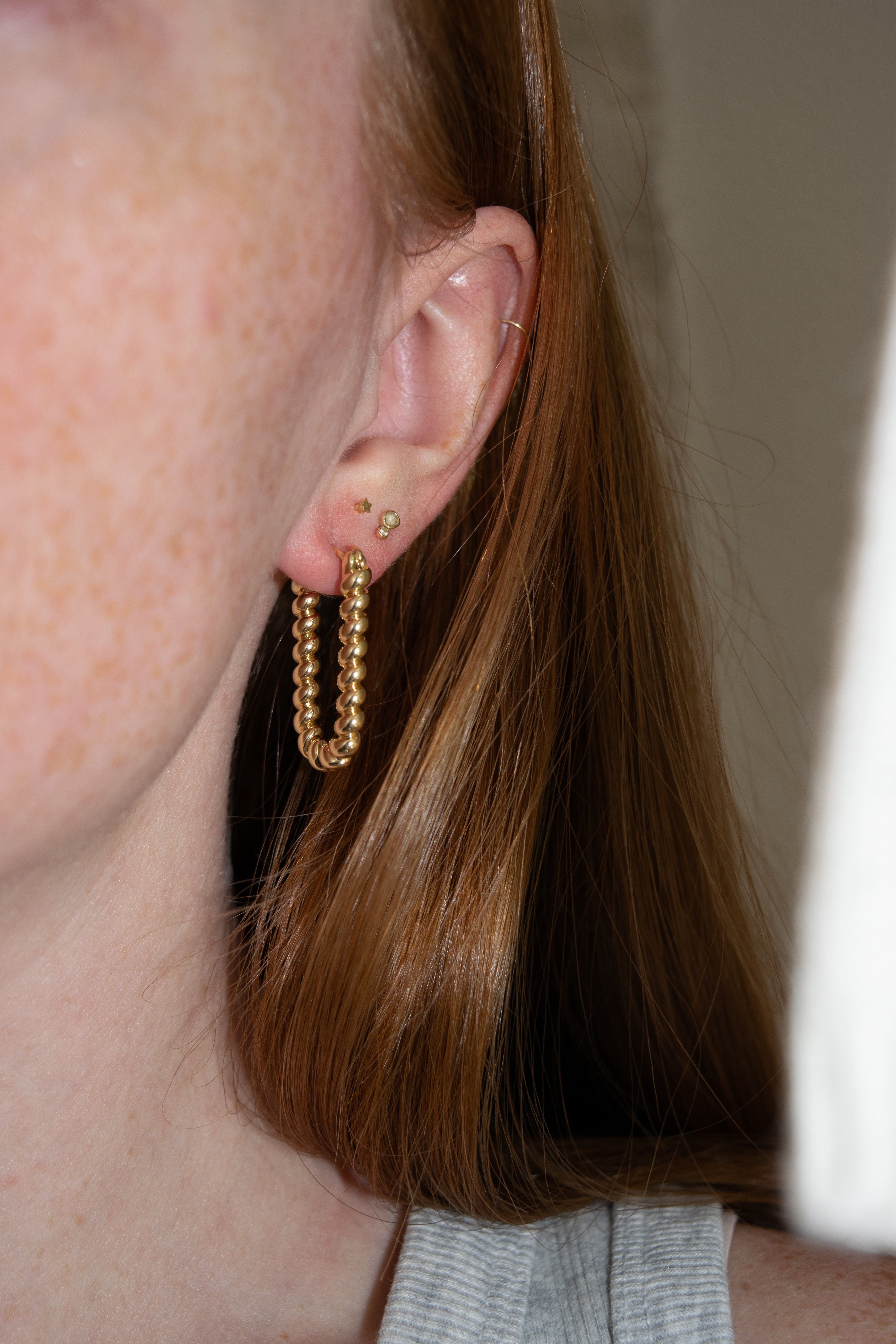 Elongated U shape hoops with a rope-like texture. Classic with a twist.