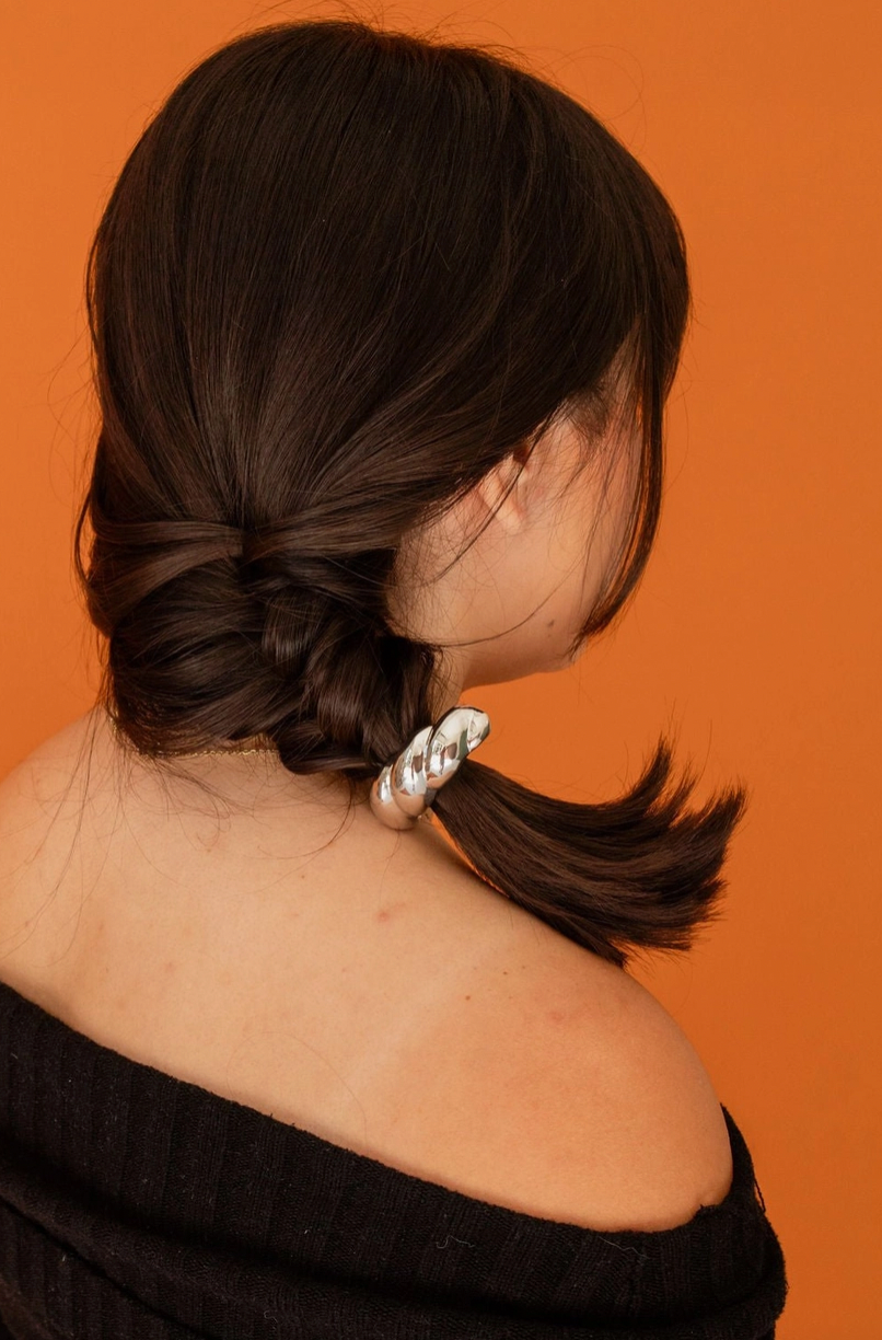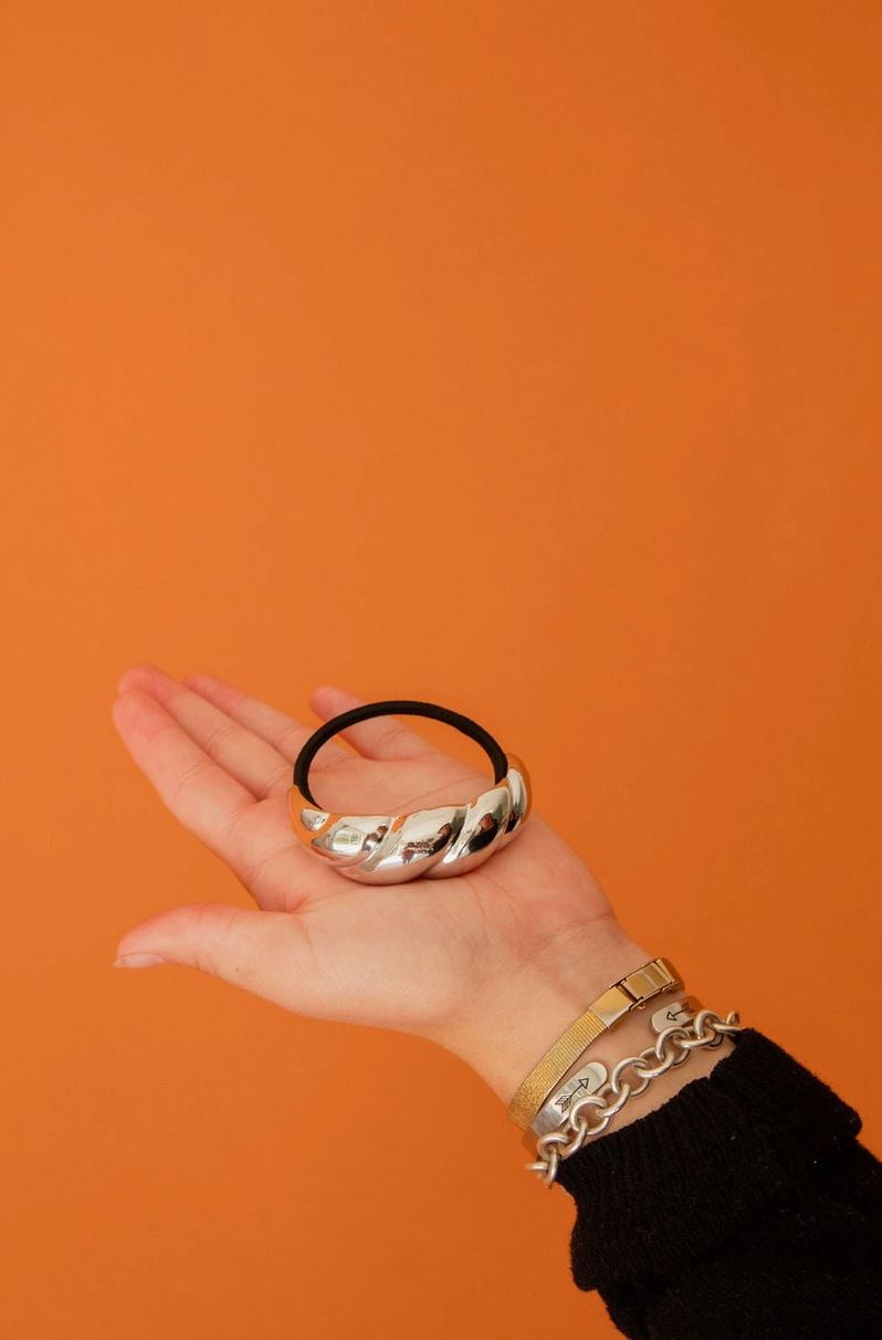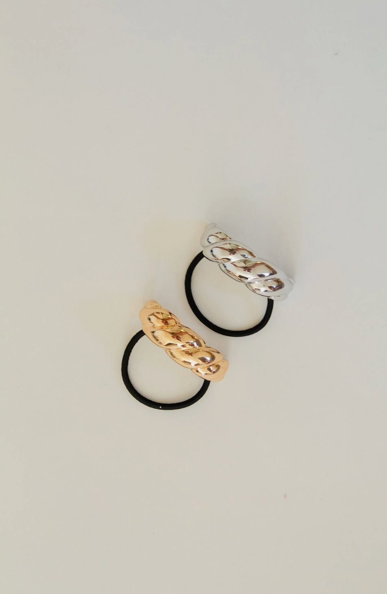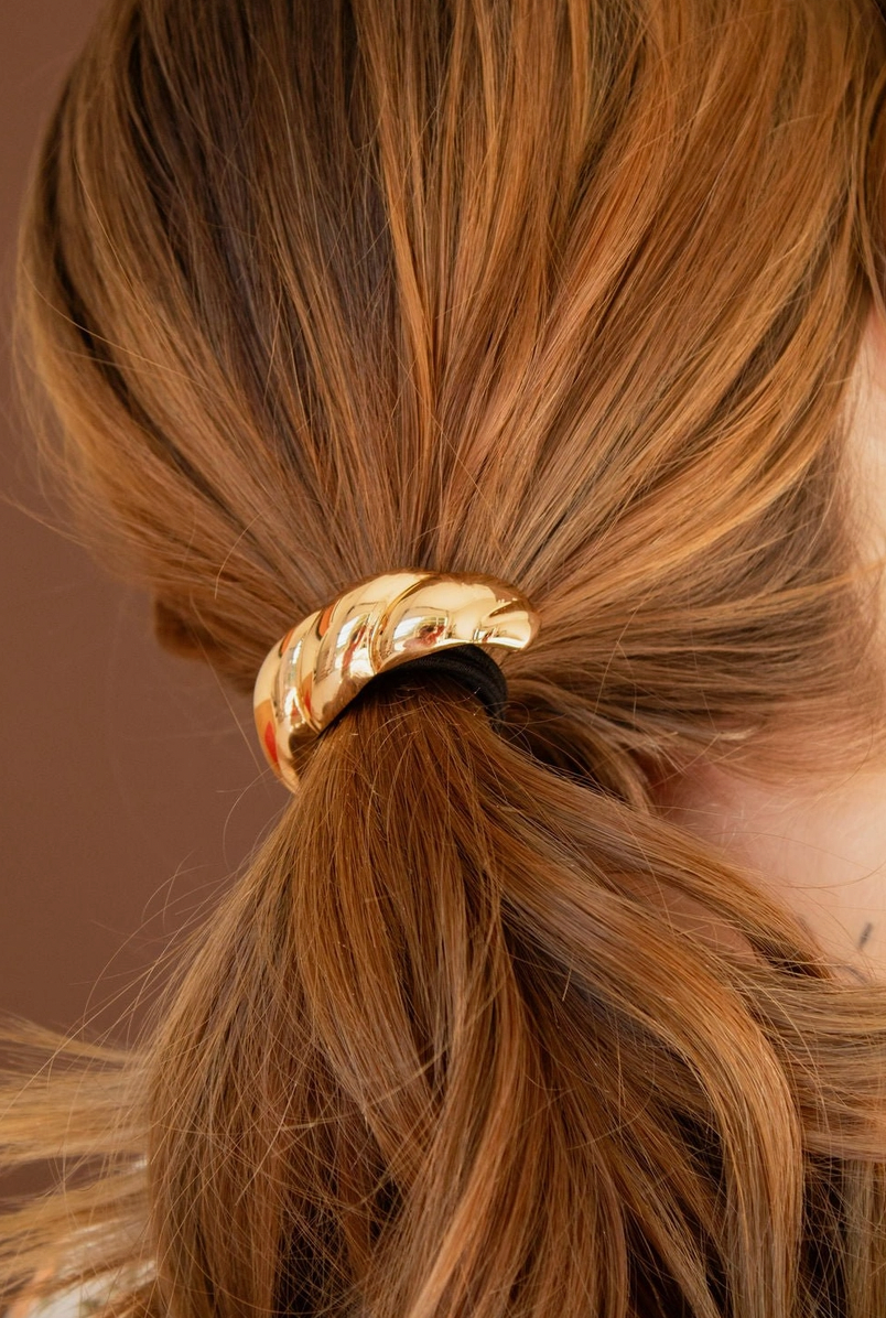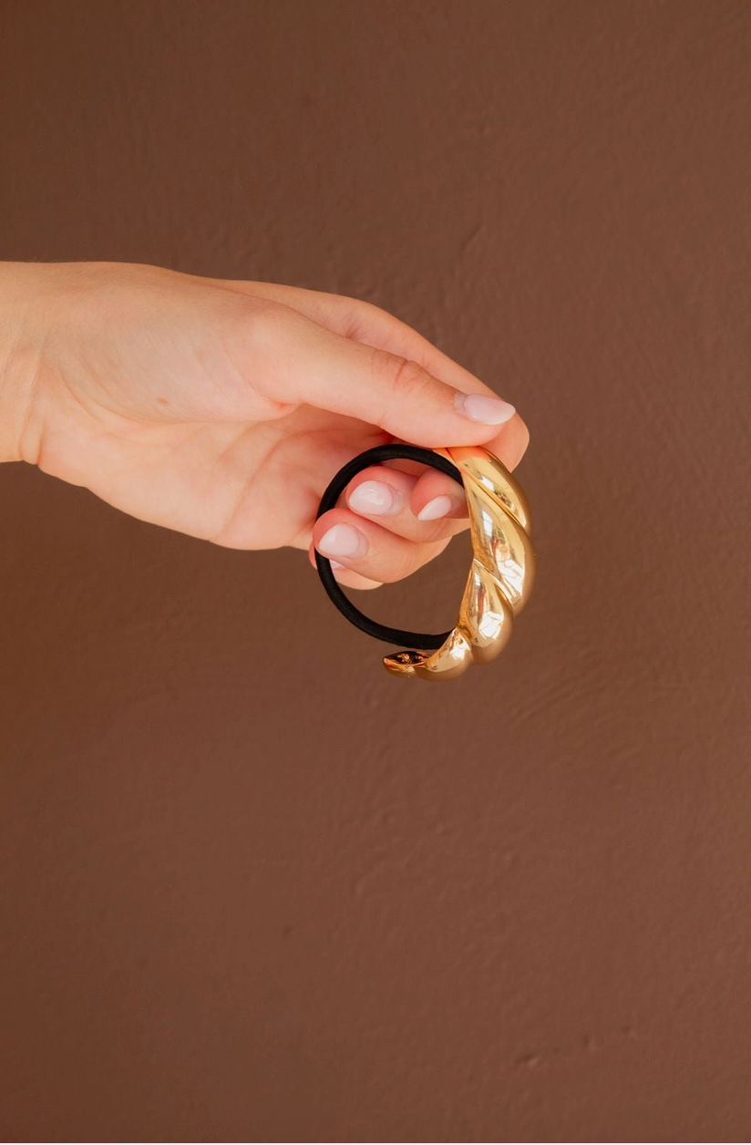 This hair tie will be the best addition to your closet! Made with a black elastic and a gold spiral metal brooch; It will hold your hair better than your average hair tie, and give it the cutest touch while still feeling so simple.