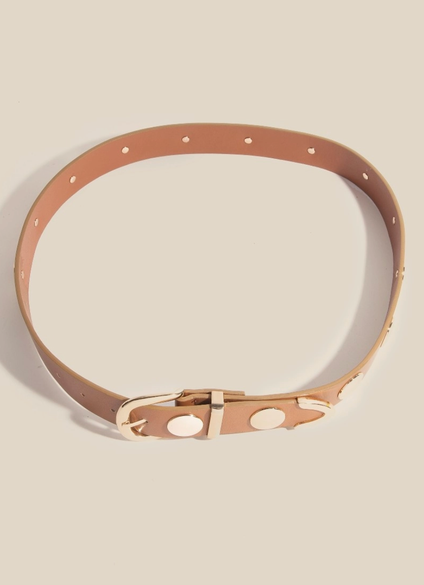 This is the perfect faux leather belt for any occasion faux leather belt radiates a sleek metallic disc studded design. Unleash the potential of your wardrobe with this versatile faux leather belt, ensuring a touch of elegance in every ensemble. Available in tan/gold.