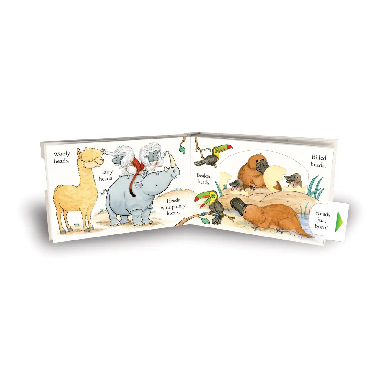 Eight ingenious pull tabs, seven pettable textures, and an astonishing fold-out finale deliver interactive surprises on every page as a cast of irresistible critters use their heads to demonstrate opposites, actions, and more!