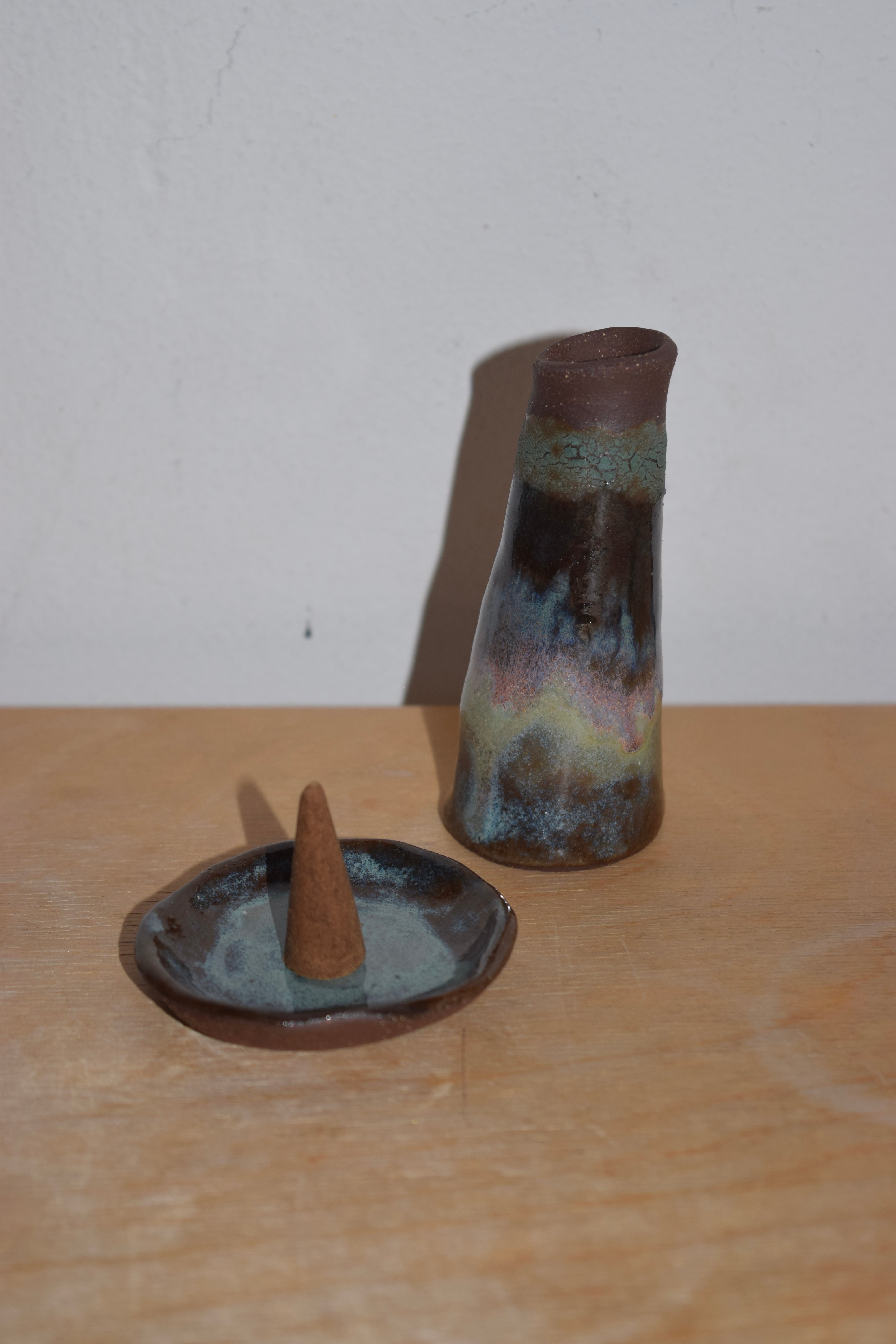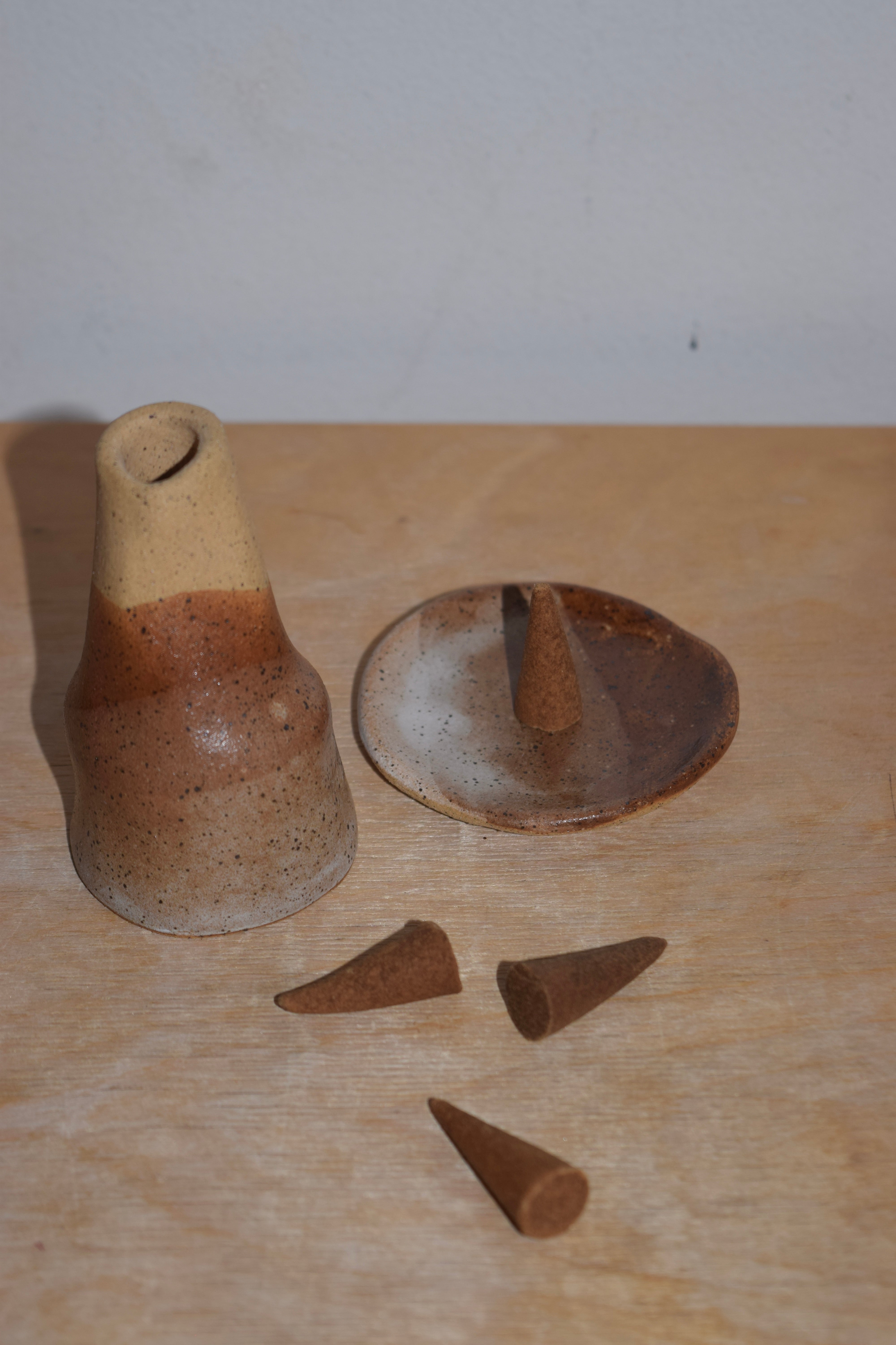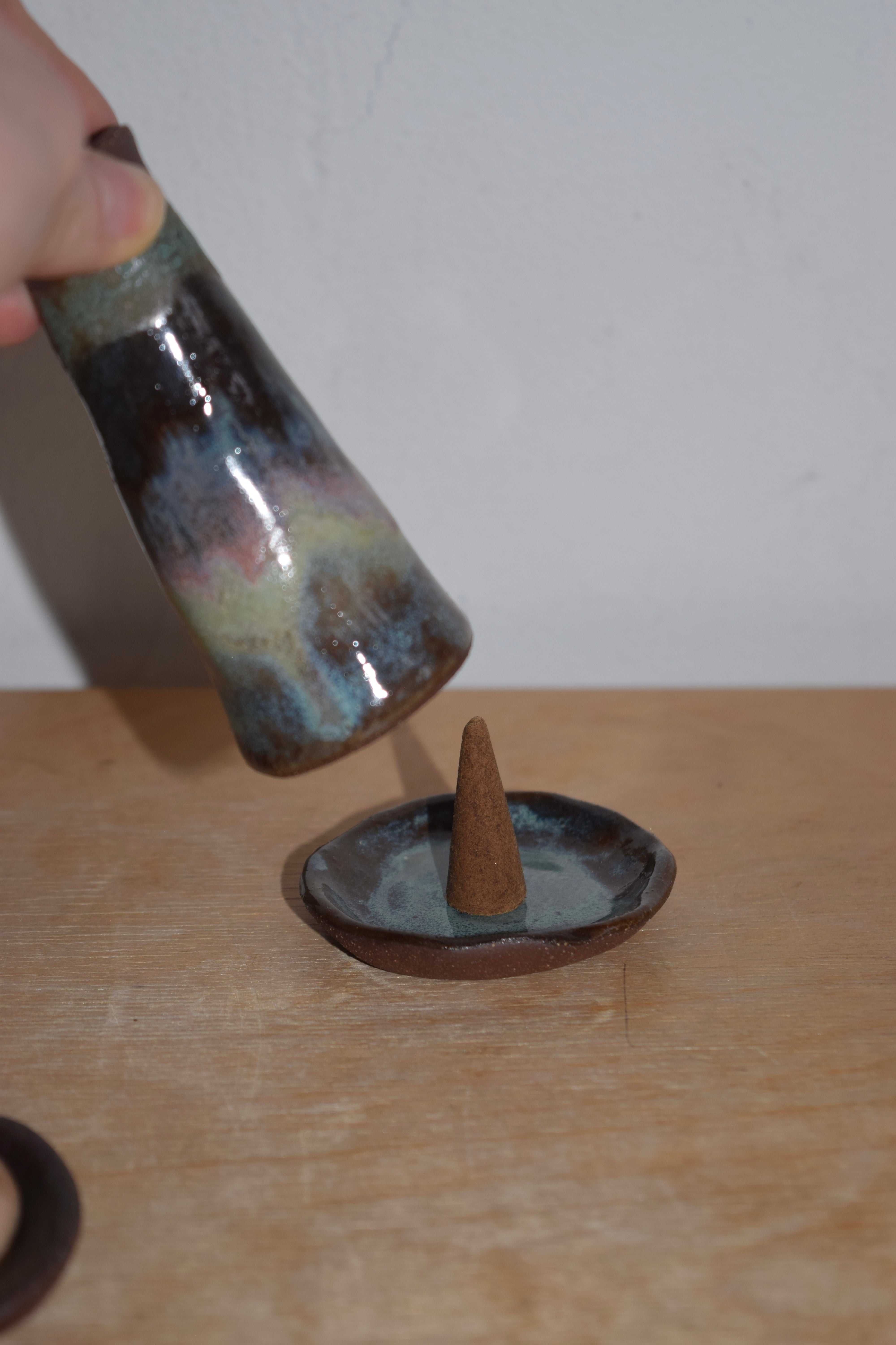 The Incense Cloche Towers are a fun way to burn incense cones. Each piece is handmade and unique in it's own way. These Cloches come in a two piece set. Featuring a small plate to sit an incense cone on, and a fluted tower that sits on top. These peice filter smoke out of the hole on top of tower.