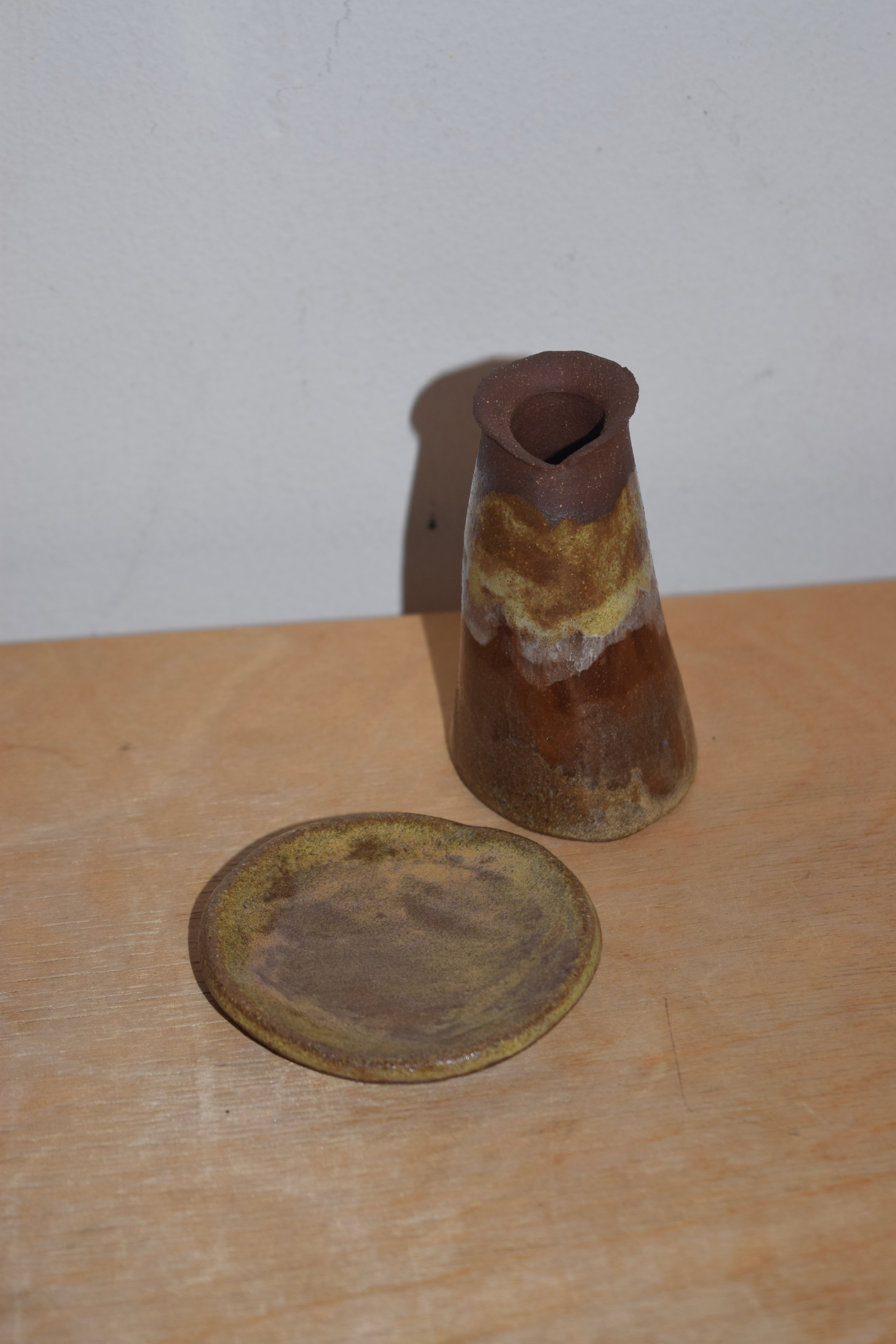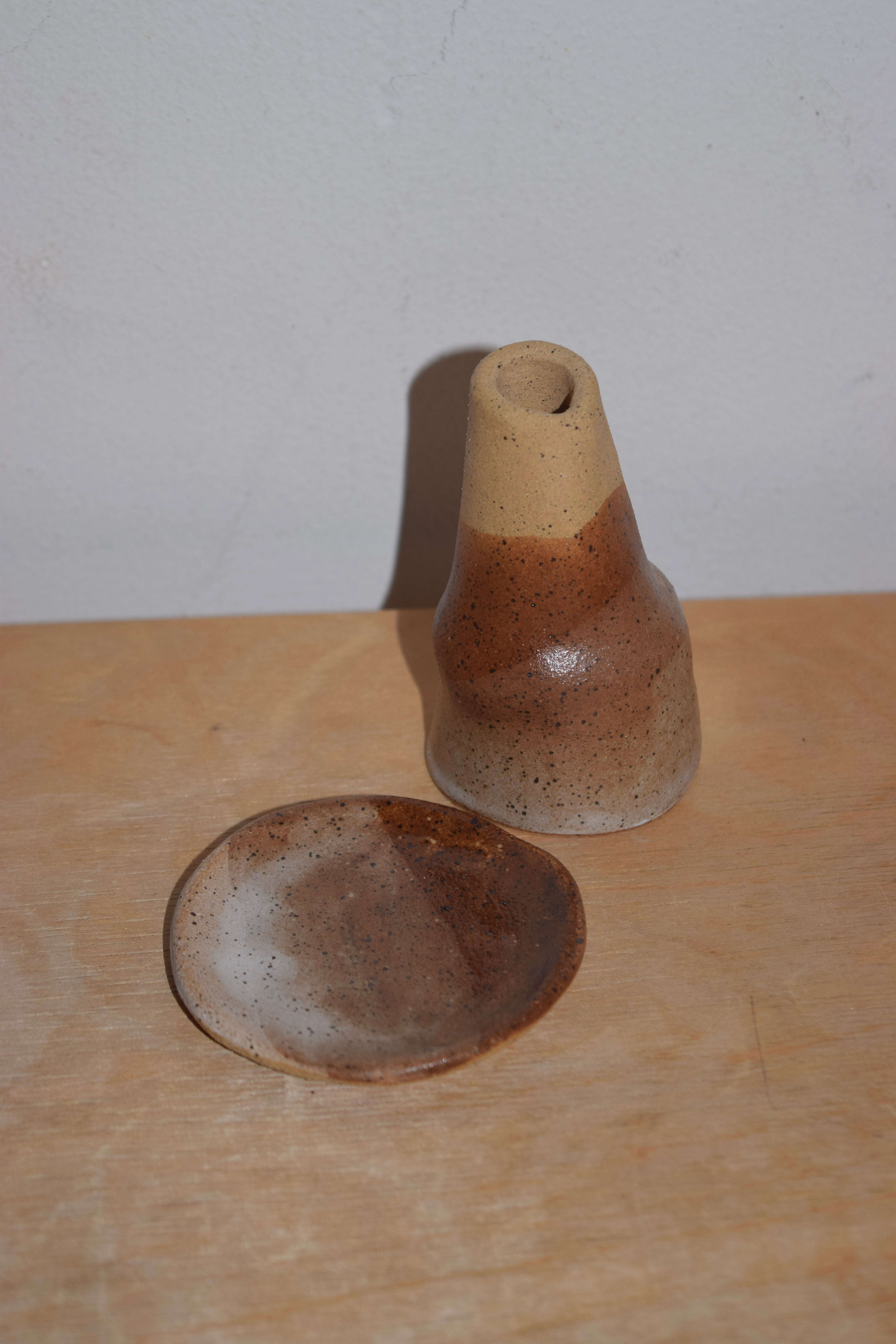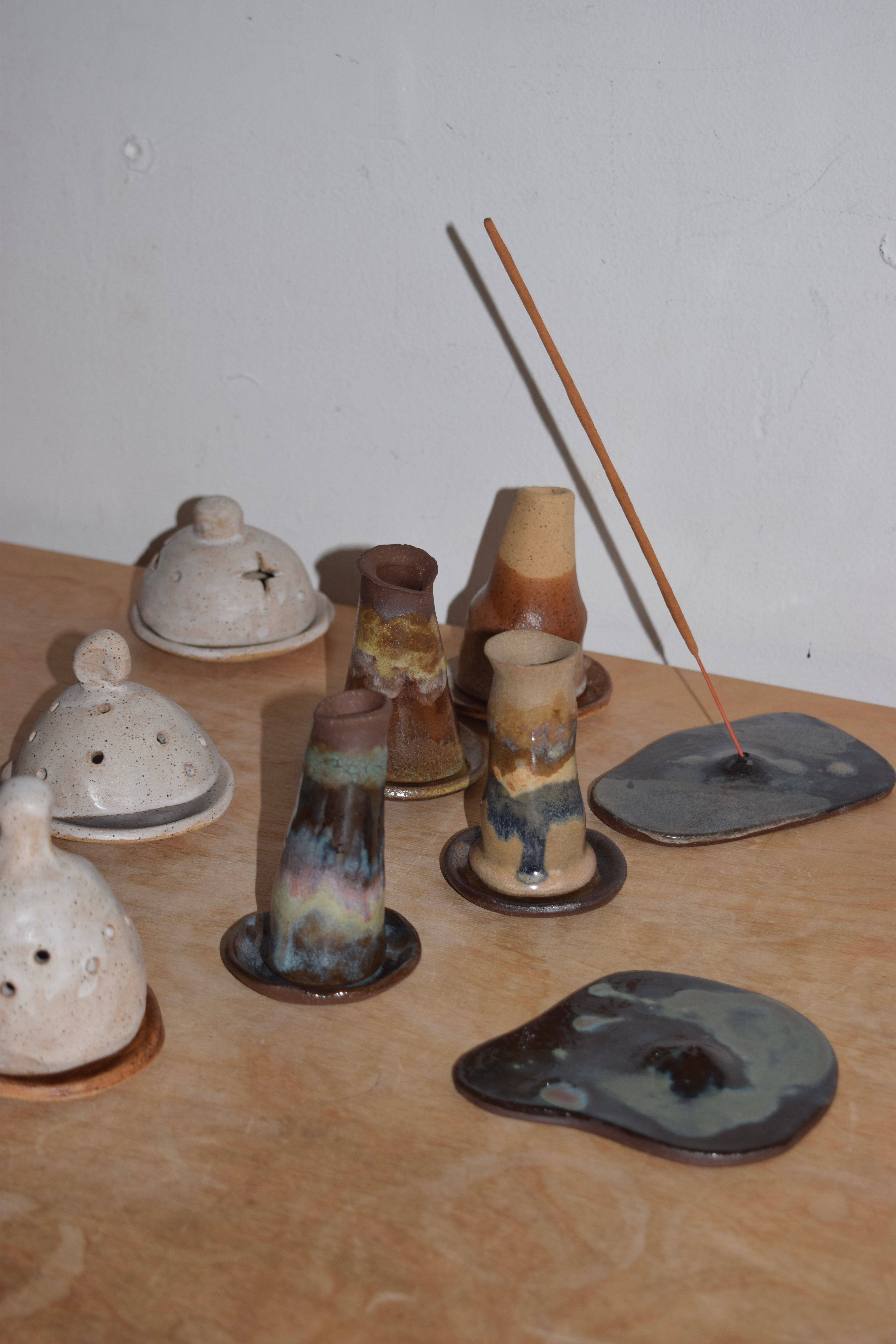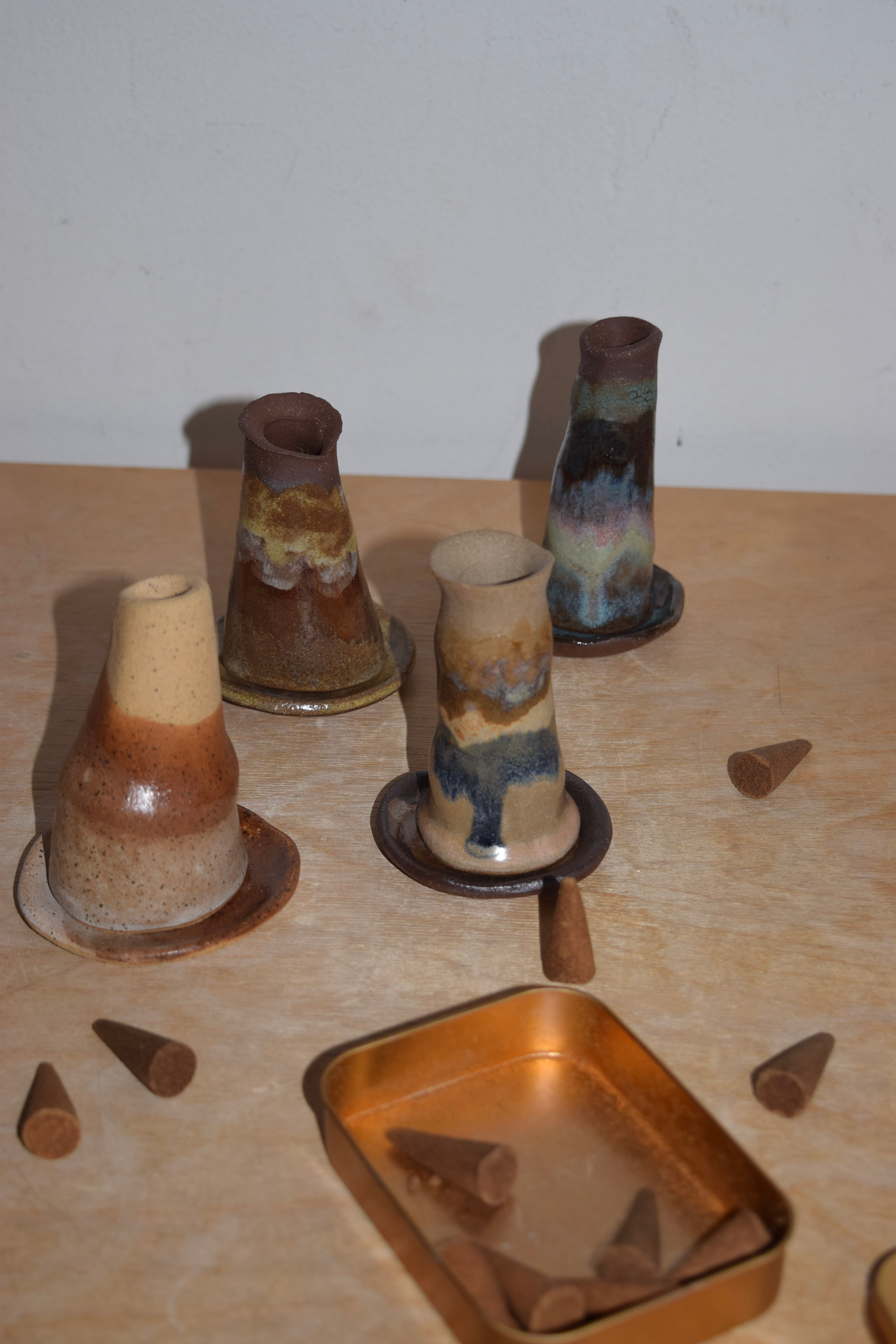 The Incense Cloche Towers are a fun way to burn incense cones. Each piece is handmade and unique in it's own way. These Cloches come in a two piece set. Featuring a small plate to sit an incense cone on, and a fluted tower that sits on top. These peice filter smoke out of the hole on top of tower.