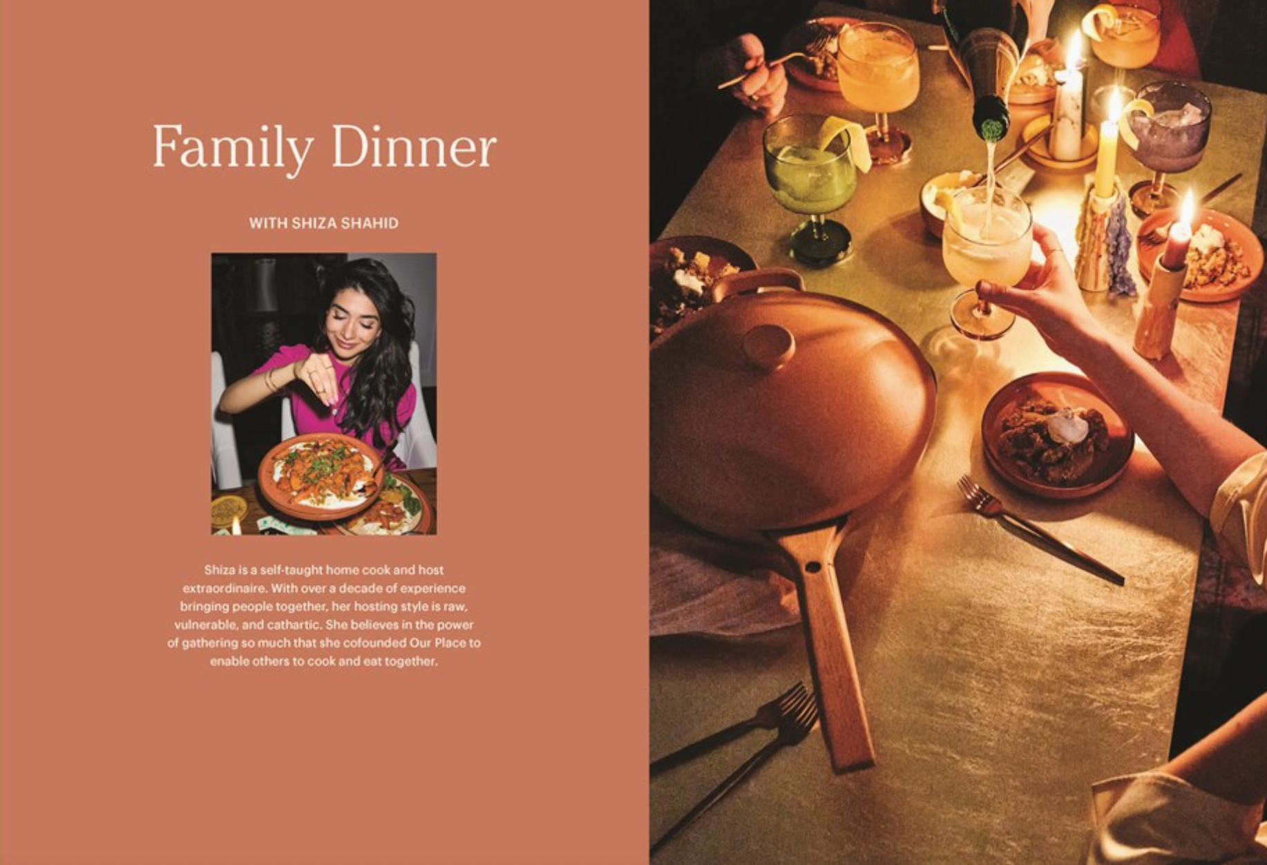Recipes for gathering | hardcover | From the covetable cookware brand Our Place (makers of the super-popular Always Pan®), more than 100 dinner party–worthy recipes menus that celebrate culture and community. Our Place, the cookware brand that took the food world by storm, has always been about more than their brilliantly designed products—it’s about bringing people together, celebrating cultures, and cultivating connections. And what better way to do that, than through sharing a meal? Co-founder and CEO Shiza Shahid invited 11 pioneering tastemakers, chefs, and restauranteurs to take a month and throw a dinner party for you to join. In Dinner at Our Place, you’ll find more than 100 recipes and 12 specially curated dinner parties, plus playlists, mood lighting guides, plating philosophies, scripts for talking to your fishmonger, and so much more.