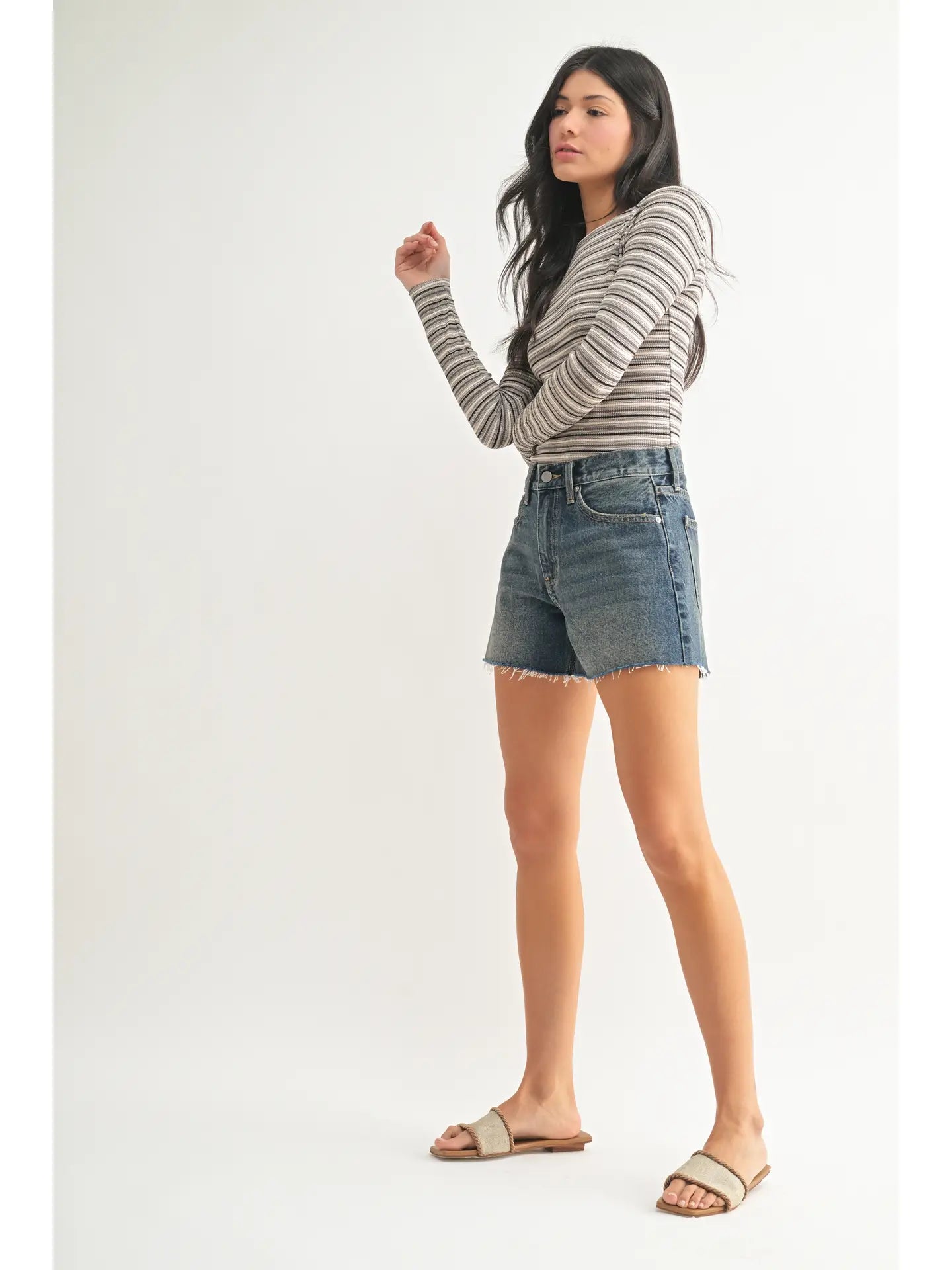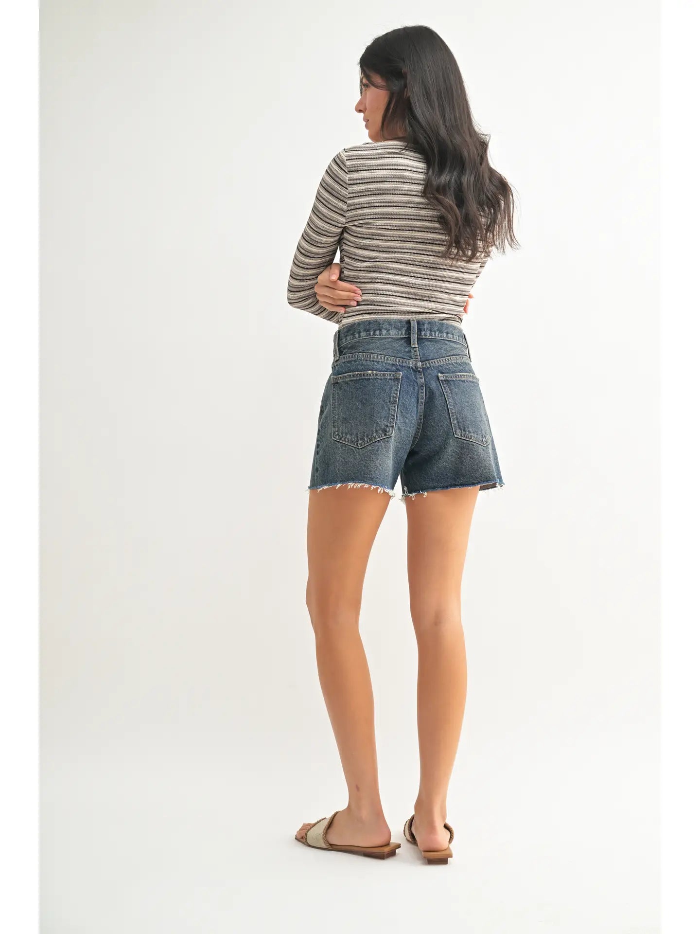 These vintage inspired shorts come in a medium wash. They are high rise, aline & non stretch.