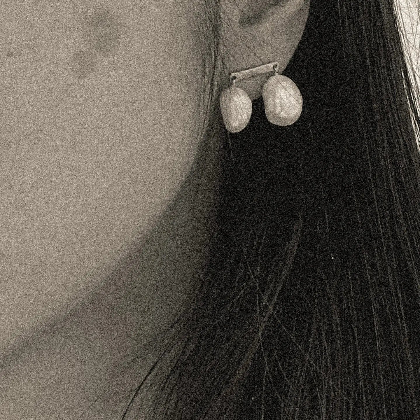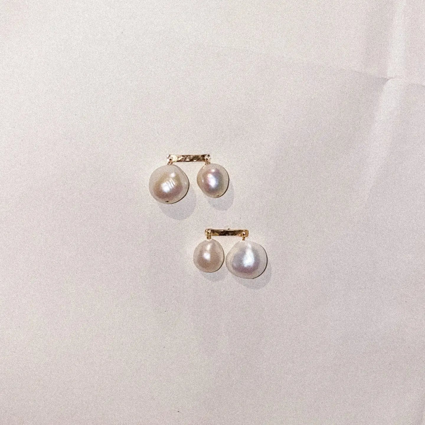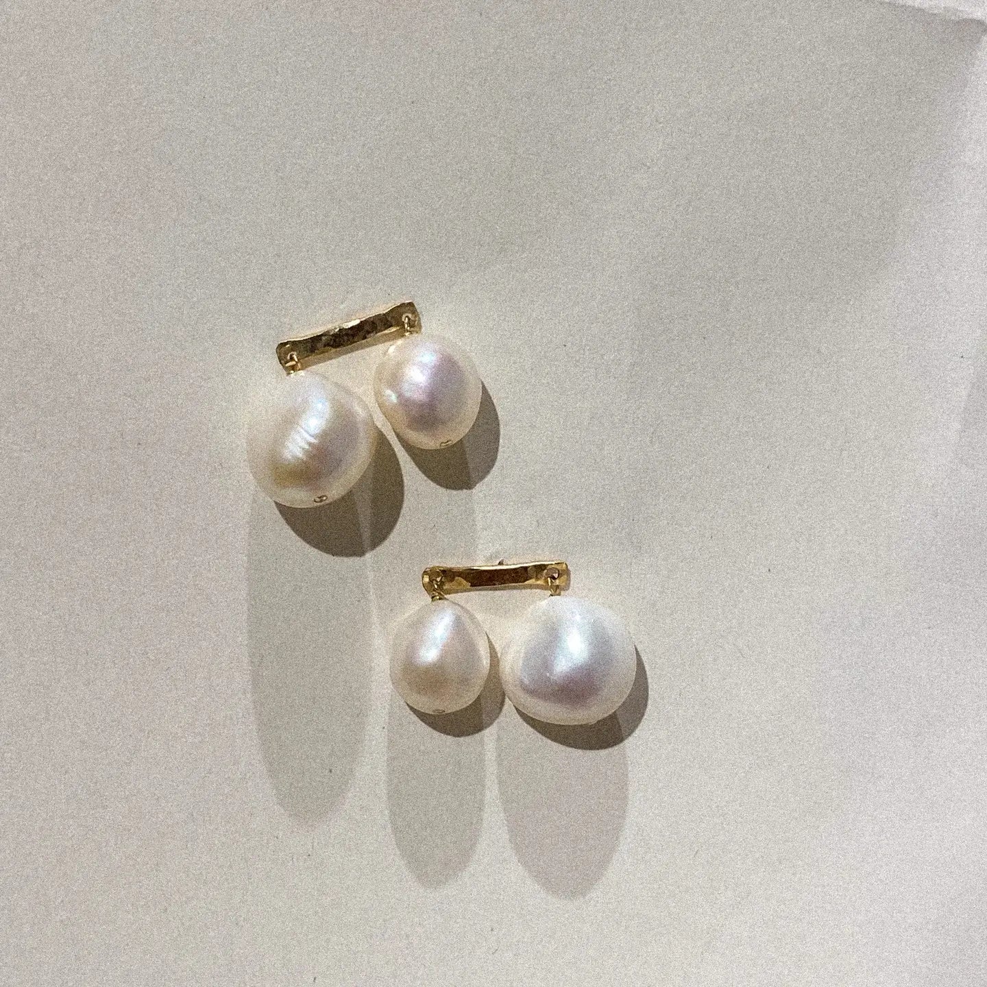 * A statement earring featuring a hammered bar with freshwater pearls dangling from it.
