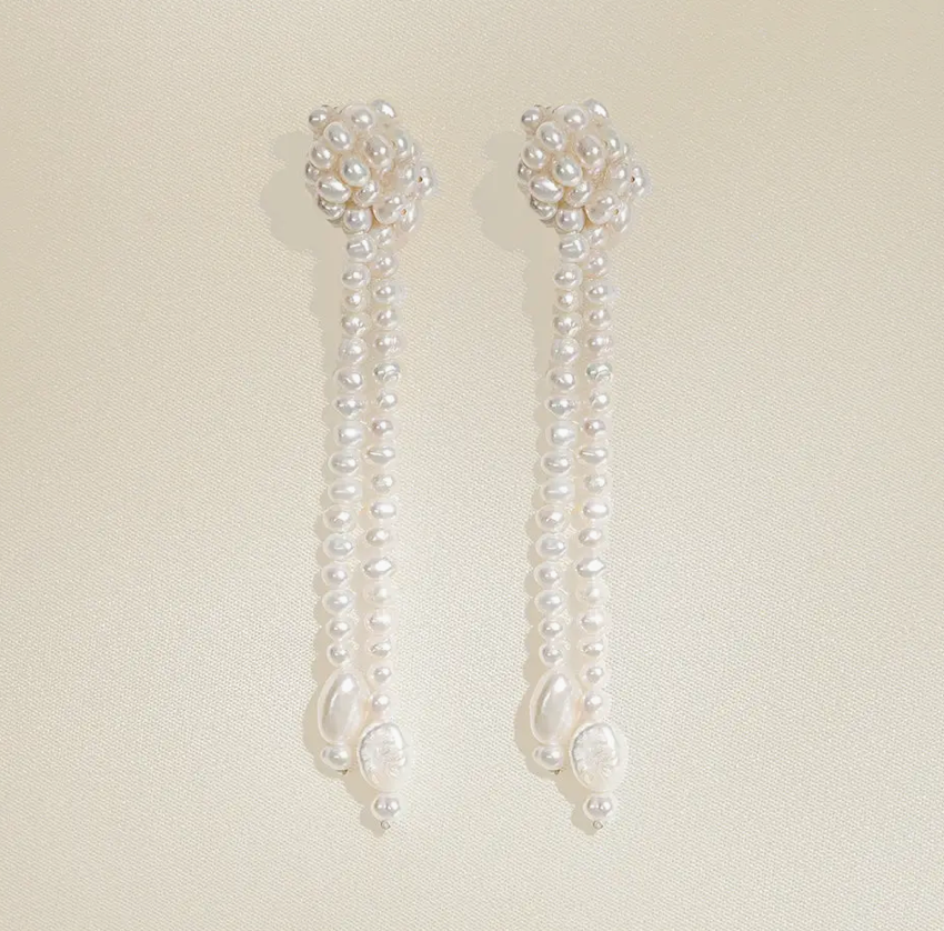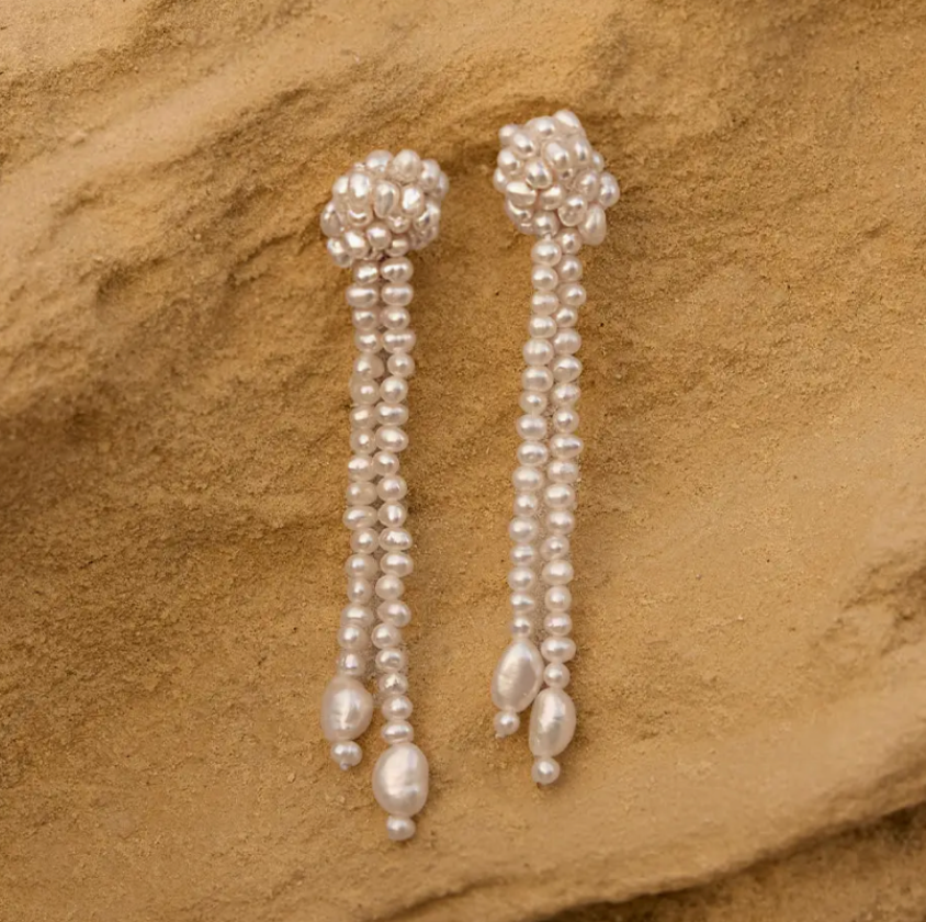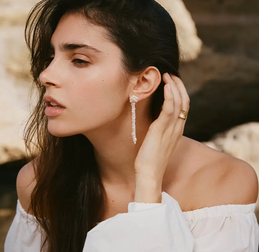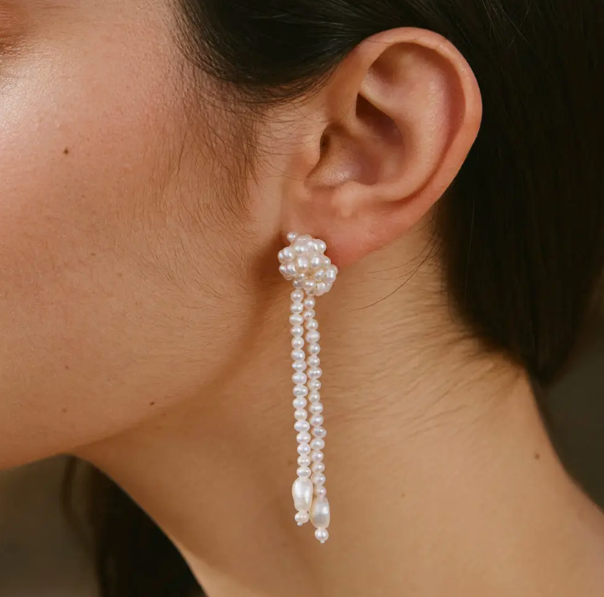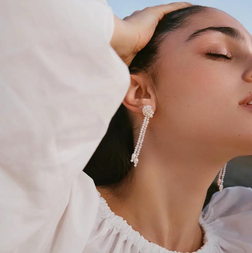 Add a touch of white glamour with our Sia drop earrings. A pearly take on our Grazia earrings and their unforgettable knot, with strings of oval freshwater pearls and a bolder finishing touch.
