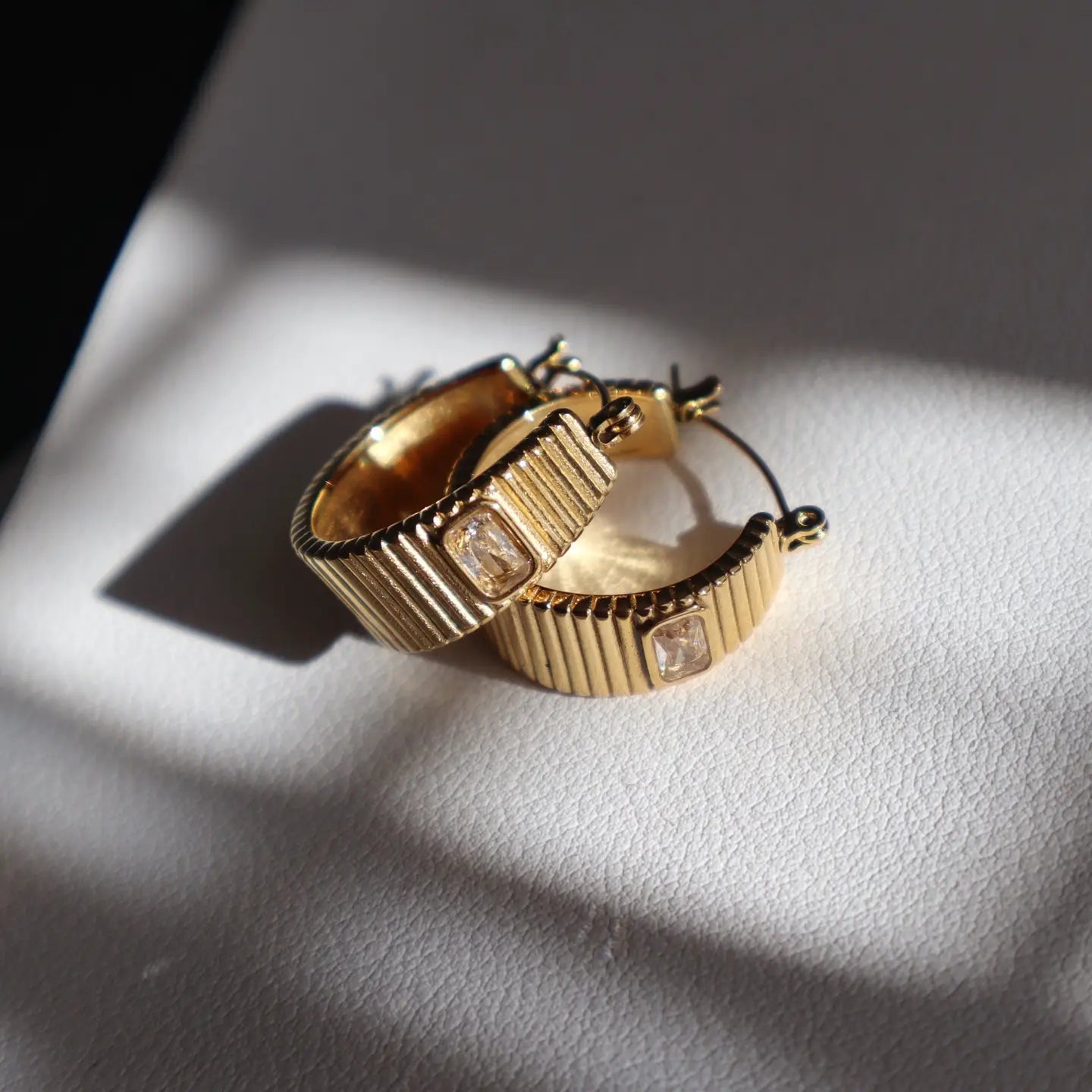 These chunky gold hoops feature a dazzling rectangular gem, adding a touch of glam to any outfit.