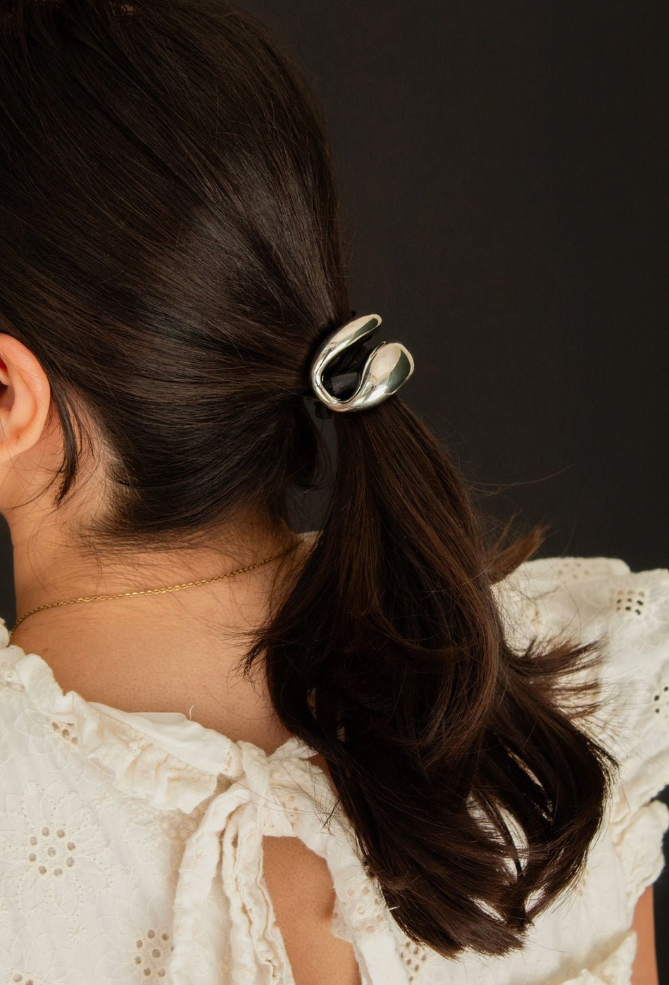 This hair tie will be the best addition to your closet! Made with a black elastic and a silver metal brooch; It will hold your hair better than your average hair tie, and give it the cutest touch while still feeling so simple.
