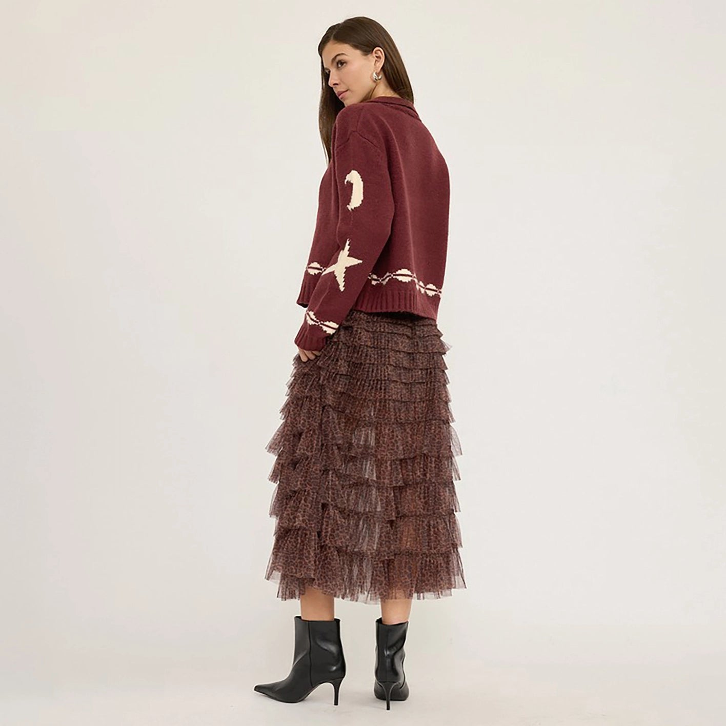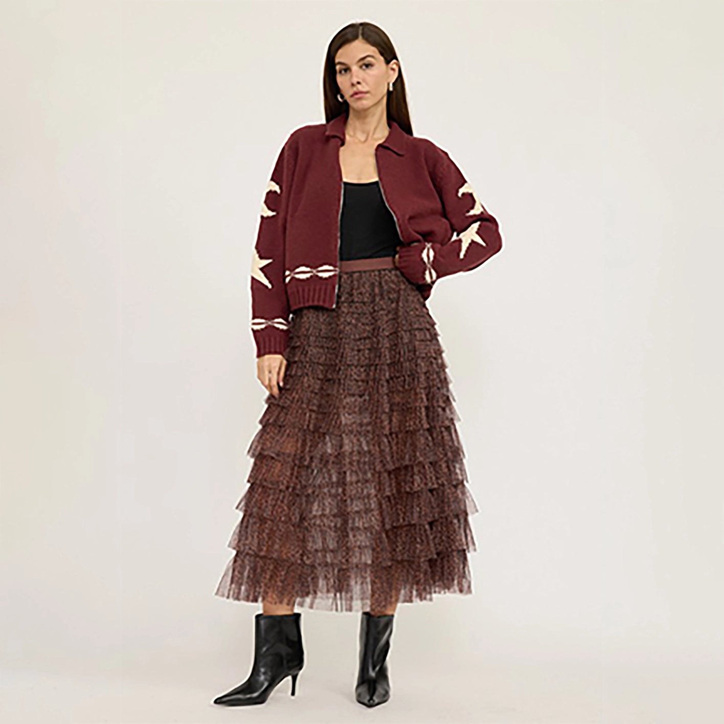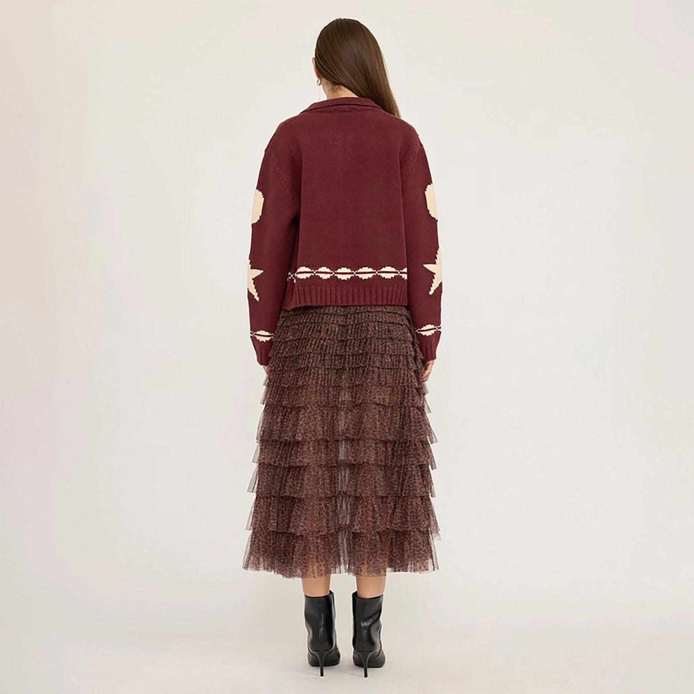 Made from a premium blend of acrylic, nylon, and polyester, this sweater jacket combines comfort, warmth, and statement style.