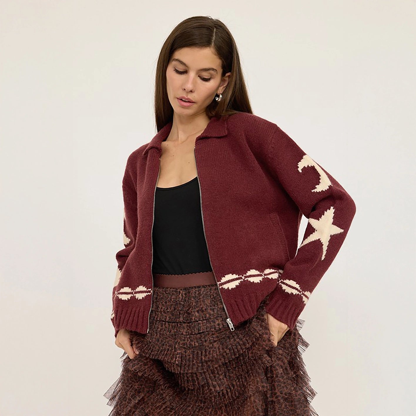The star-and-heart knit design adds playful charm, while the easy zip-up closure and relaxed fit make it perfect for everyday wear.