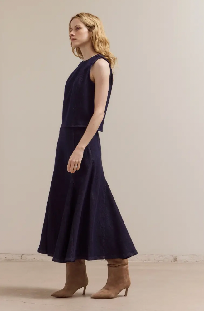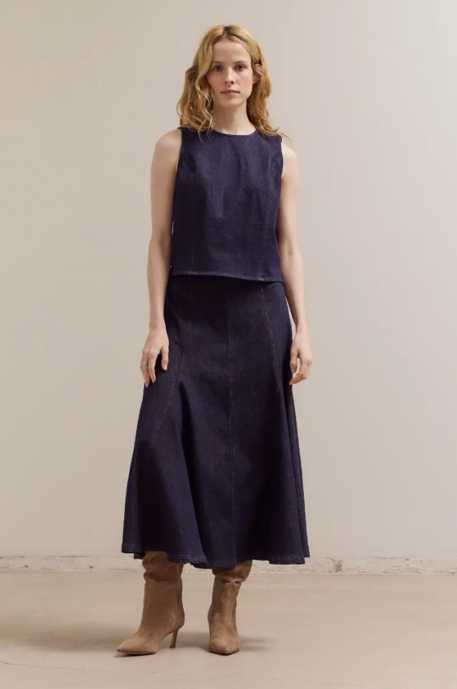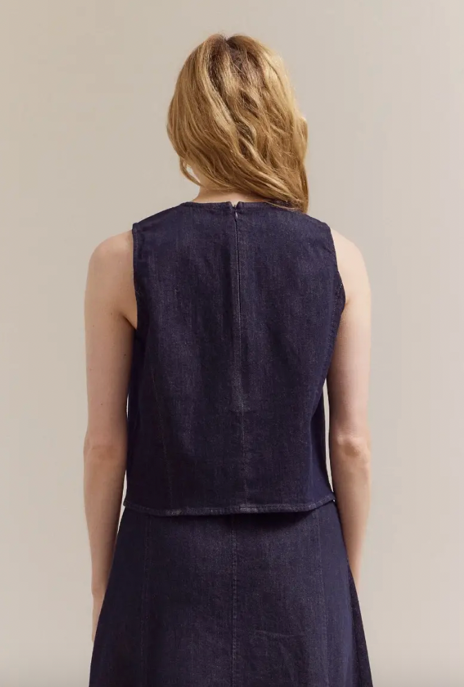 The Indigo Denim Top is a stretchy sleeve material in the prettiest dark denim. We see this top paired with a fun trouser and beaded jewelry. Wear alone or layer over a button down on cooler days.