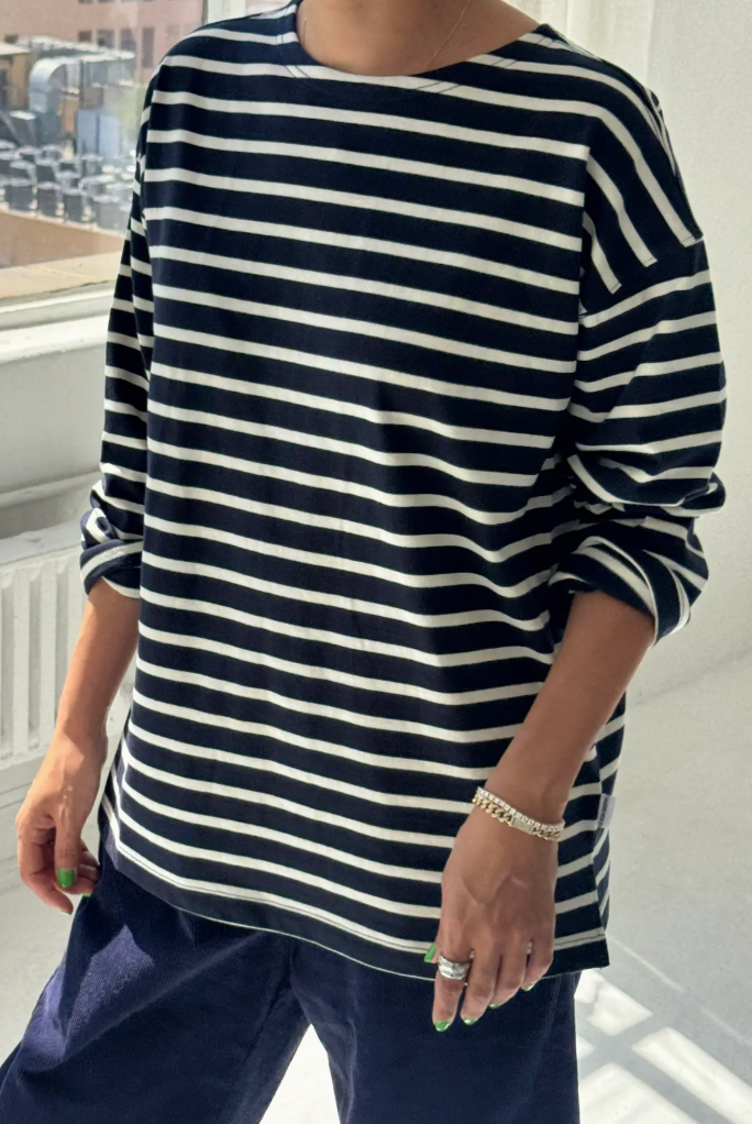 Add a touch of Parisian flair to your wardrobe. The Marseille Top takes inspiration from the timeless Breton stripe uniform, featuring a classic round neckline and an oversized, full-length fit that gently sweeps the hips. Crafted from durable, heavyweight cotton, it offers structure without sacrificing softness, making it an ideal choice for both elevated and casual looks.