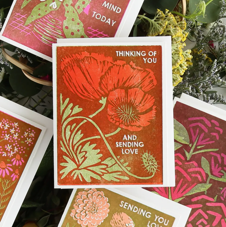 Letterpress, 100% post-consumer recycled paper, A2, blank inside, cello sleeve with envelope.