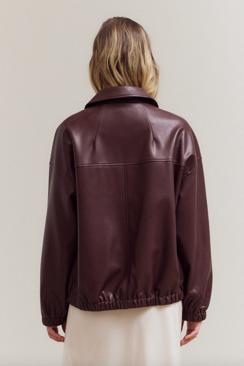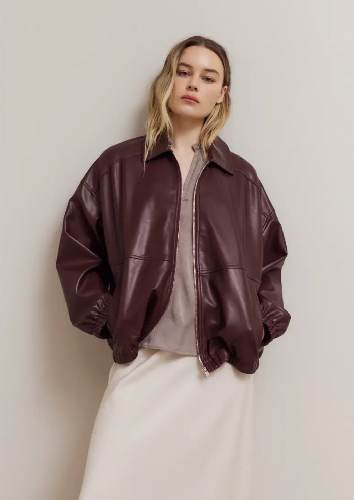 The Vegan Leather Bomber is an oversized lightweight jacket. We love the texture this piece brings to an outfit. It screams borrowed from your boyfriend/ vintage vibes.