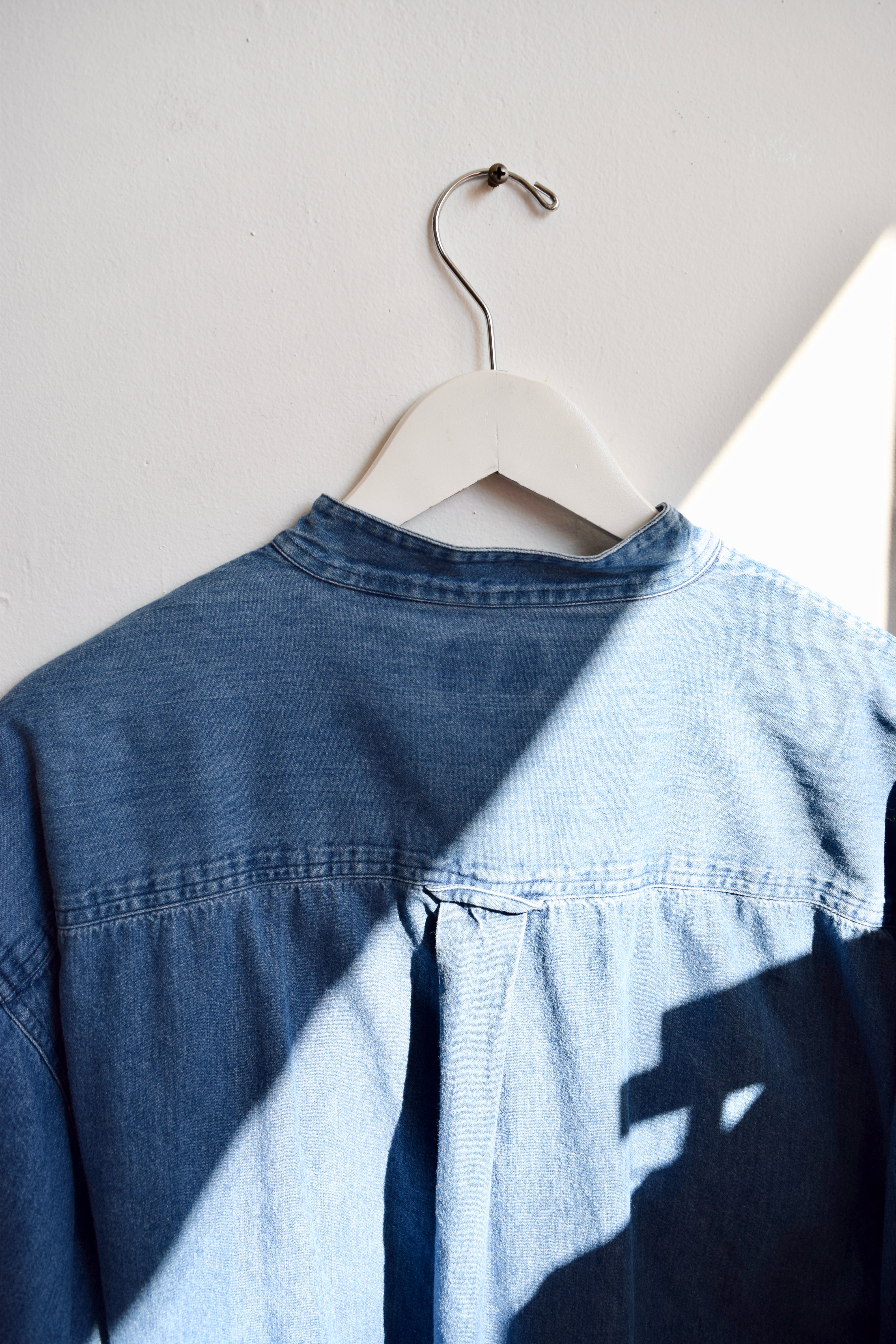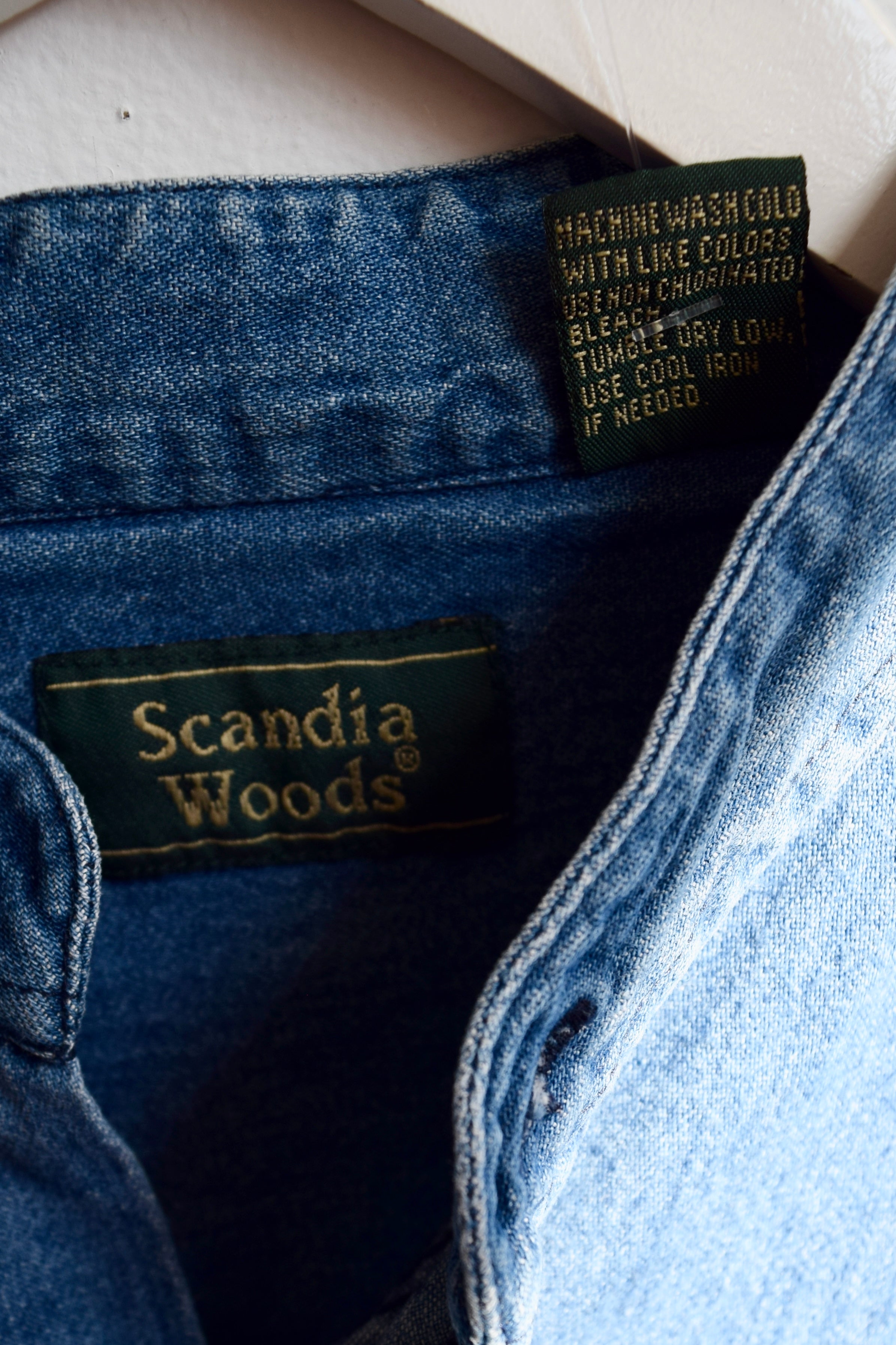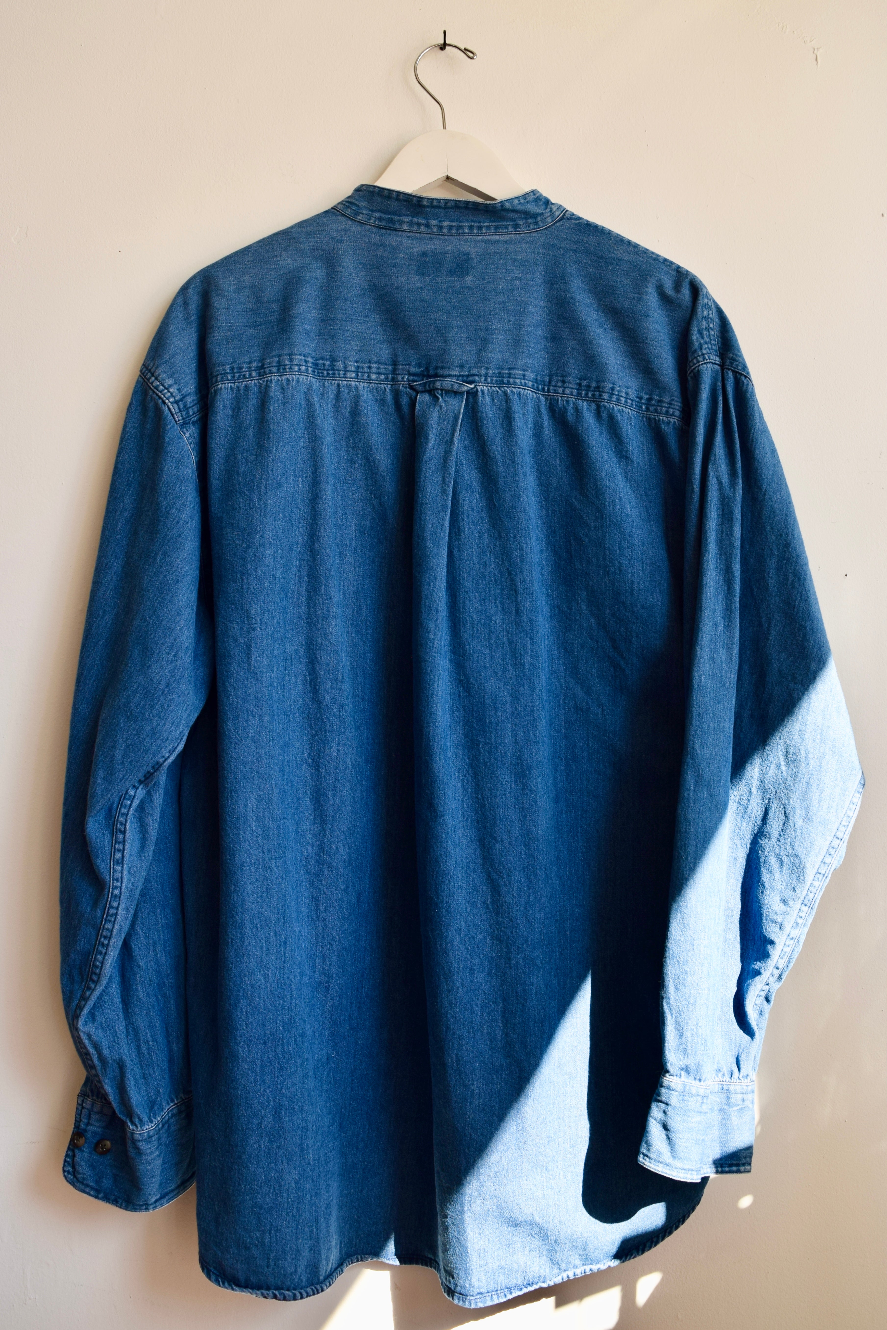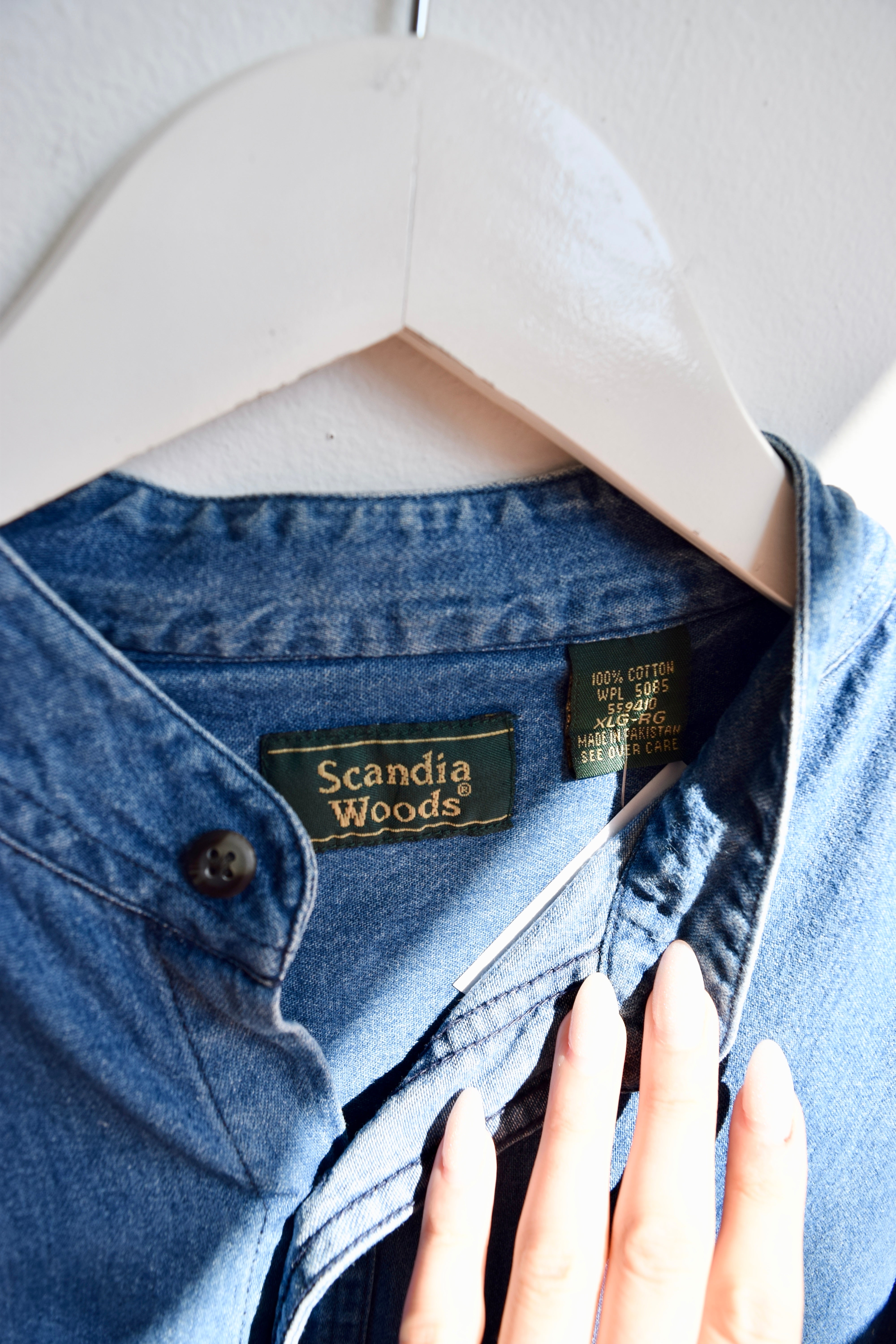 This denim button down is in great condition & features a faux collar. Tagged size XL.