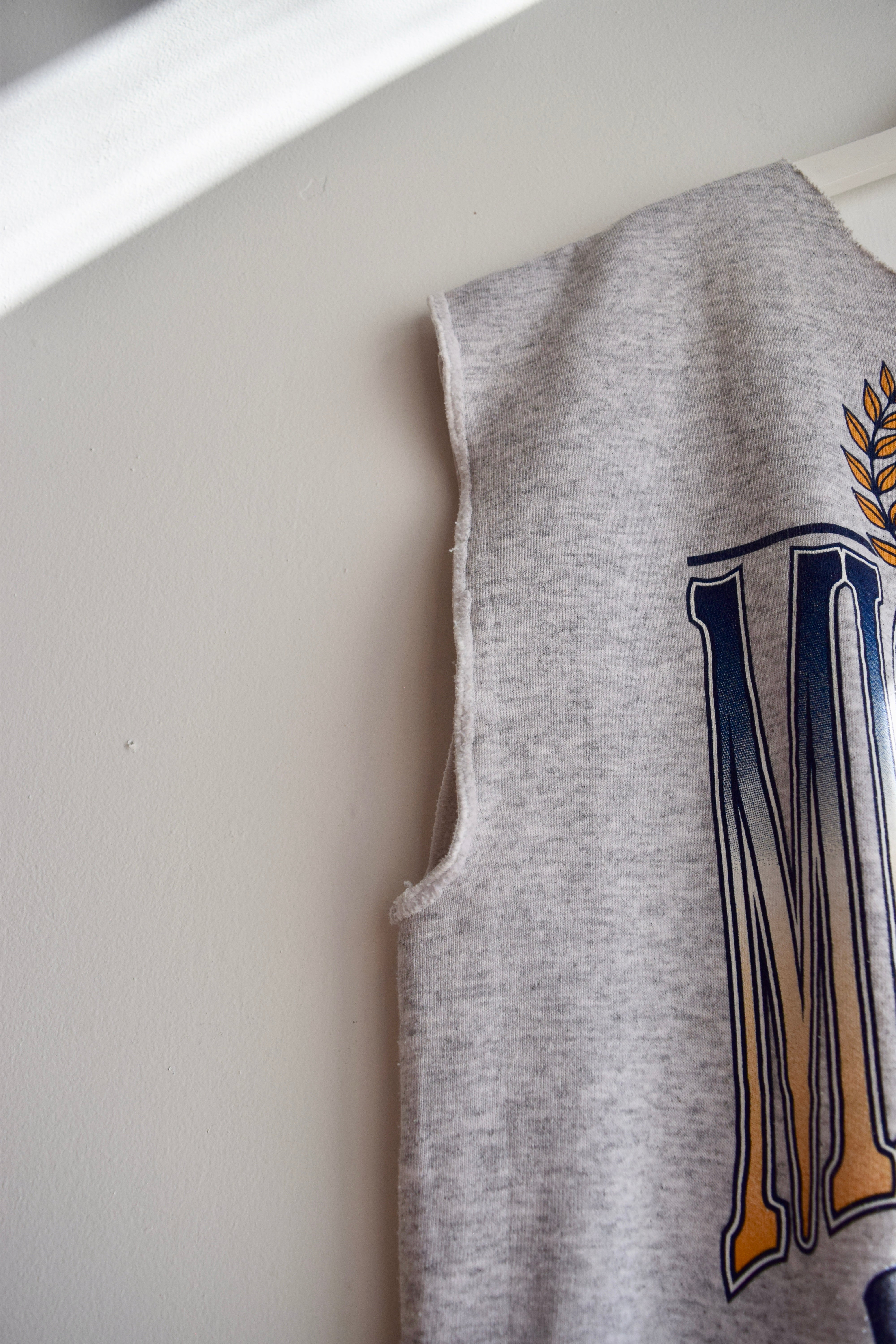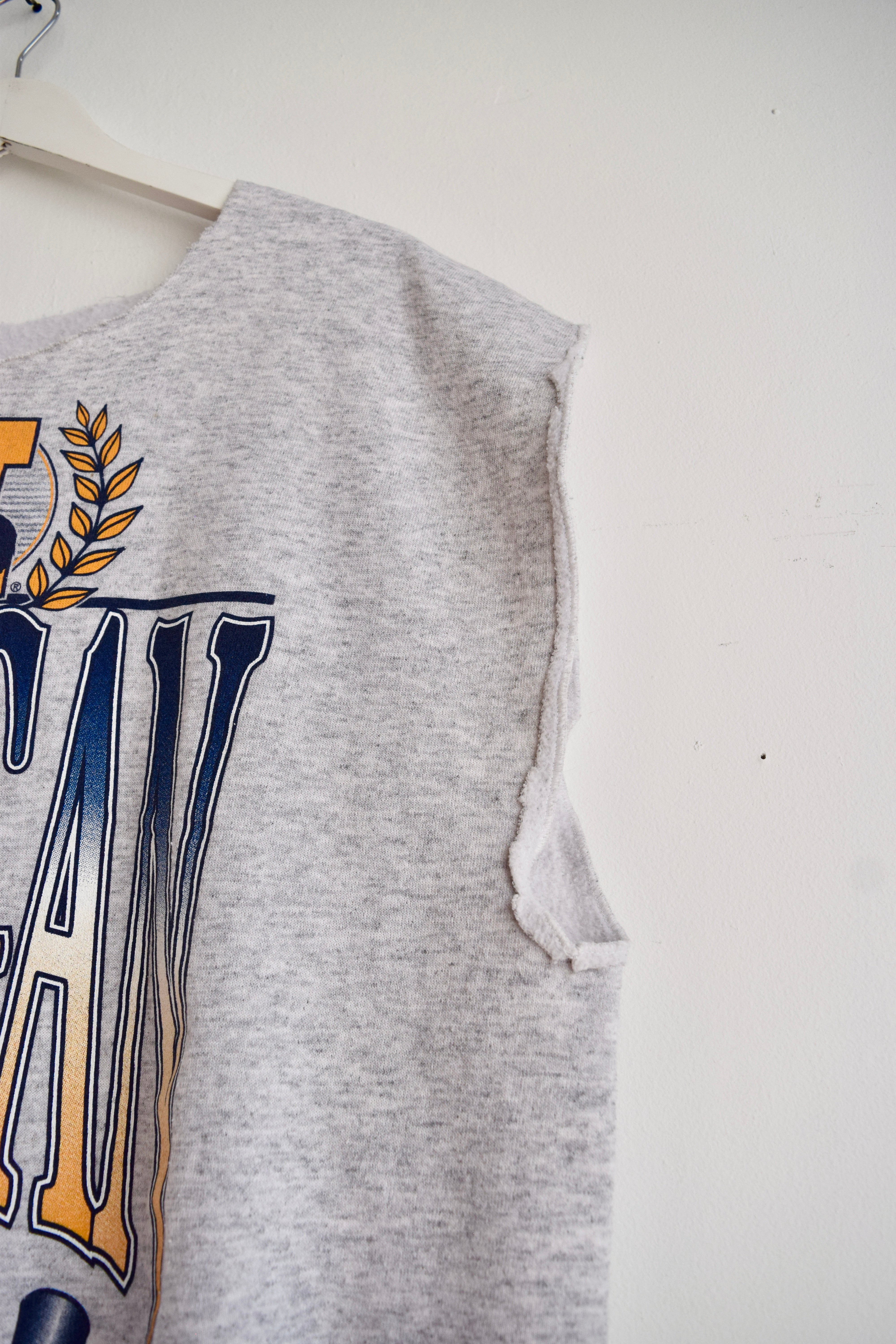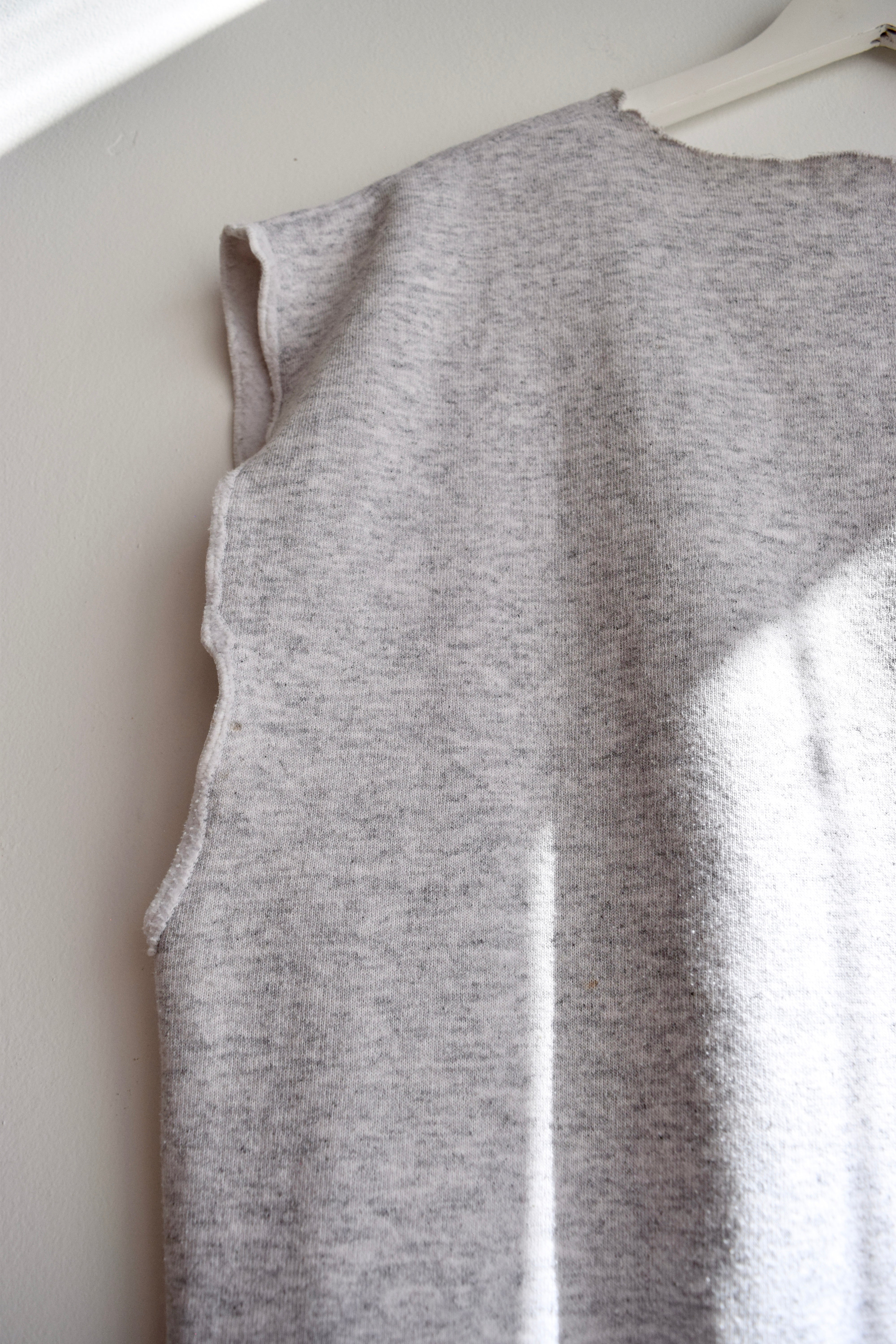 This oversized cutoff sweatshirt is perfect for lounging or layering over a turtleneck for maximum cool vibes. The tag has been cut out but feels like an XL. A few stains shown in photos.