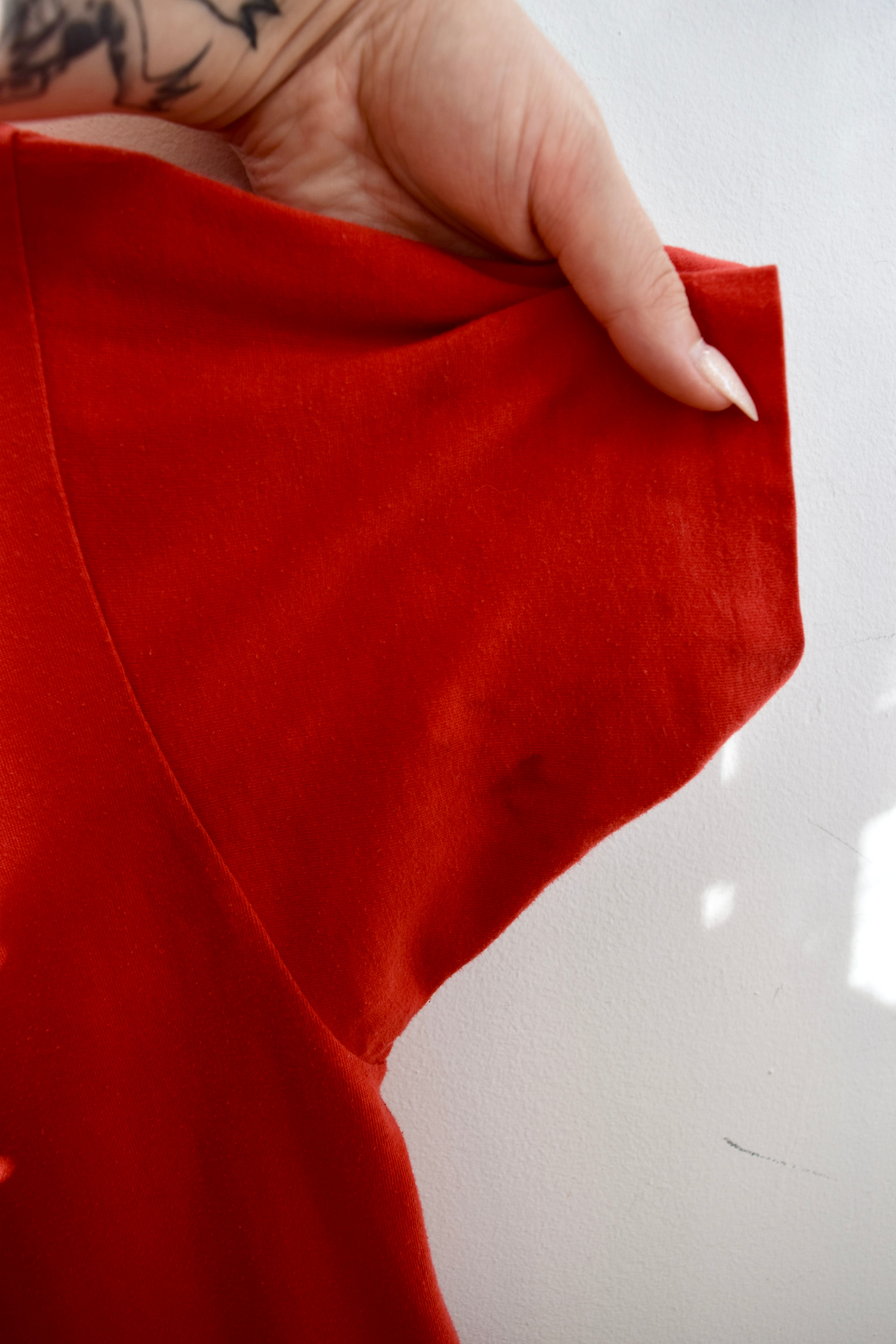 Measurements: Bust - 17" pit to pit when laid flat. Length - 26" from shoulder to bottom hem. Sleeve Length - 6.5" from shoulder seam.