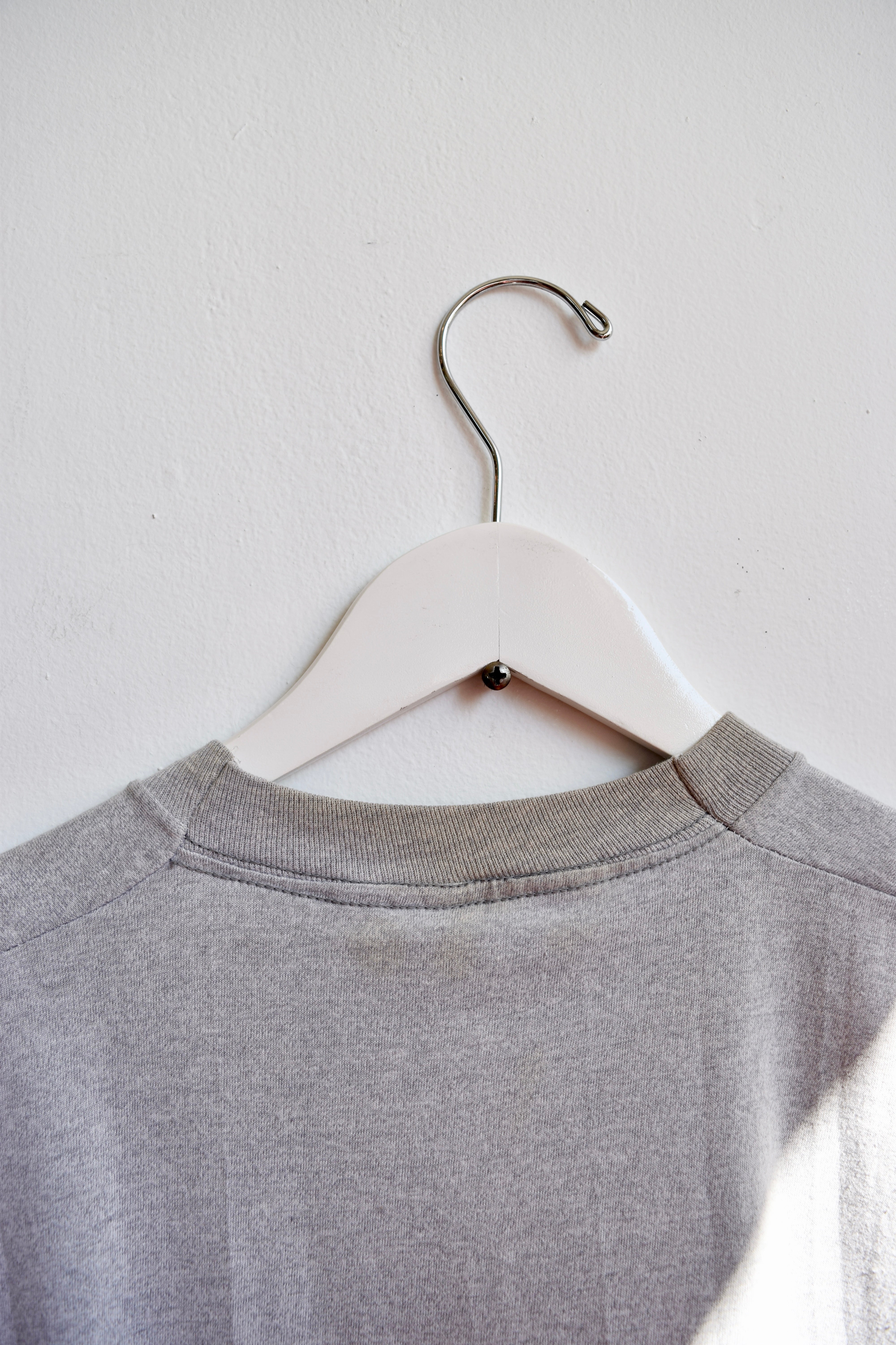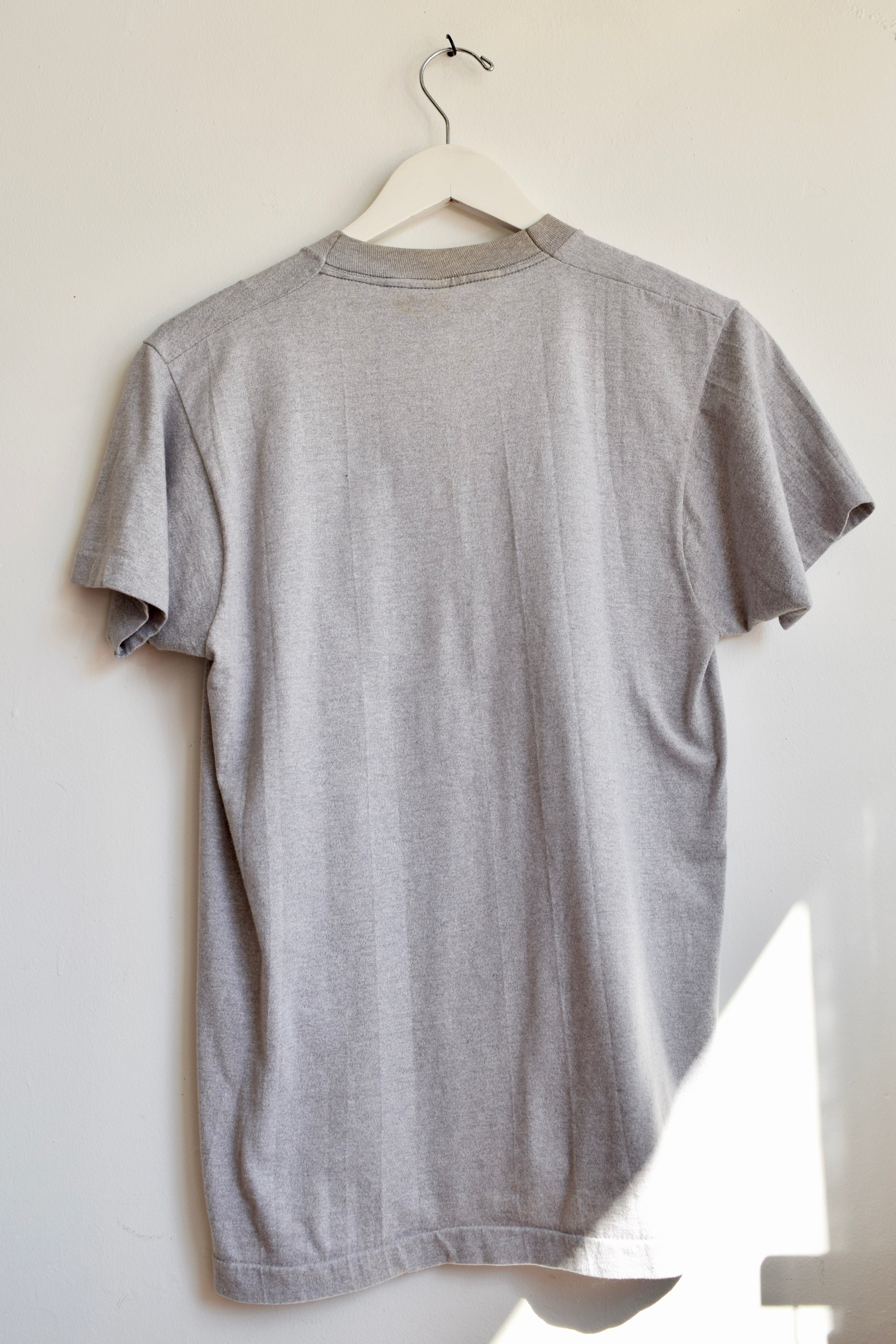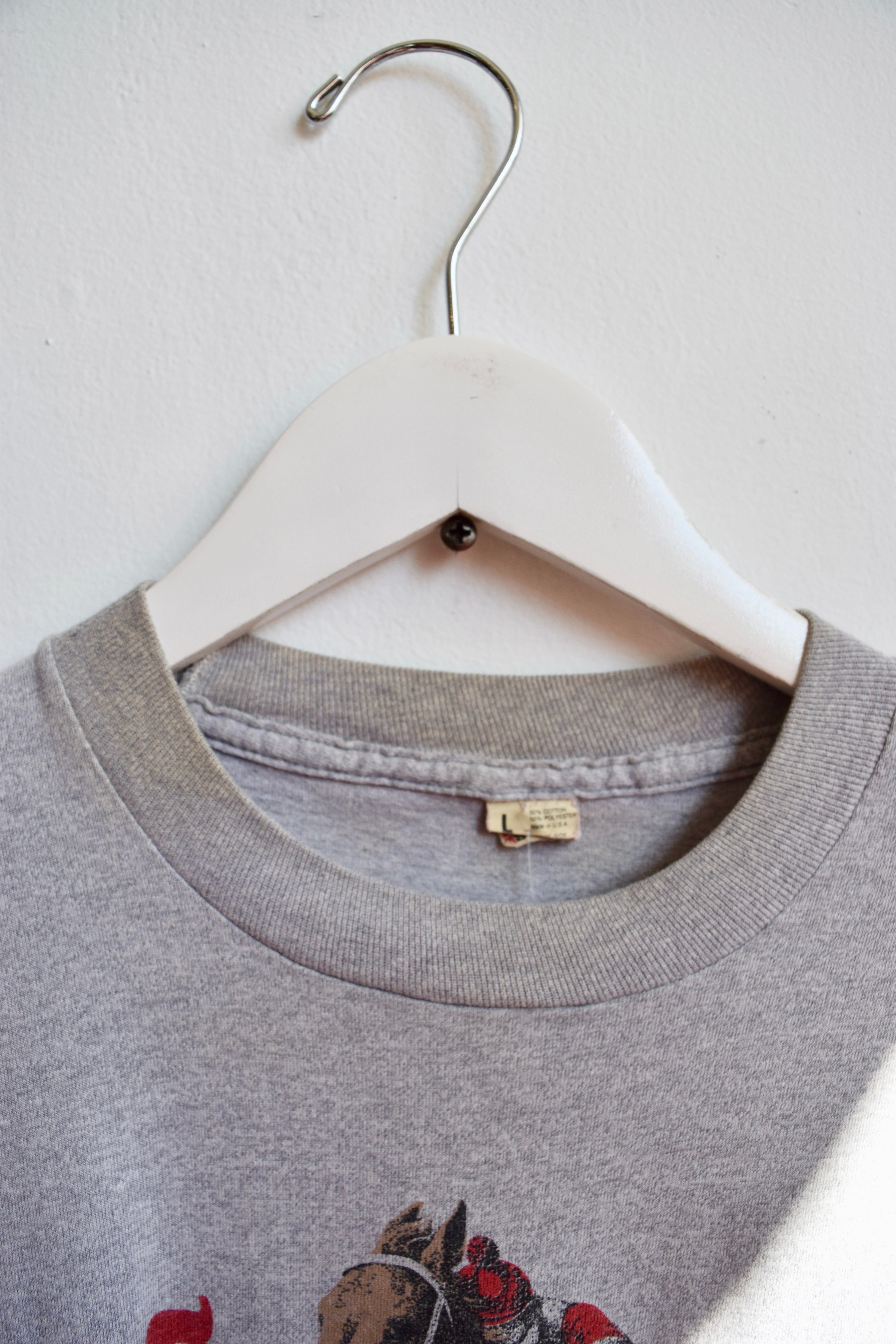 This super soft vintage tee features a graphic of a horse & jockey with the word "Saratoga" in red. Tagged size L. Some minor stains on collar.