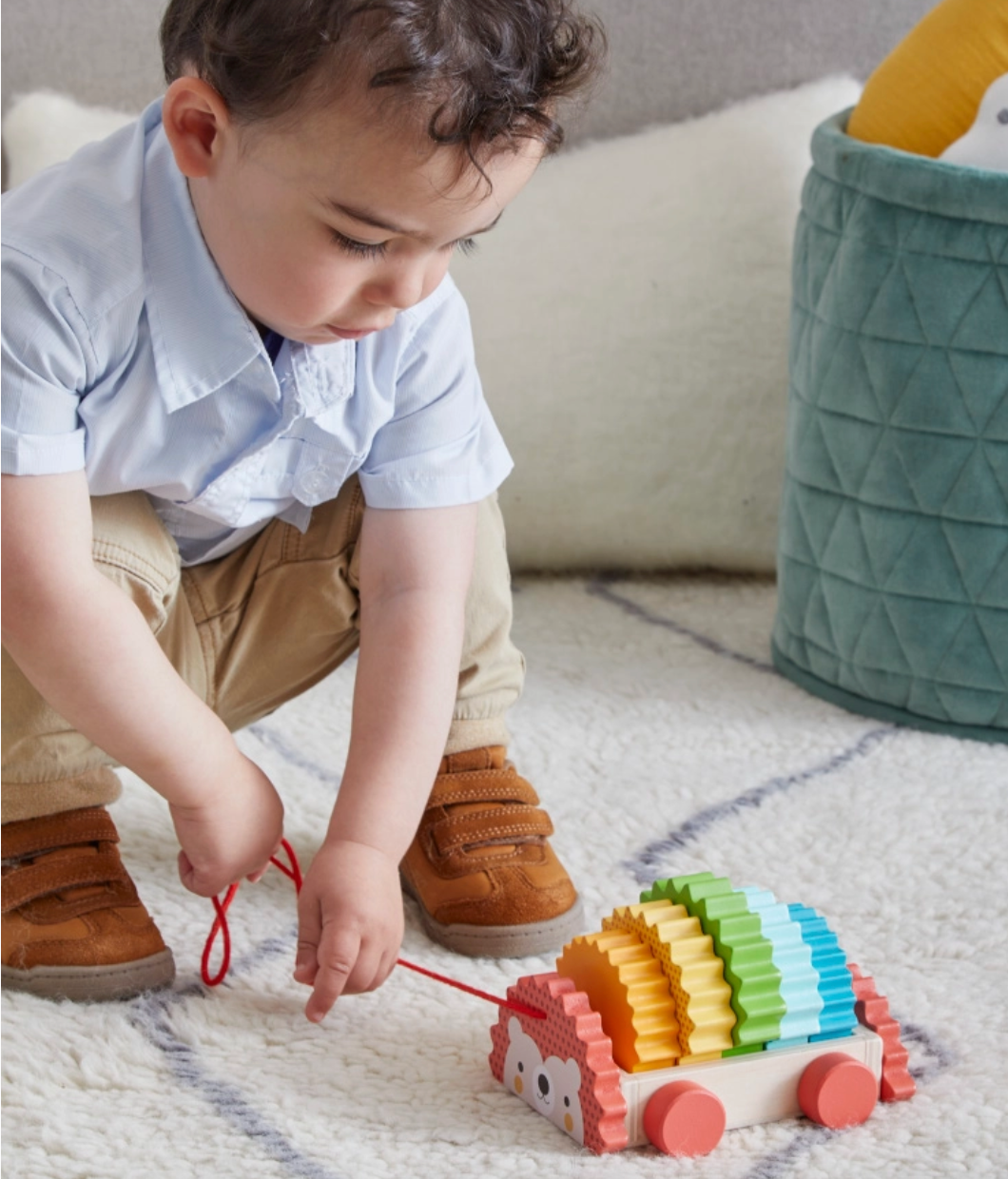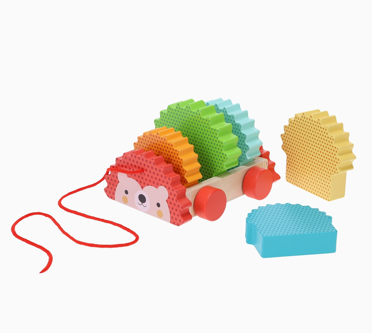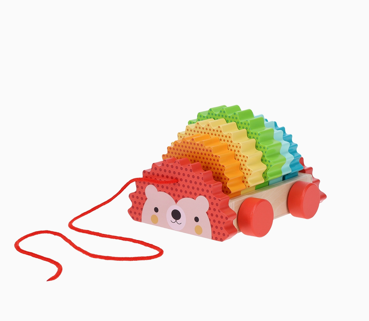 Hello, Hedgehog! Sort and stack the wooden shapes to bring your rainbow hedgehog to life, then take your sweet new friend for a soothing stroll. The five bright and chunky rounded blocks fit snugly into the pull-along tray, making it easy to maneuver and simple to store.