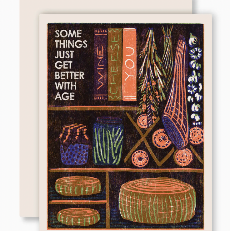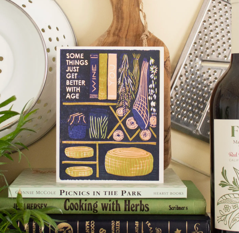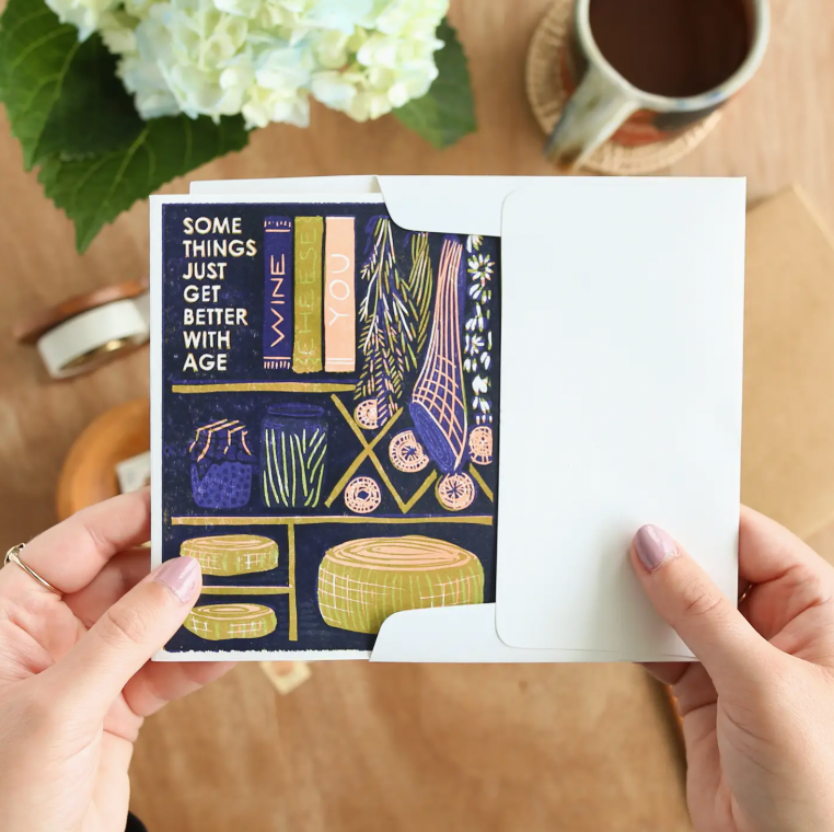 Letterpress, 100% post-consumer recycled paper, A2, blank inside, cello sleeve with envelope.
