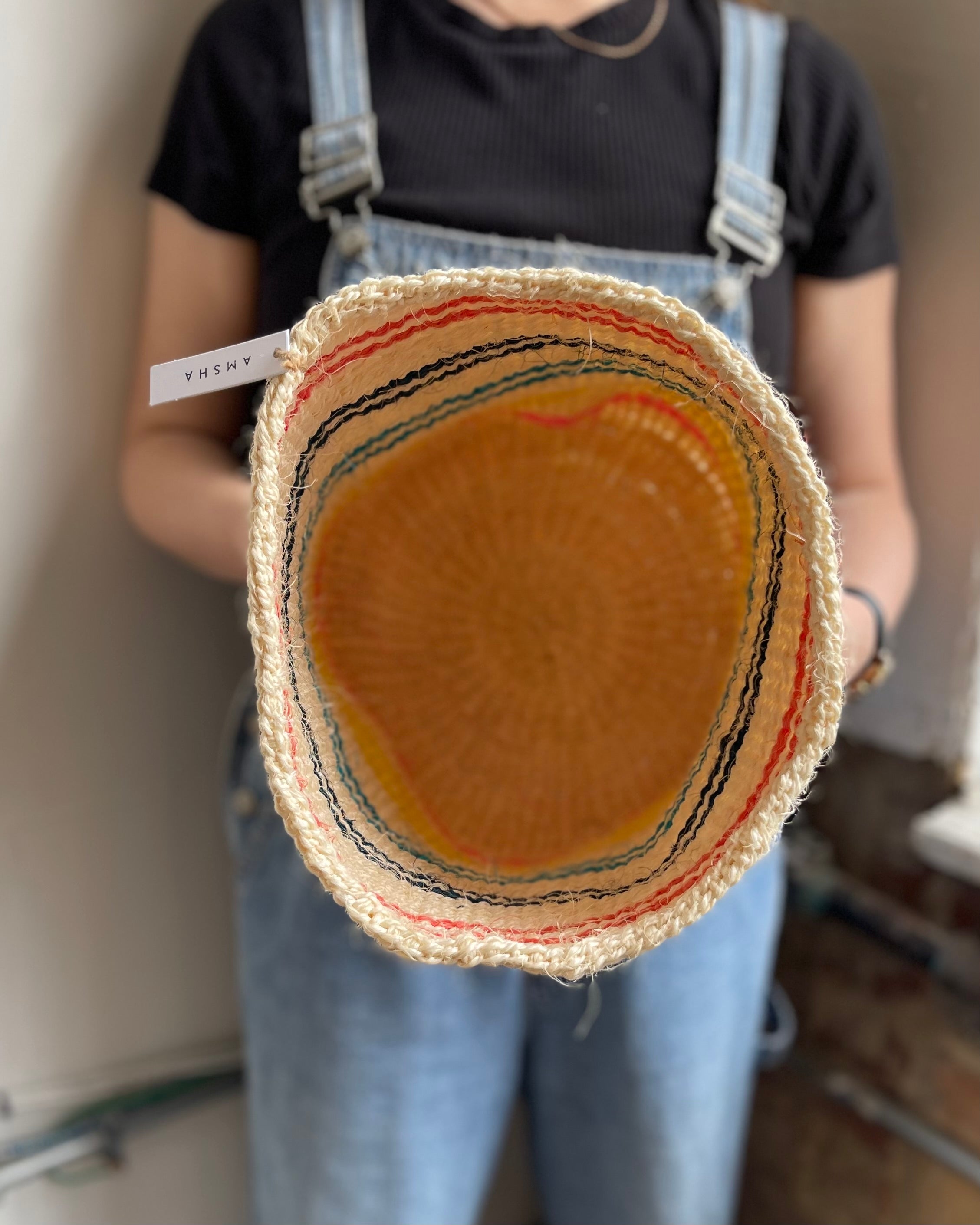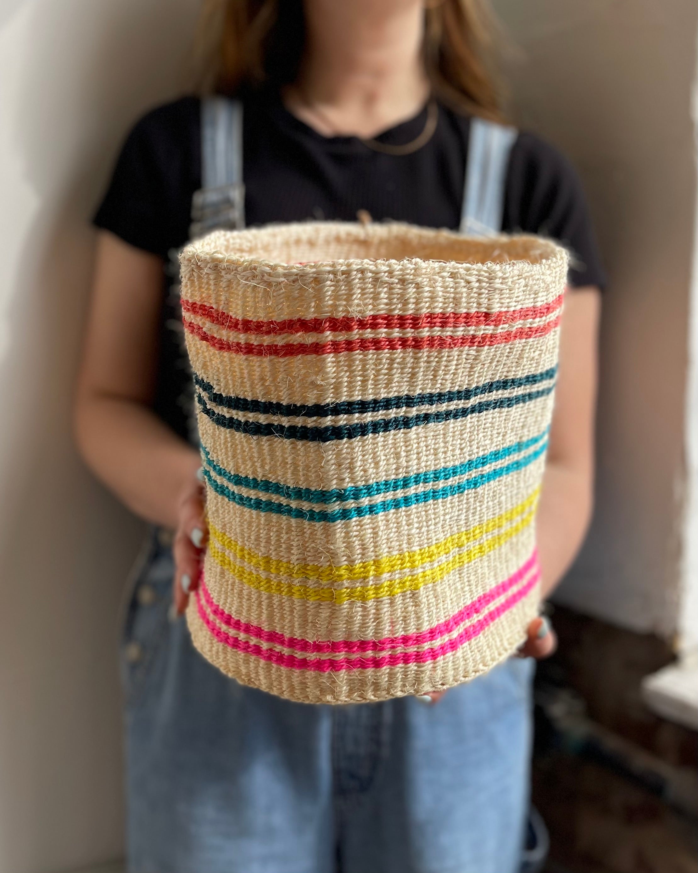 These sisal, woven baskets are handmade by a weaving cooperative in southeastern Kenya. Every basket is hand-dyed and handwoven, so each one is unique. These African baskets are great as plant holders, catchalls, toy baskets, storage baskets, or to liven up a space!