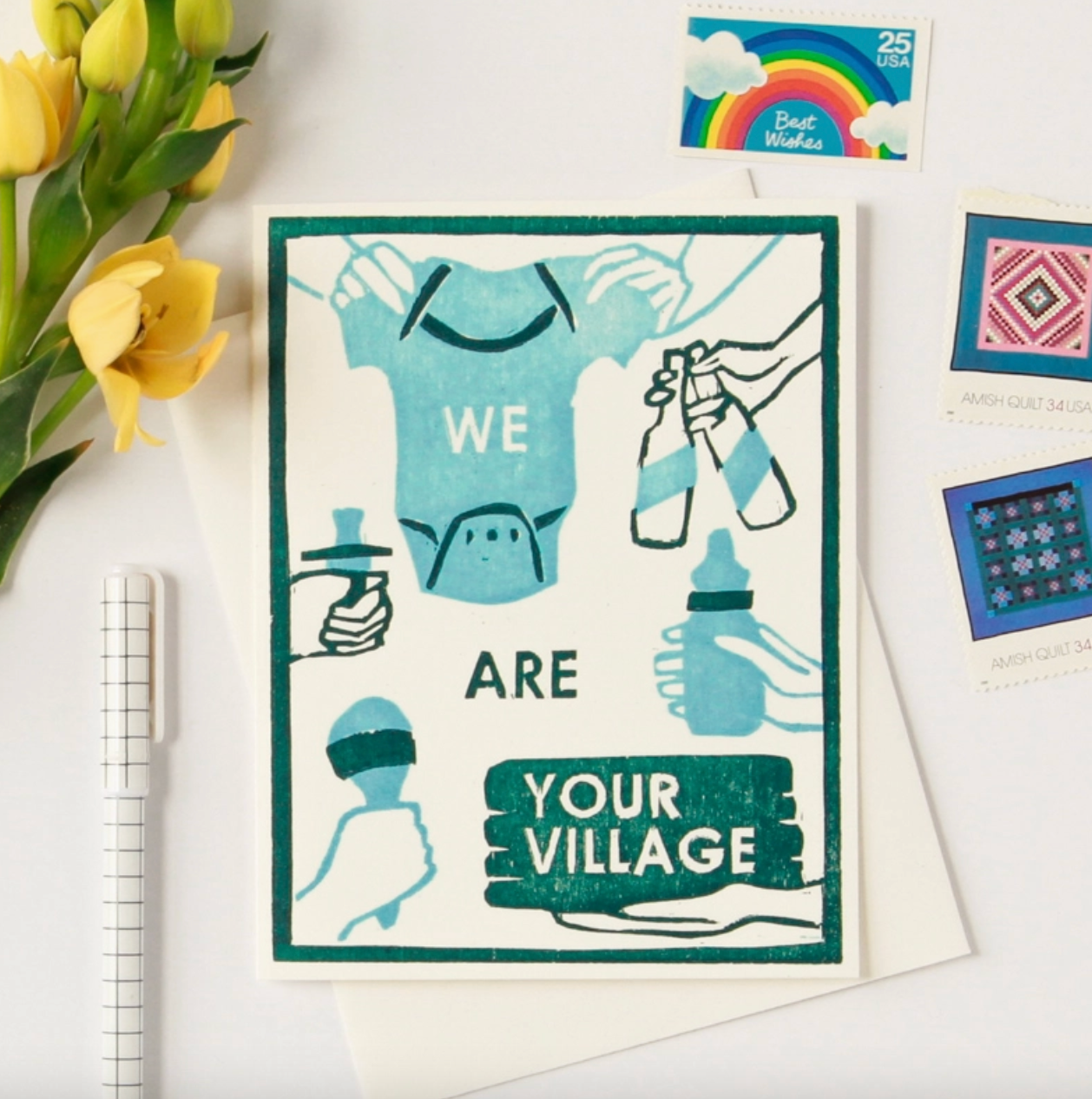 Letterpress printed from carved woodblocks, 100% post-consumer recycled paper, A2, blank inside, cello sleeve with envelope.