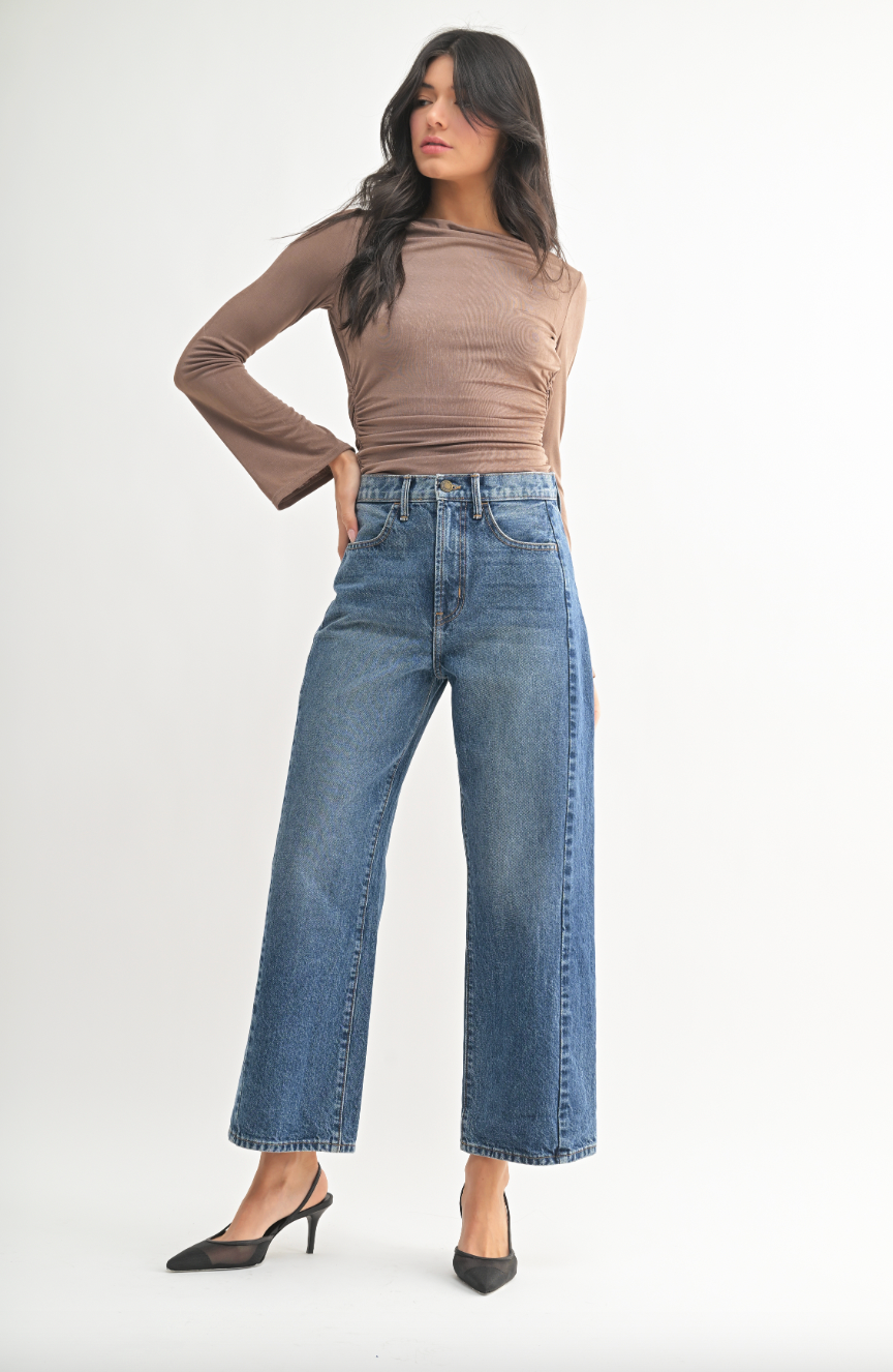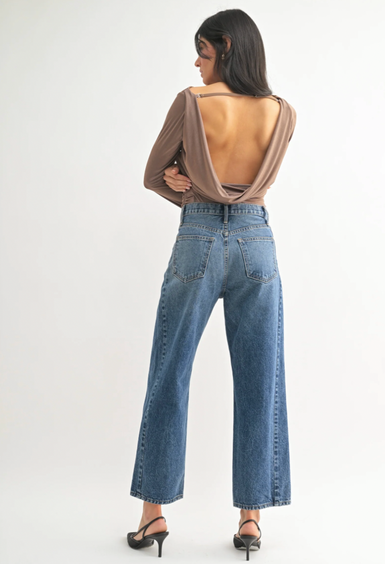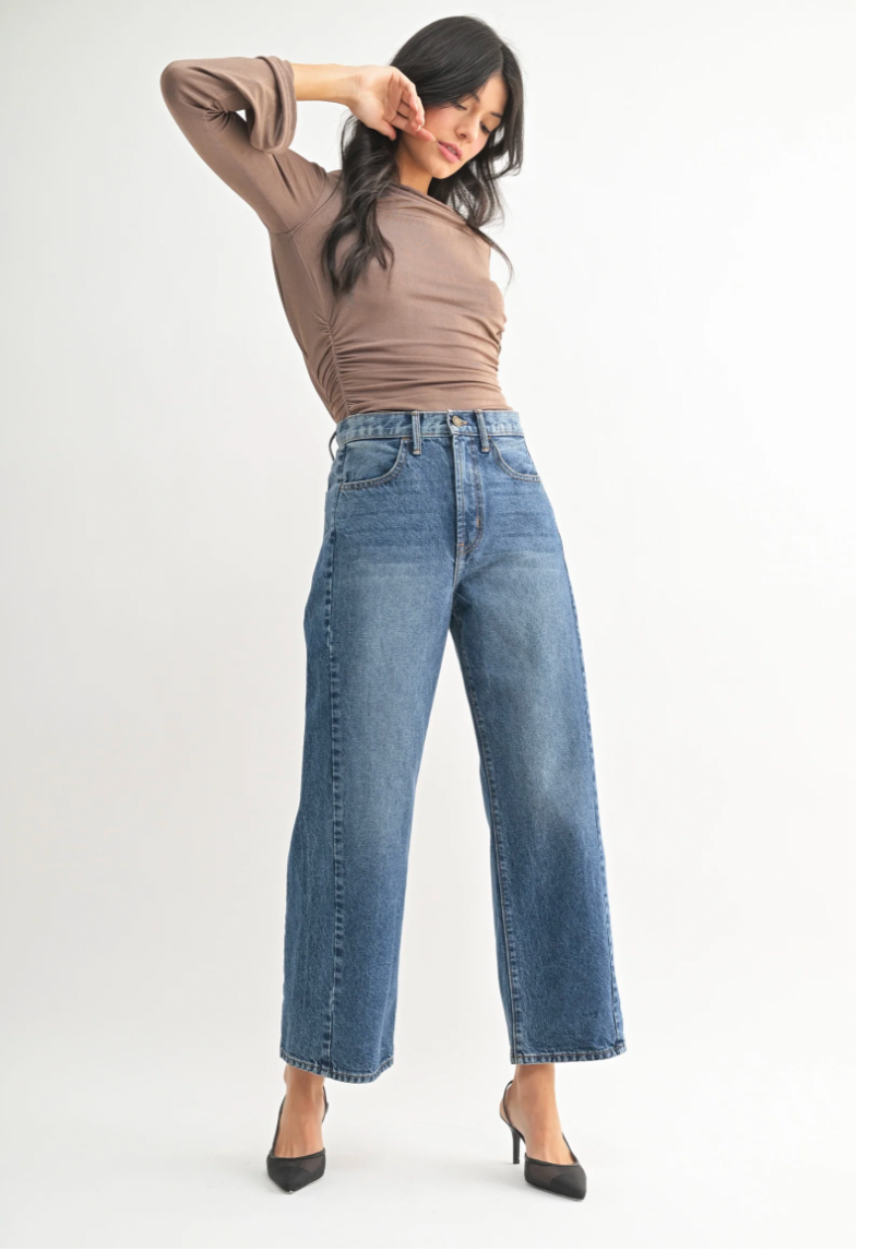 Elevate your wardrobe with these stylish Barrel Jean Twists, perfect for fashion-forward women seeking high-rise jeans with a modern, flattering silhouette. Crafted from 100% cotton in a sophisticated dark denim wash, these jeans feature a unique twisted design for a distinctive look, paired with a relaxed fit—ideal for casual outings or trendy street style.