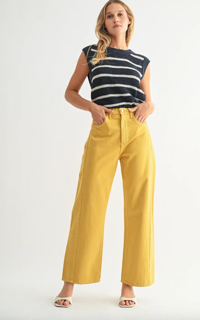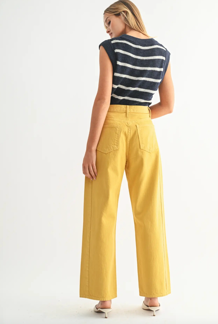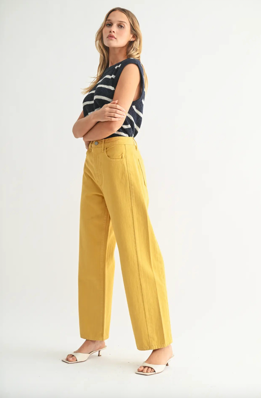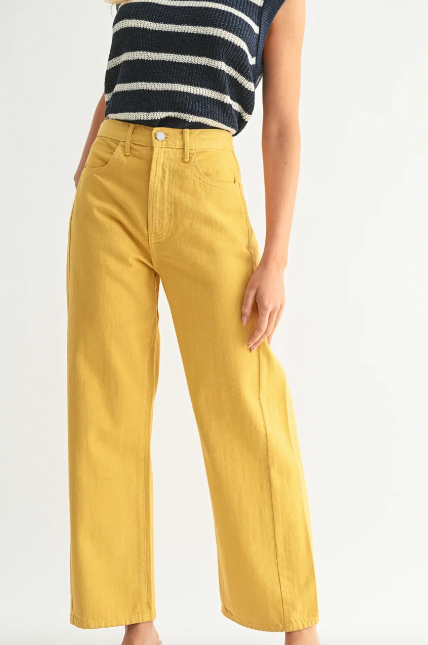 The Butter Yellow Barrel Twist Jeans are the perfect pant to transition into fall. We love the pretty shade of yellow and the fit. These jeans are just slightly barrel shape which make the most flattering fit. Pair with your favorite tee and wear on repeat.