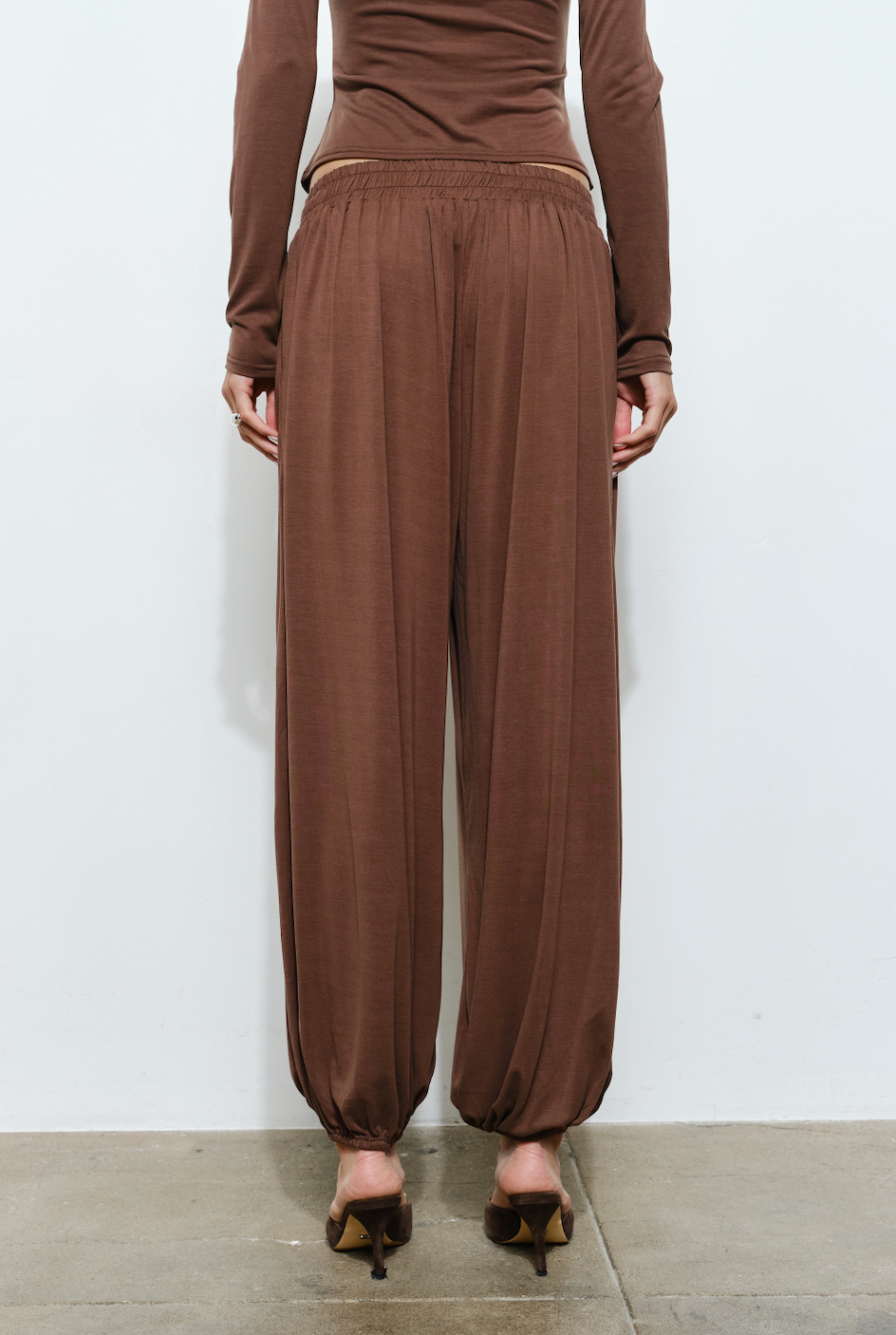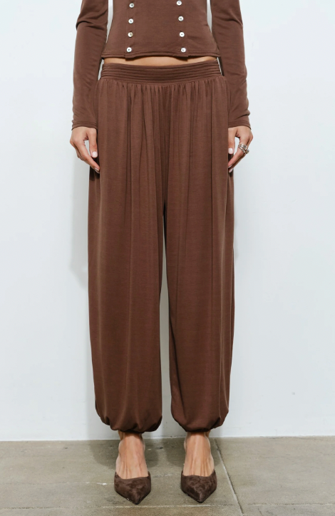 These balloon style lounge pants are super soft & lightweight, with pockets,, elastic in the back of the waistband & cinched elastic bands at the ankles.