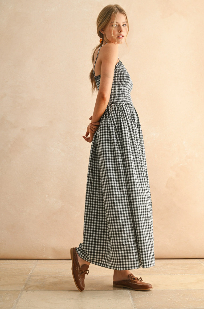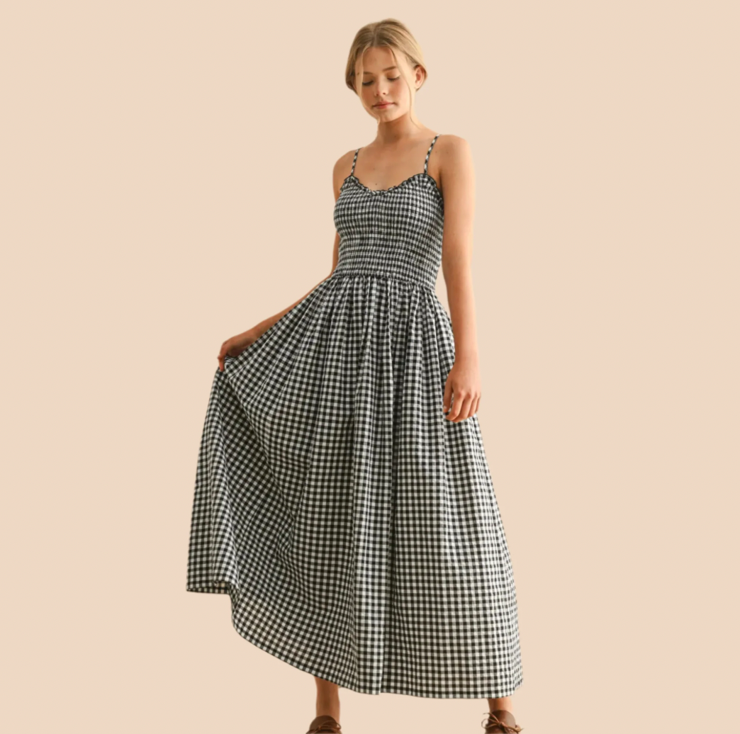 A romantic and breezy maxi dress made for sunny days. Featuring a smocked bodice with delicate ruffle trim, adjustable spaghetti straps, and a full gathered skirt in a soft gingham texture. This dress features a smocked bodice with ruffle detailing, adjustable spaghetti straps, and lightweight gingham fabric.
