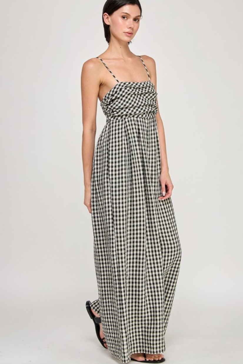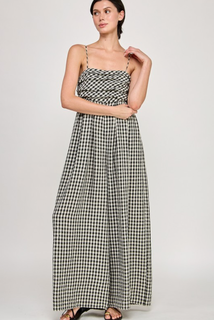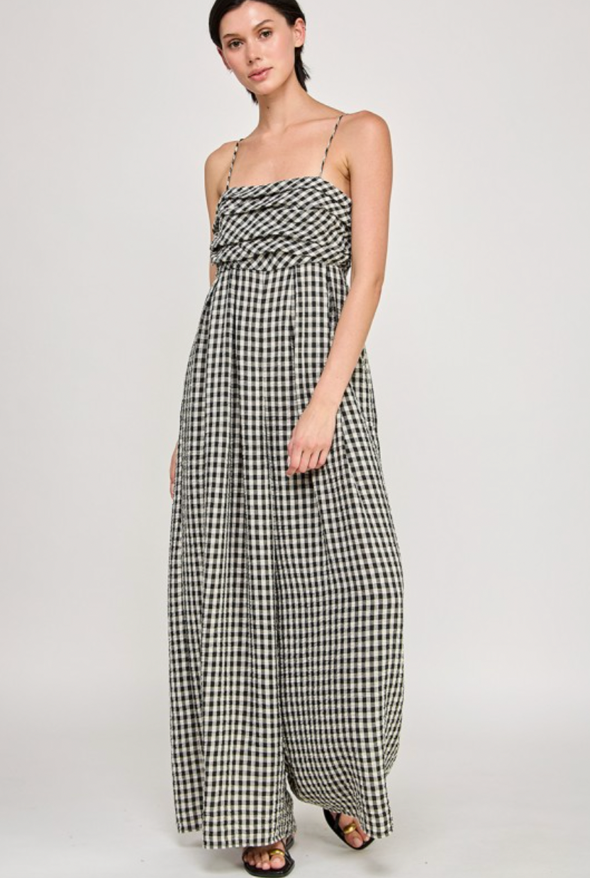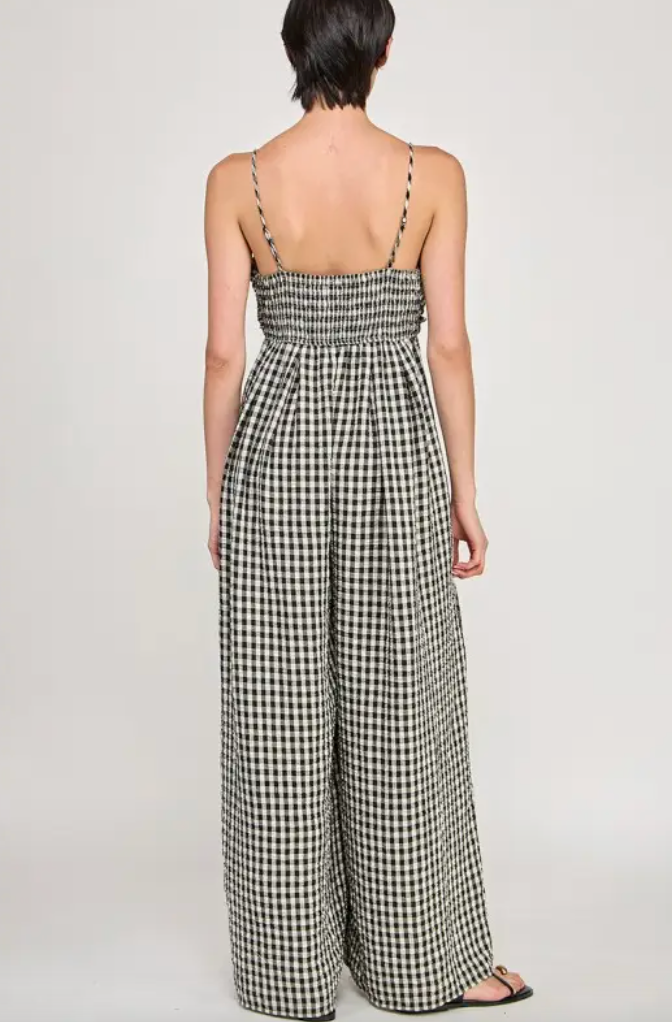 This gingham jumpsuit features a sleeveless design with adjustable shoulder straps and wide-leg pants. Side pockets and a smocked back waistband add comfort and function. Soft and breathable, perfect for everyday.