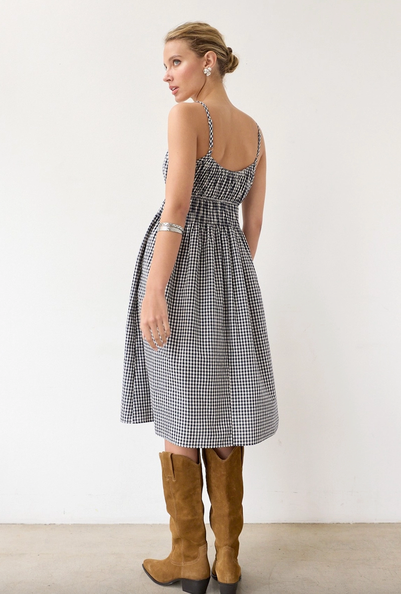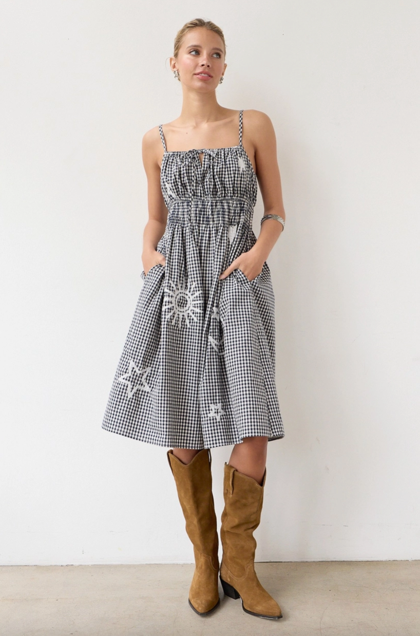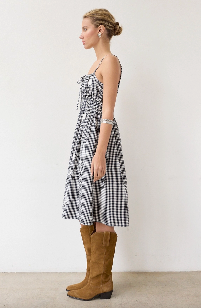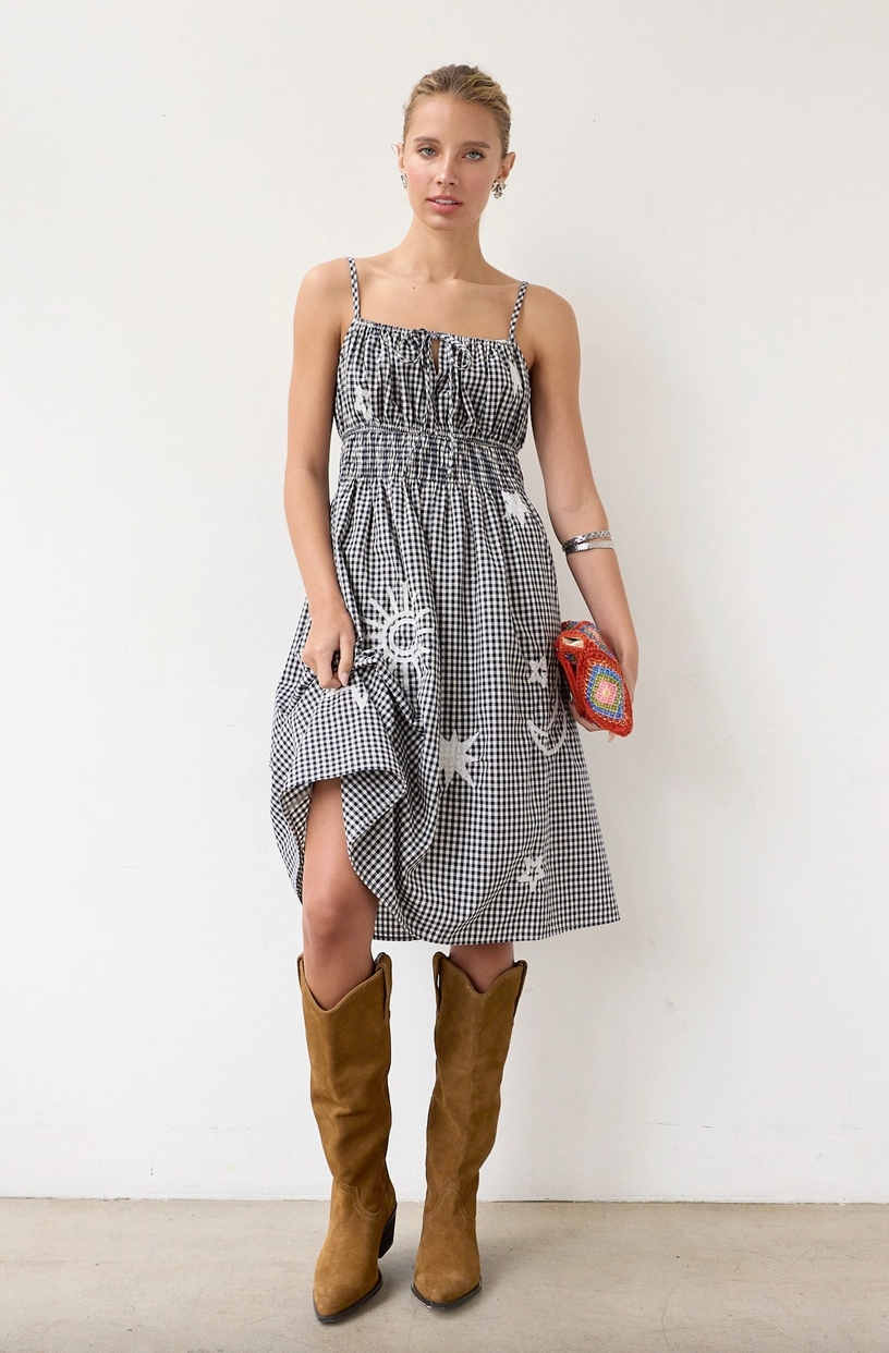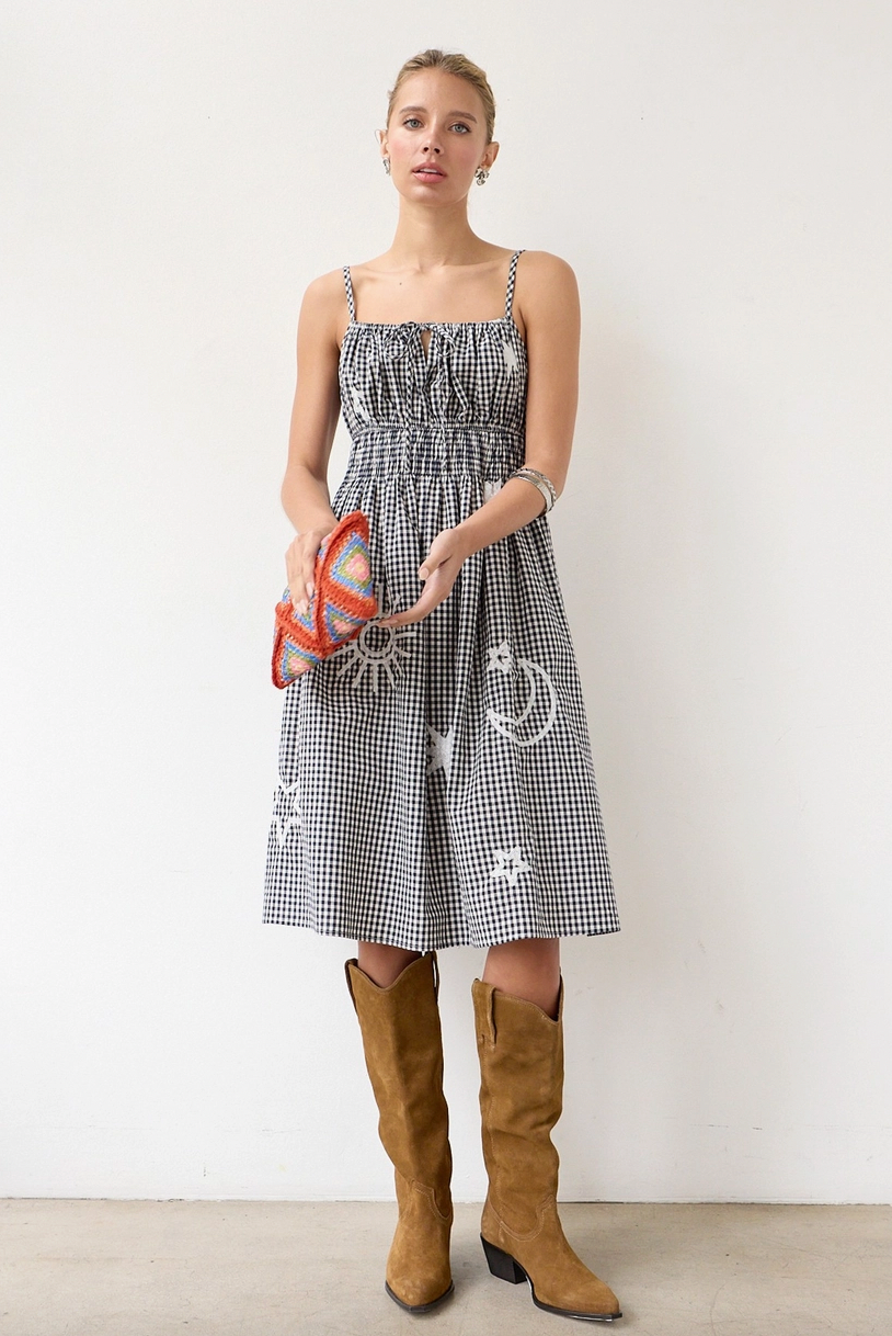 A cheerful and relaxed casual midi dress crafted from gingham fabric with embroidered detailing, inspired by a Western vibe. This dress features adjustable shoulder straps, and side pockets.