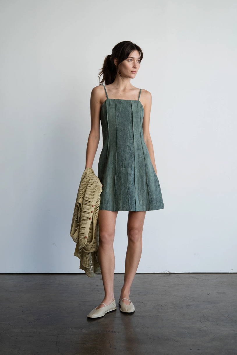 The Shelby Linen Mini Dress features a square neckline with slender adjustable straps. It has vertical seaming for a flattering, elongated silhouette . The fabric is a lightweight linen blend ideal for warm weather . It features a subtle A-line shape with a soft drape and movement. It's easy to dress up or down for effortless summer styling.