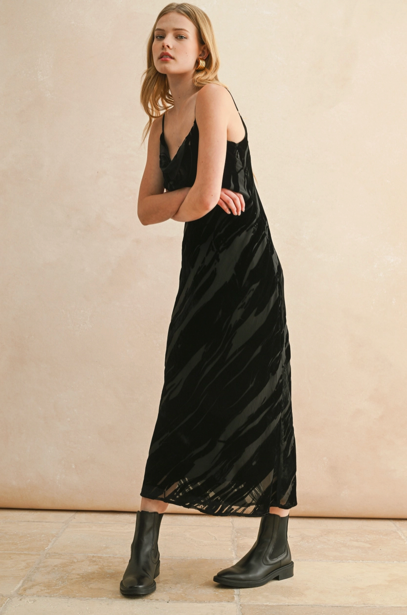 The Suede Textured Maxi Dress is perfect for a fall night out or dressy occasion. The suede/ velvet textured stripe adds a striking dimension to this piece. Dress up with a simple heel and jewelry. Pair with a chunky boot and cardigan for a cool edgy vibe.