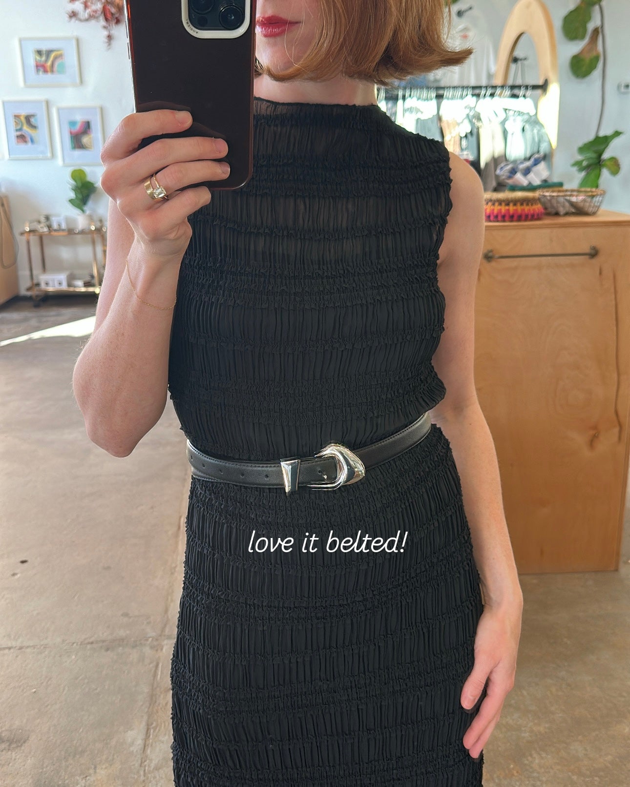 The Mindy Dress is a sleeveless maxi crafted from smocked, sheer textured crepe with a relaxed, flowing silhouette that's layered over a separate inner lining. Featuring a mock neck, invisible side zipper, and a subtle left-side slit.
