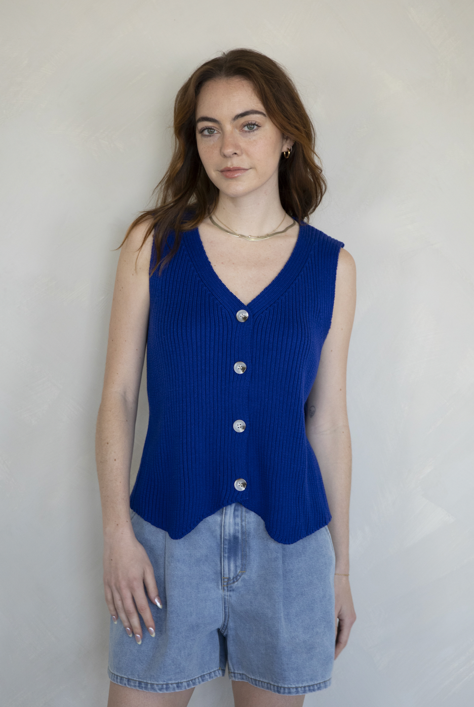 An easy to wear knitted sweater vest with tortoiseshell buttons. Pair this top with cut offs for end of summer. Layer it over a button down and pair with jeans for a cute fall look.