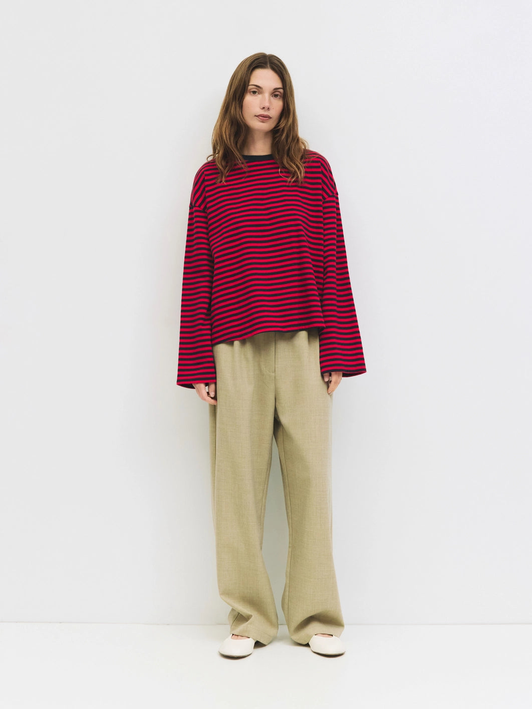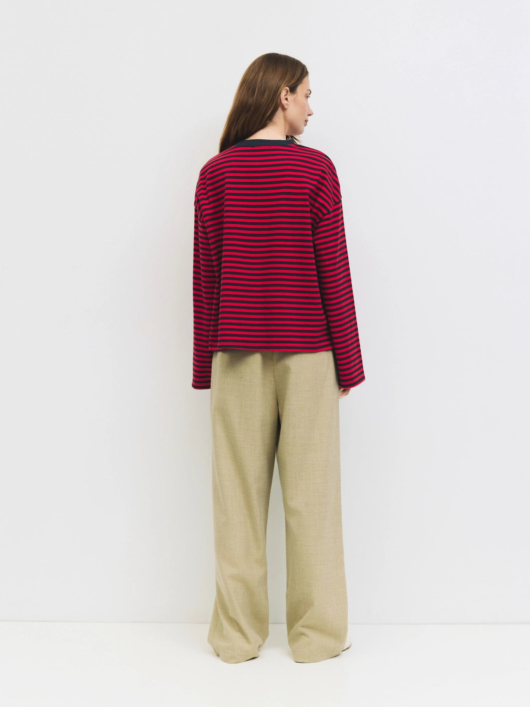 The Callahan Top is a relaxed-fit long-sleeved tee made from midweight striped fabric. It features a solid color crewneck and drop shoulders for a casual, comfortable look. A versatile essential for layering or wearing on its own.