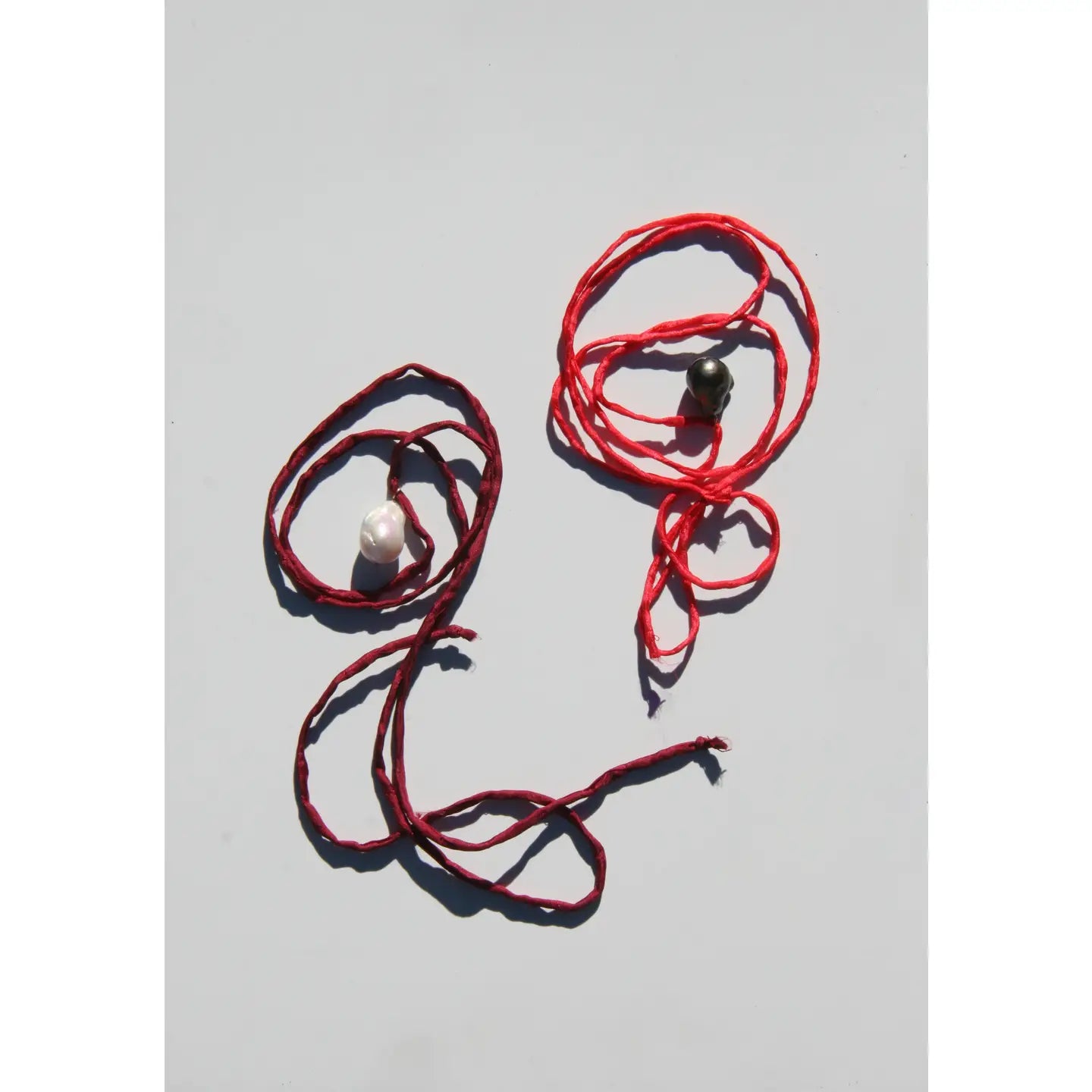 - Available in coral red with an oil-slick black baroque pearl or merlot silk with a white pearl