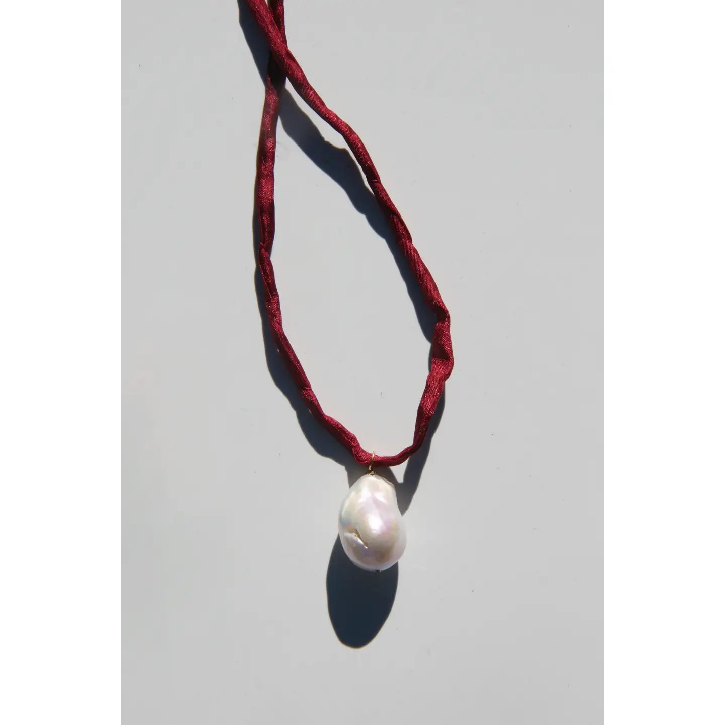The Bea Necklace is a genuine baroque pearl necklace suspended on a long hand-sewn silk cord.