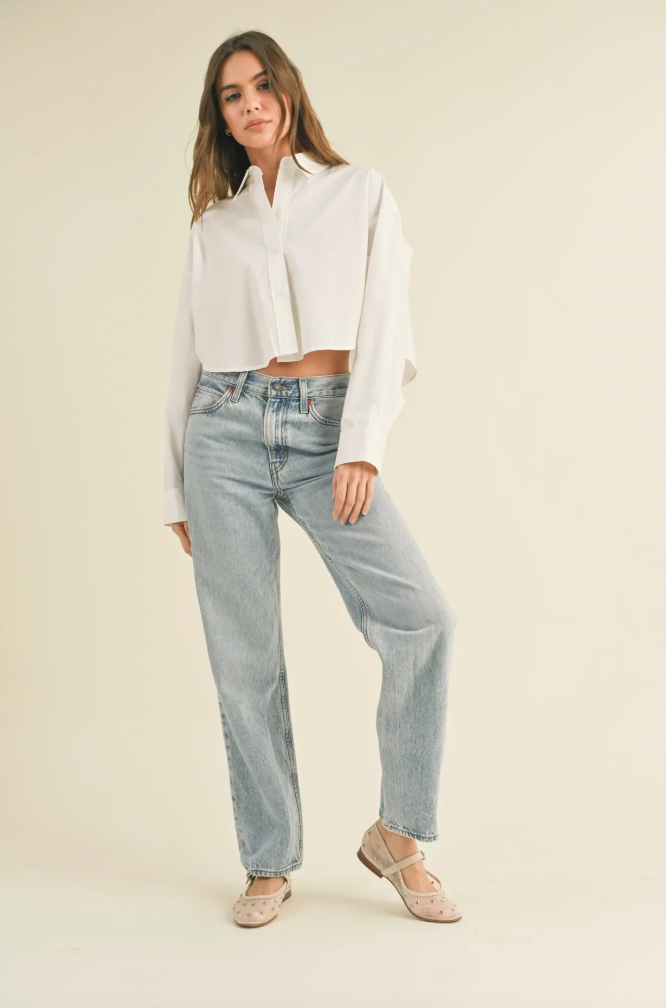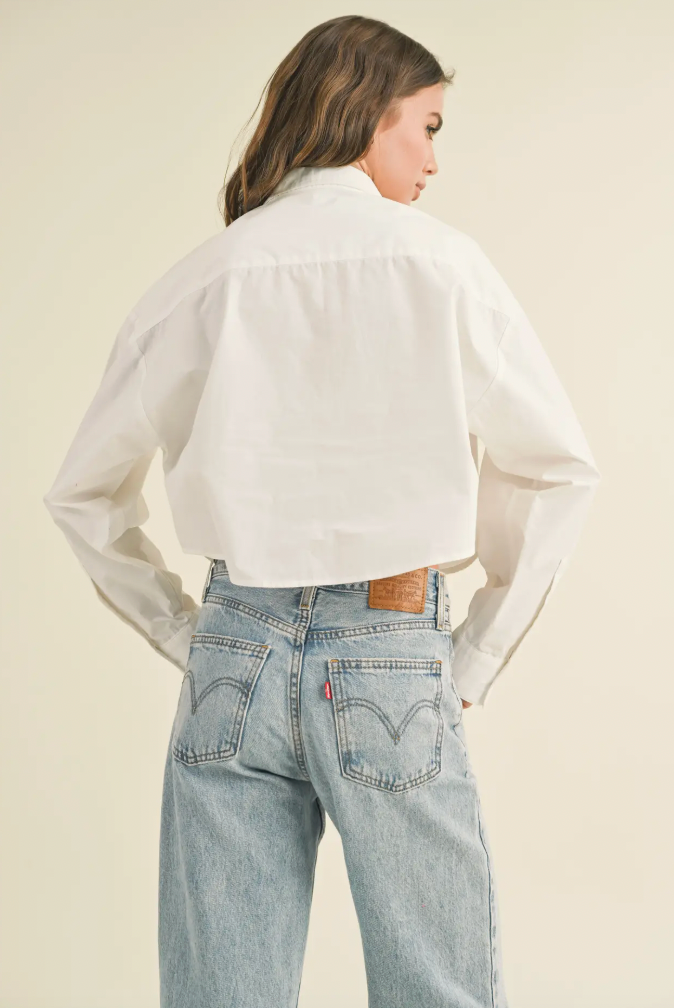 The Cara Cropped Button down is a spin on a classic fit. Everyone needs a crisp white button down. This one is cropped which makes for a flattering fit. Pair alone with denim or layer under a sweater vest.