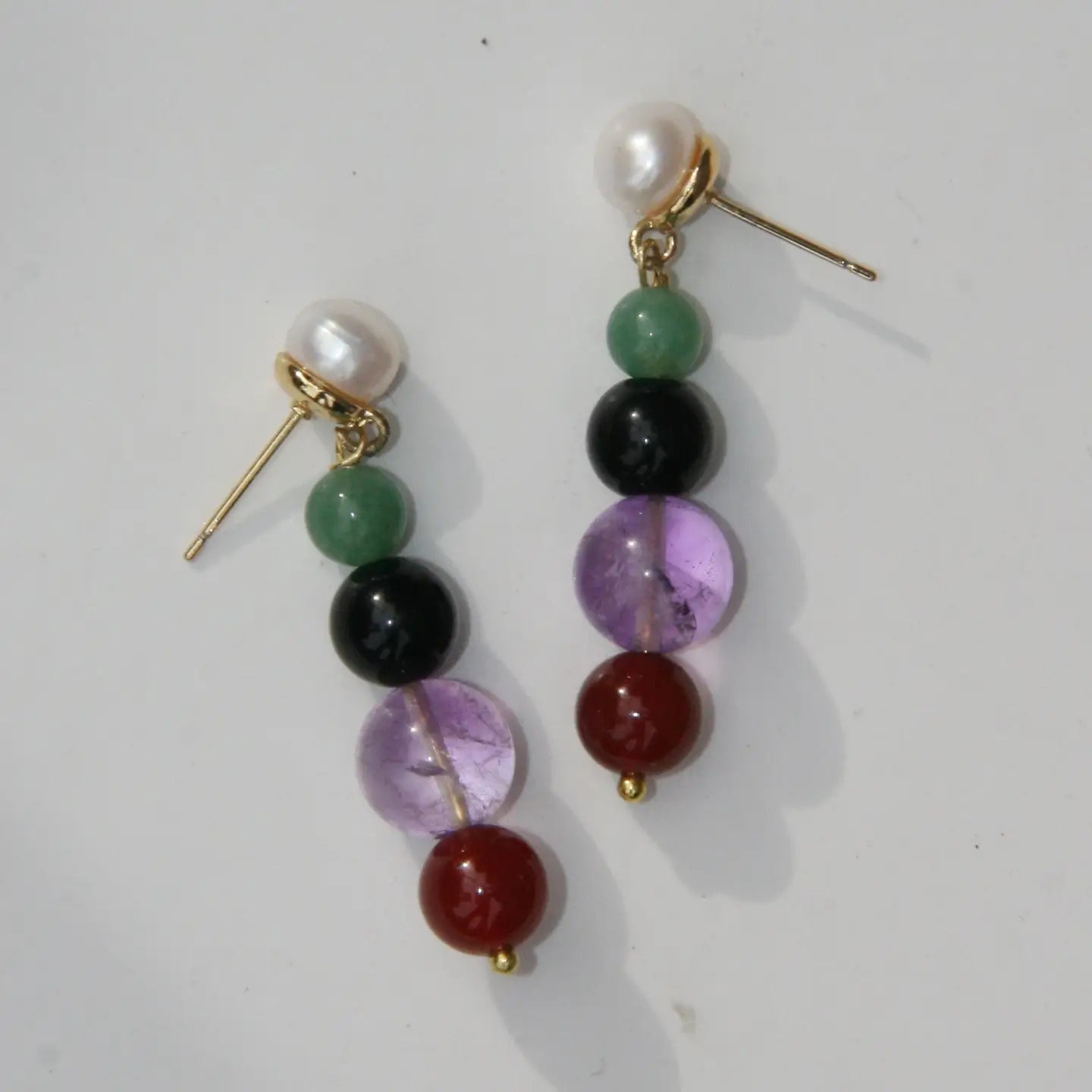 - Amethyst, agate, carnelian, aventurine, pearl; 1.5 in drop; 8mm stud
