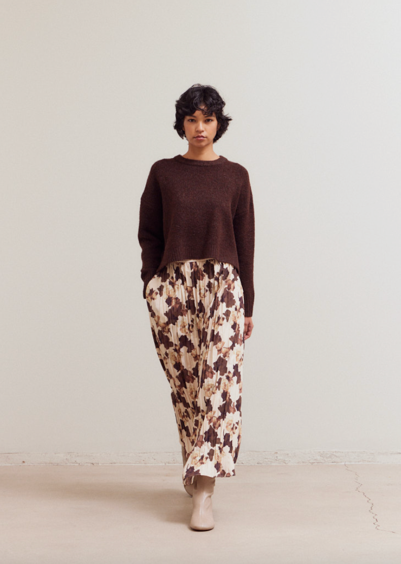 The Carly Pleated Midi Skirt is a must have this season. We love the silky, pleated material and fall floral print. Pair with a sweater and boots for a polished fall look.