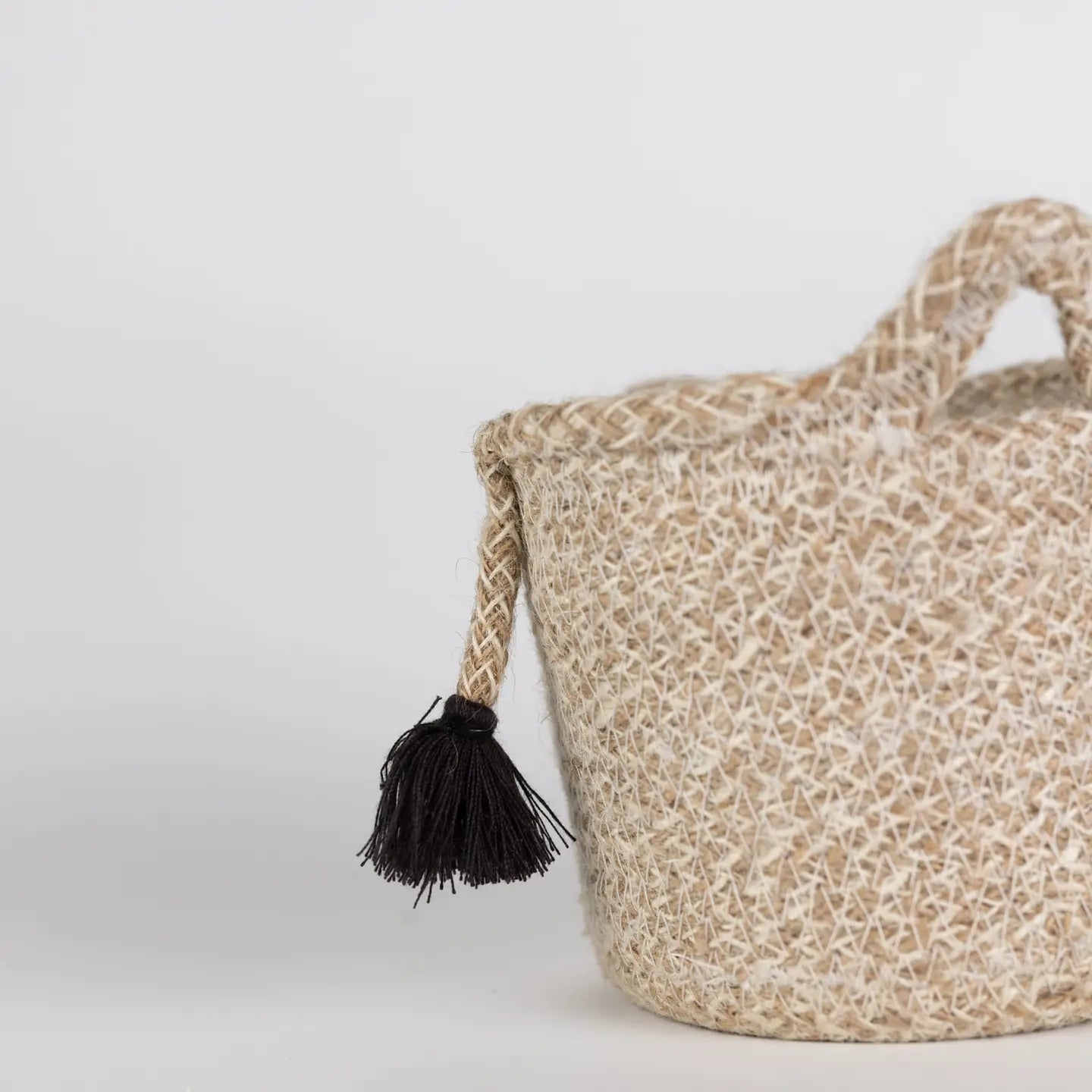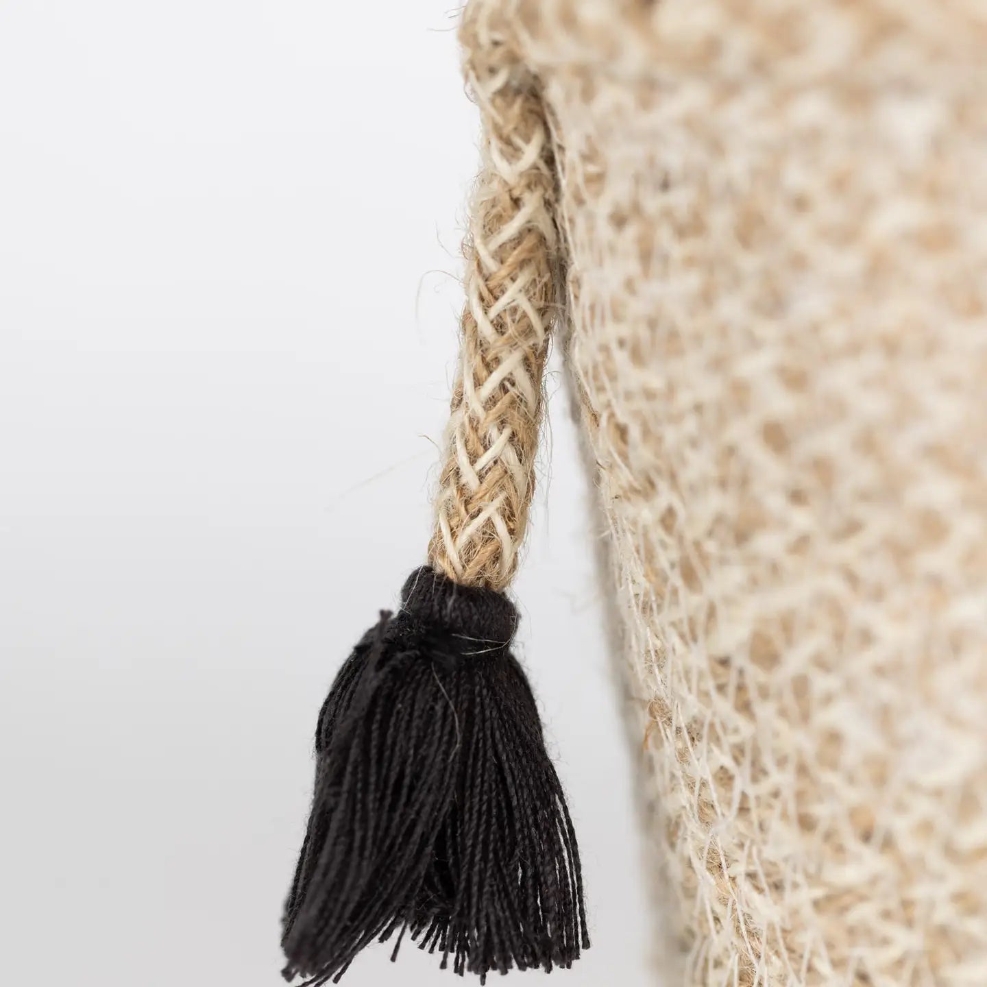 Materials: 100% jute - Care: Dust clean - Notes: Due to its handmade nature, sizes vary slightly - Measures: 5"D x 5.75"H - Colors: Tan, black