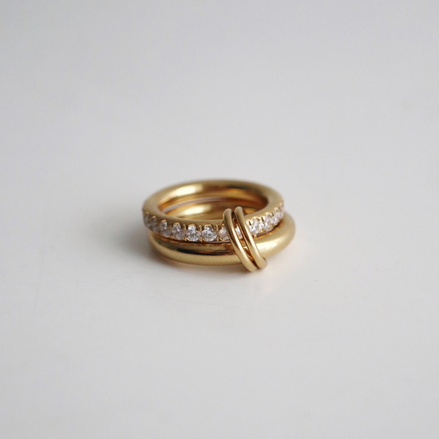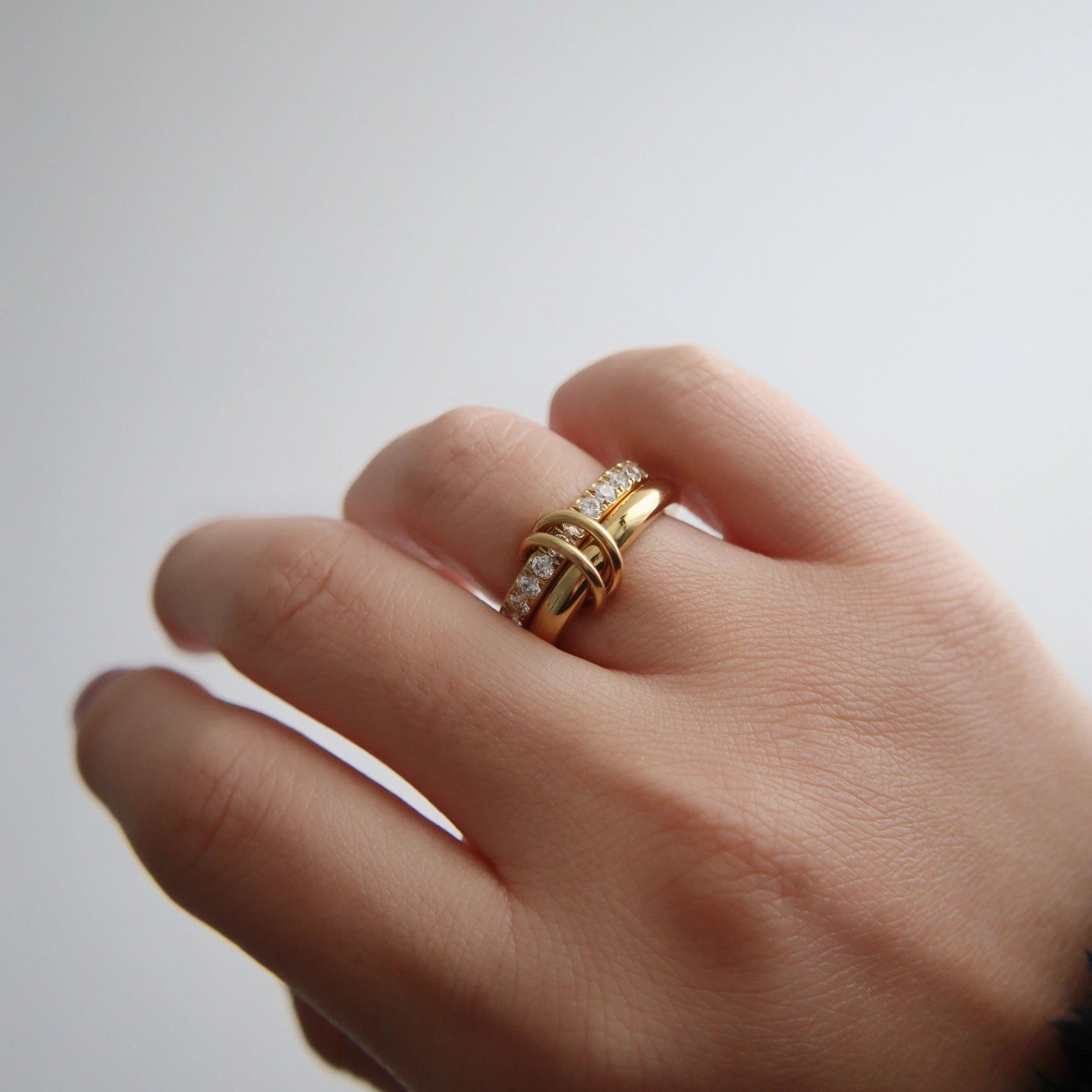 The Cecilia Ring features two linked bands, one band is sleek and smooth while the other is adorned with a row of sparkling cubic zirconia stones. Perfect for making a glamour statement, this piece balances luxury with a contemporary edge, ideal for a night out or special occasions.