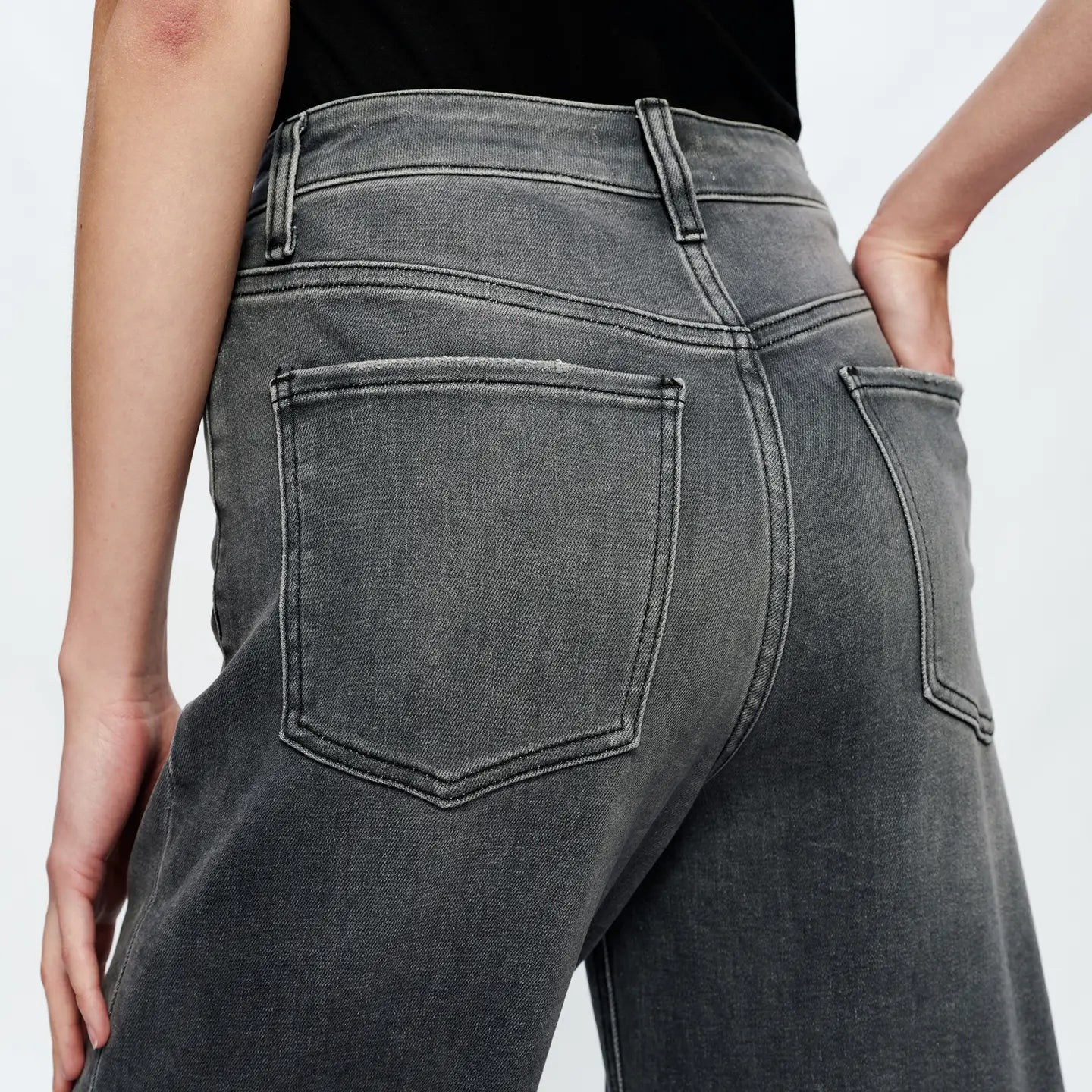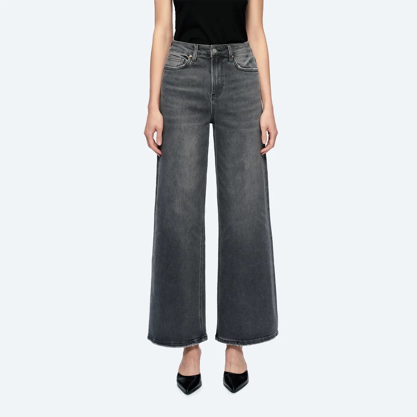 Five pockets, high rise waist, zipper fly, natural washing effect, whisker effect, finished hem, denim jeans